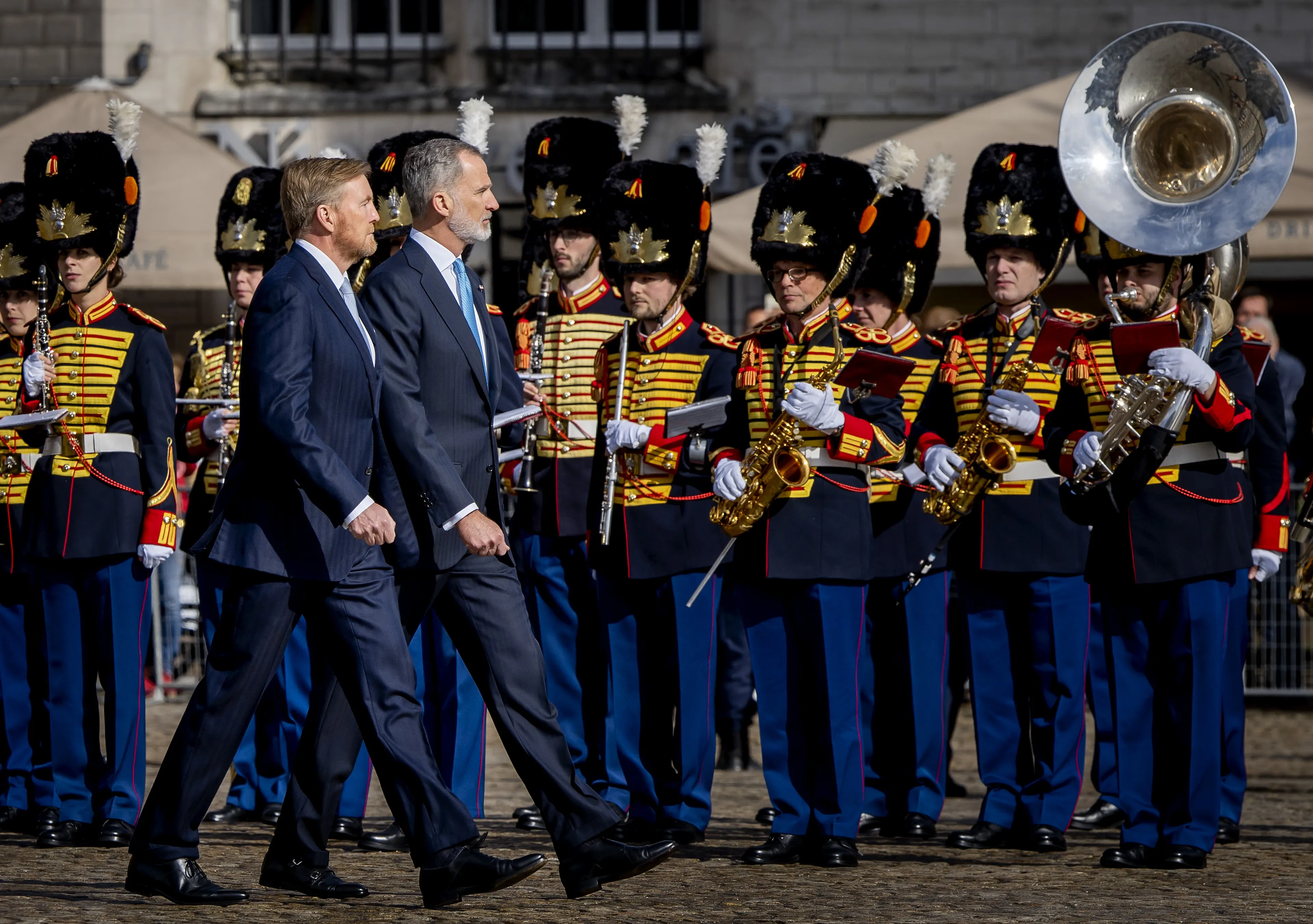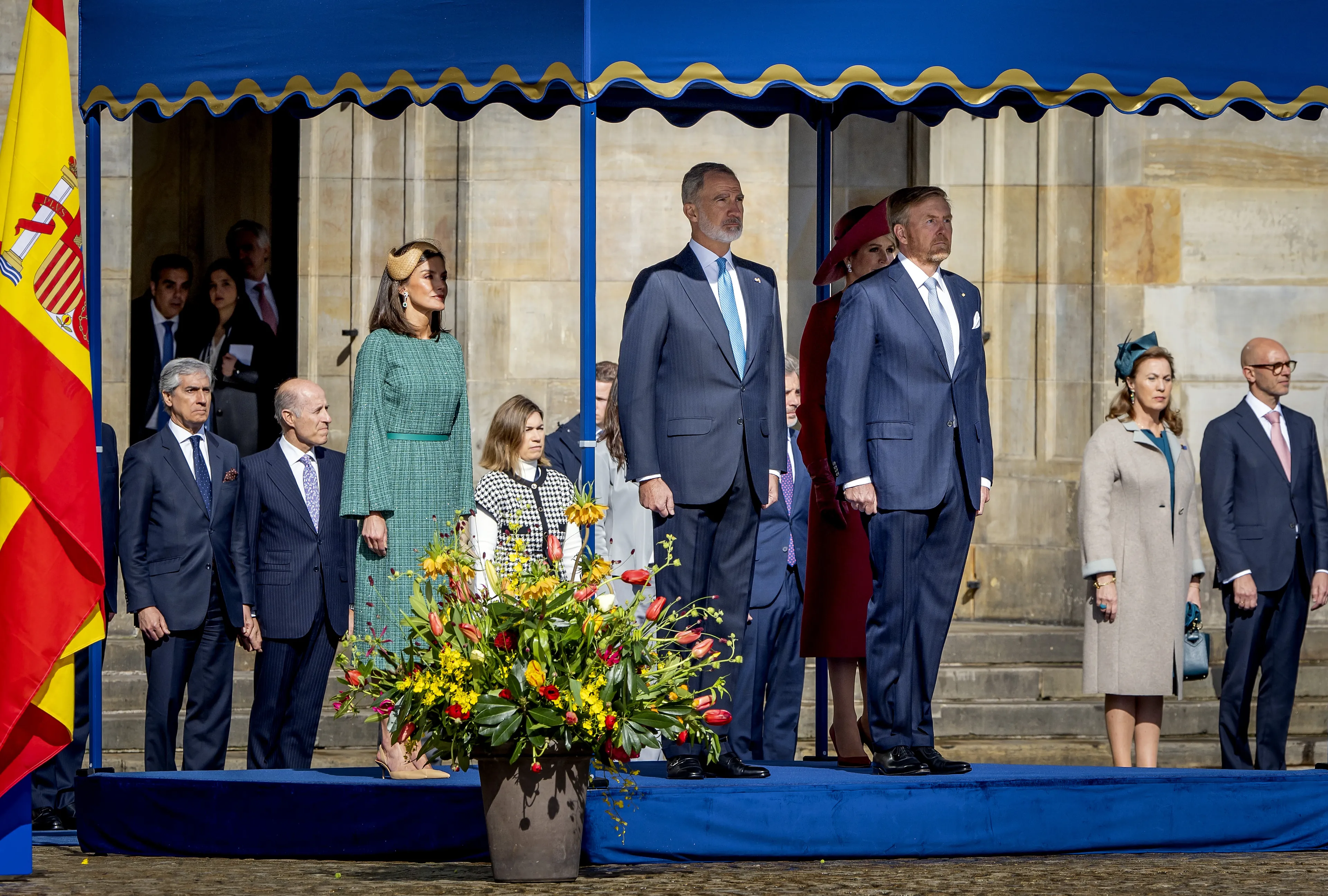 Koning Willem-Alexander en koningin Máxima heten de Spaanse koning en koningin vanochtend officieel welkom. Nadat de delegaties zijn voorgesteld, speelt de Koninklijke Militaire Kapel Johan Willem Friso de volksliederen van beide landen. Aansluitend vindt de inspectie van de erewacht plaats.