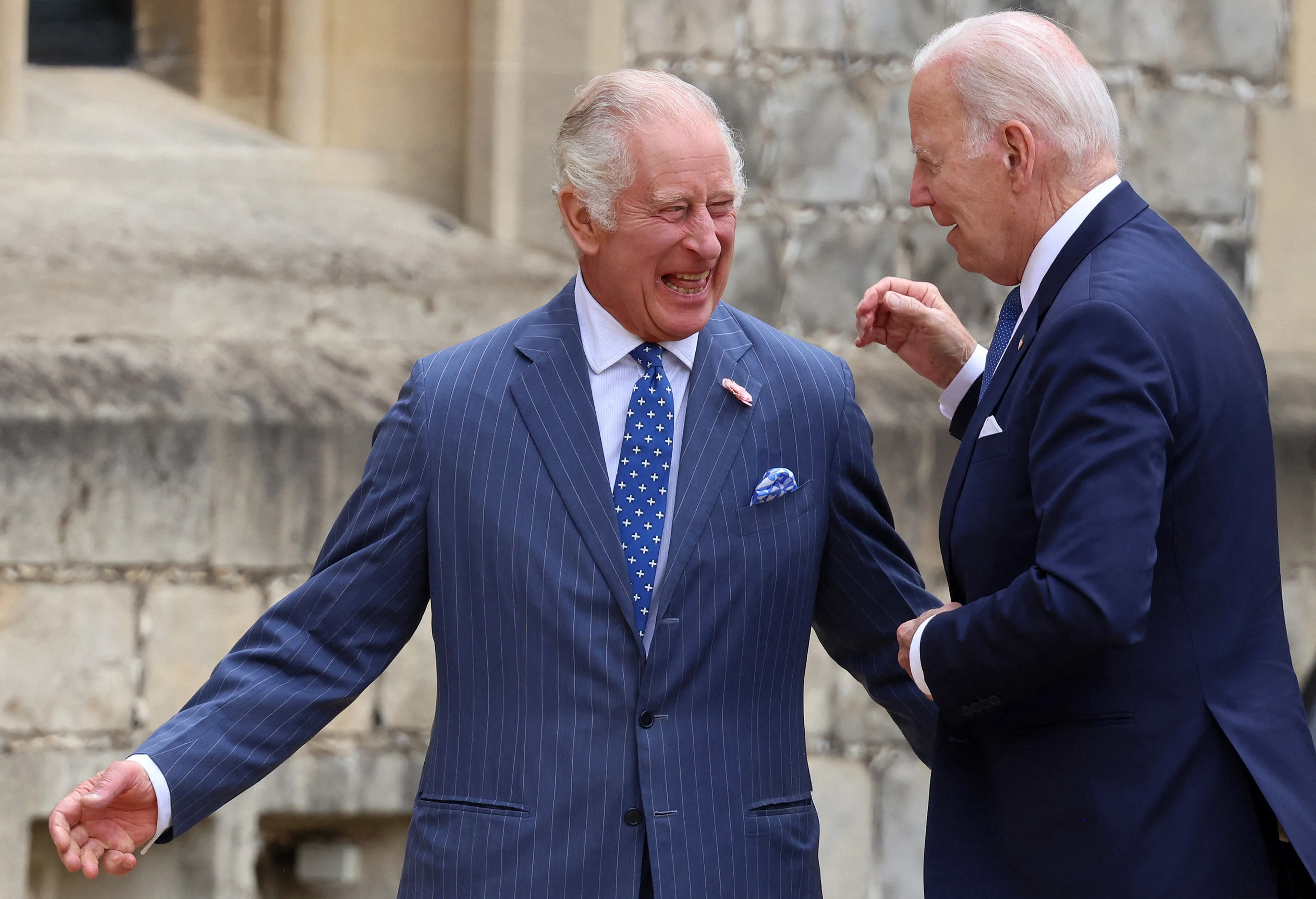 Biden werd maandag door Charles welkom geheten op de binnenplaats van Windsor Castle. Daar werd het Amerikaanse volkslied gespeeld en inspecteerden Biden en Charles de erewacht. Aansluitend gingen zij naar binnen waar ze samen thee dronken en toonde Charles een aantal voorwerpen uit de koninklijke collectie die te maken hadden met de Verenigde Staten.