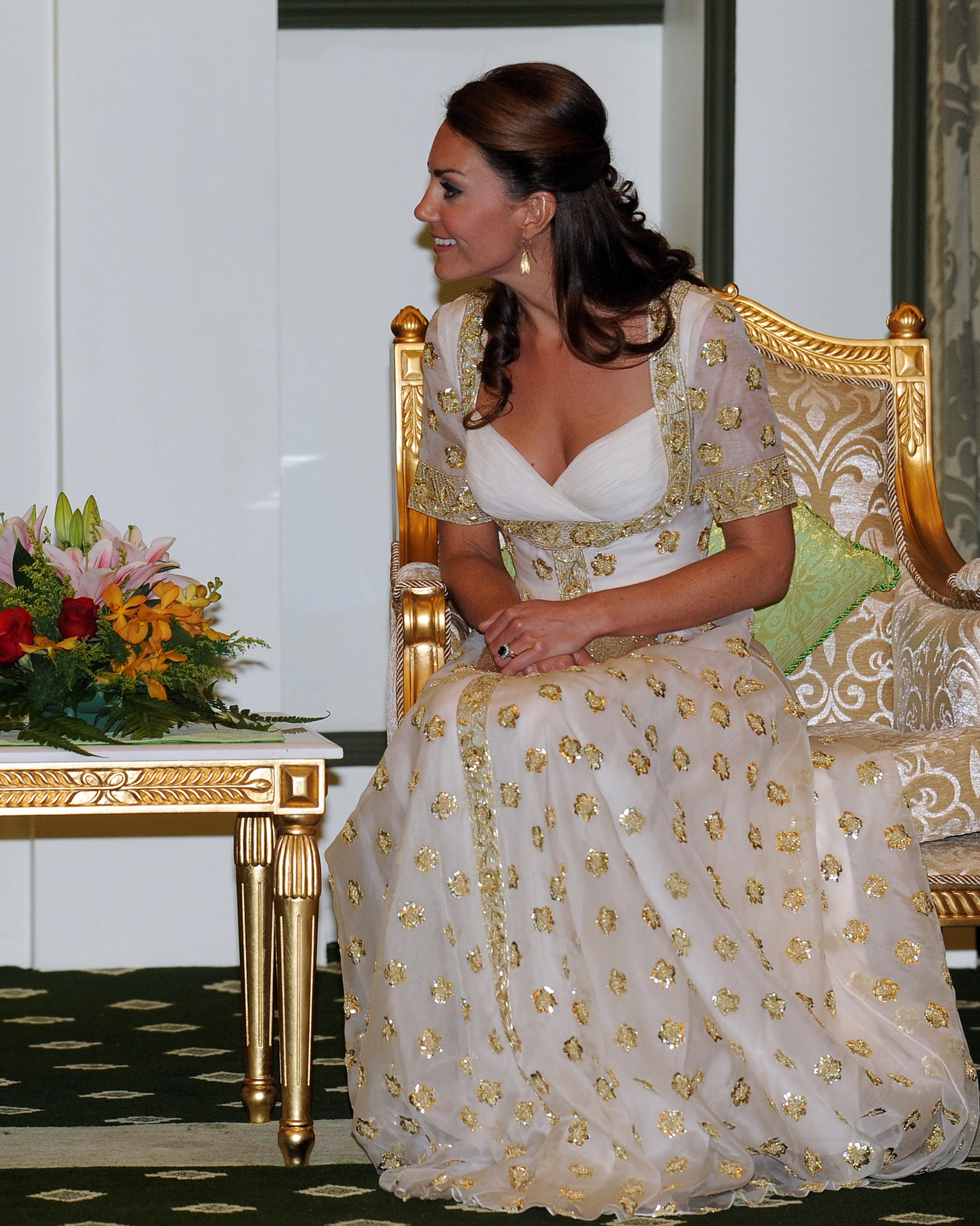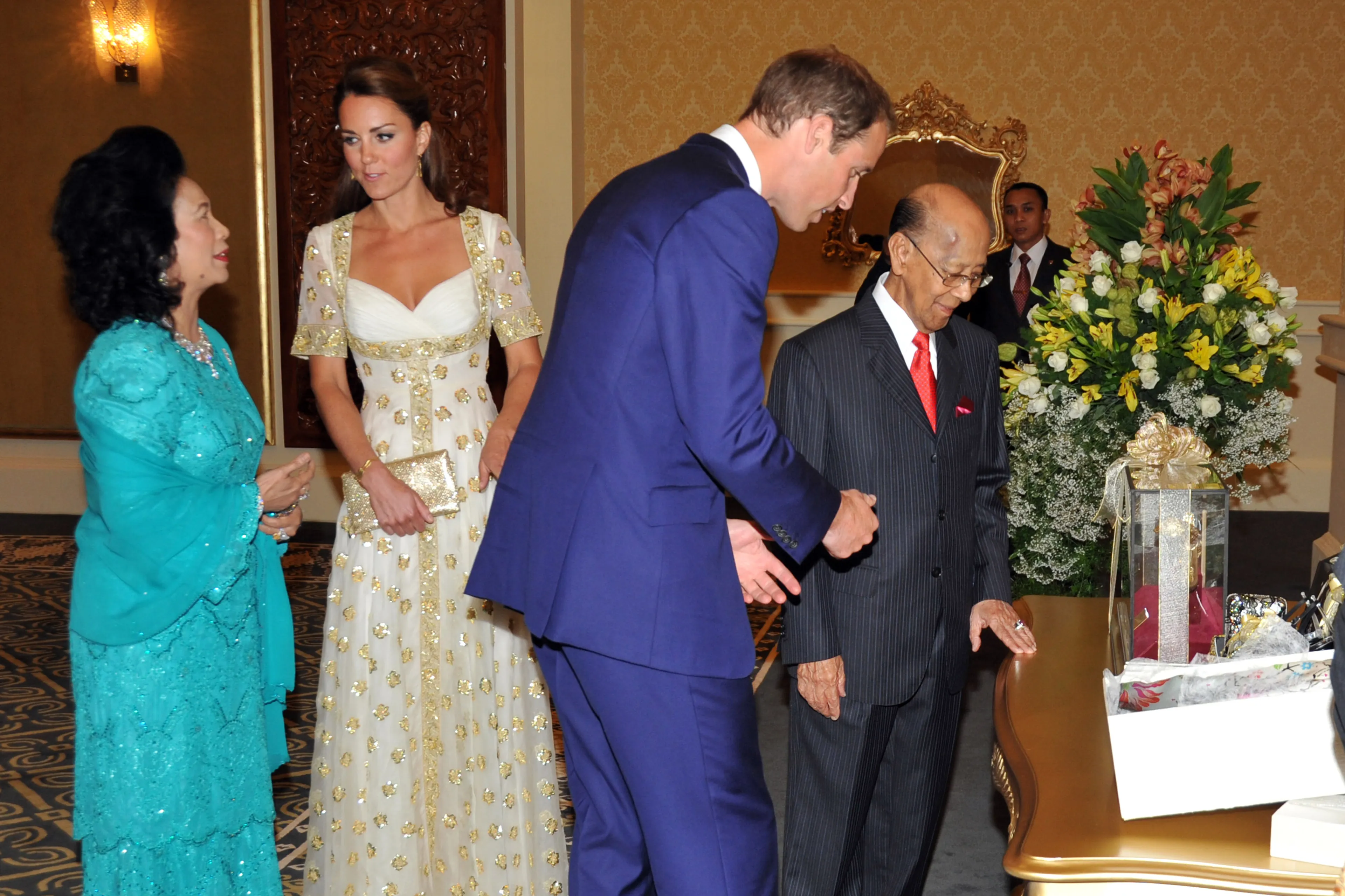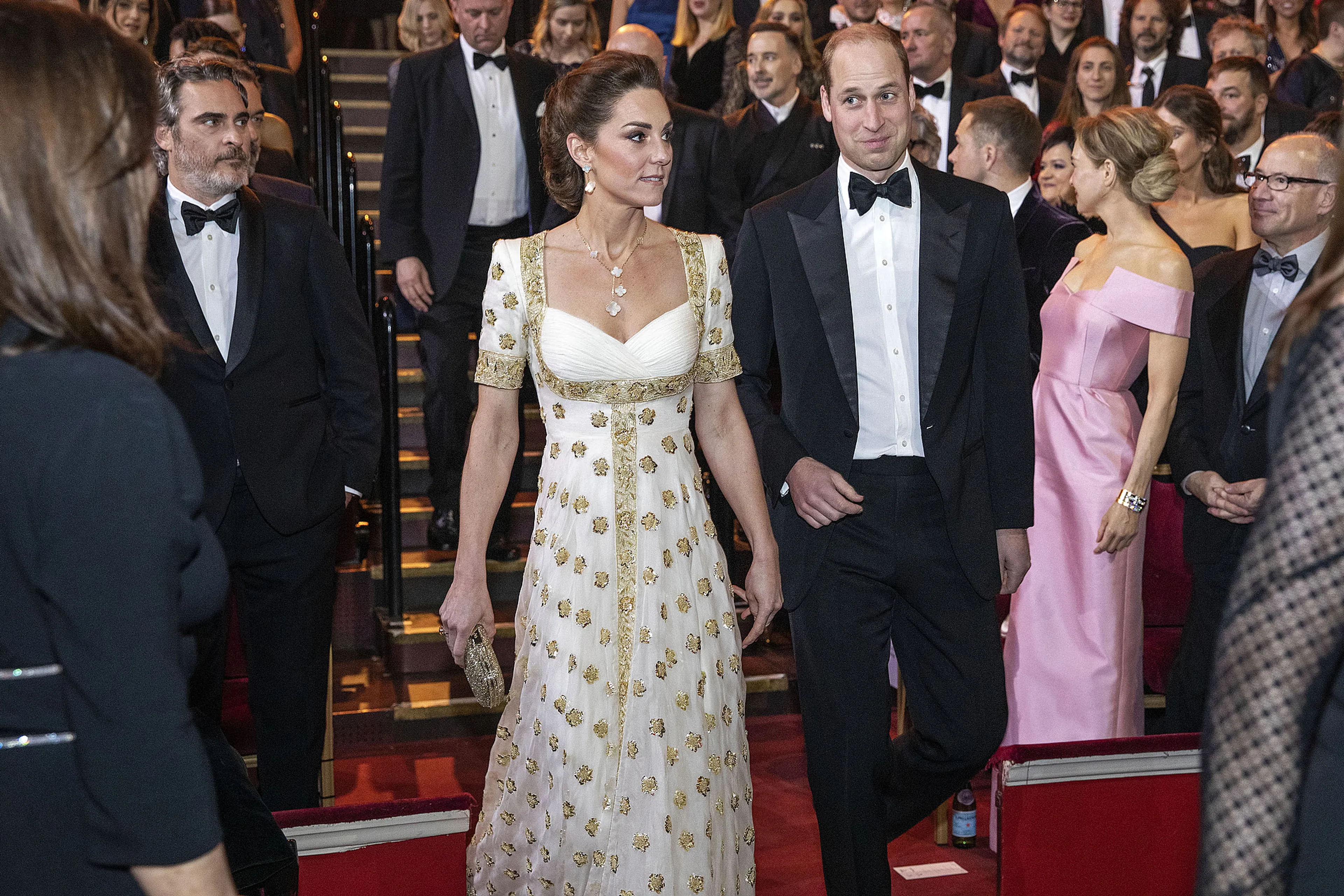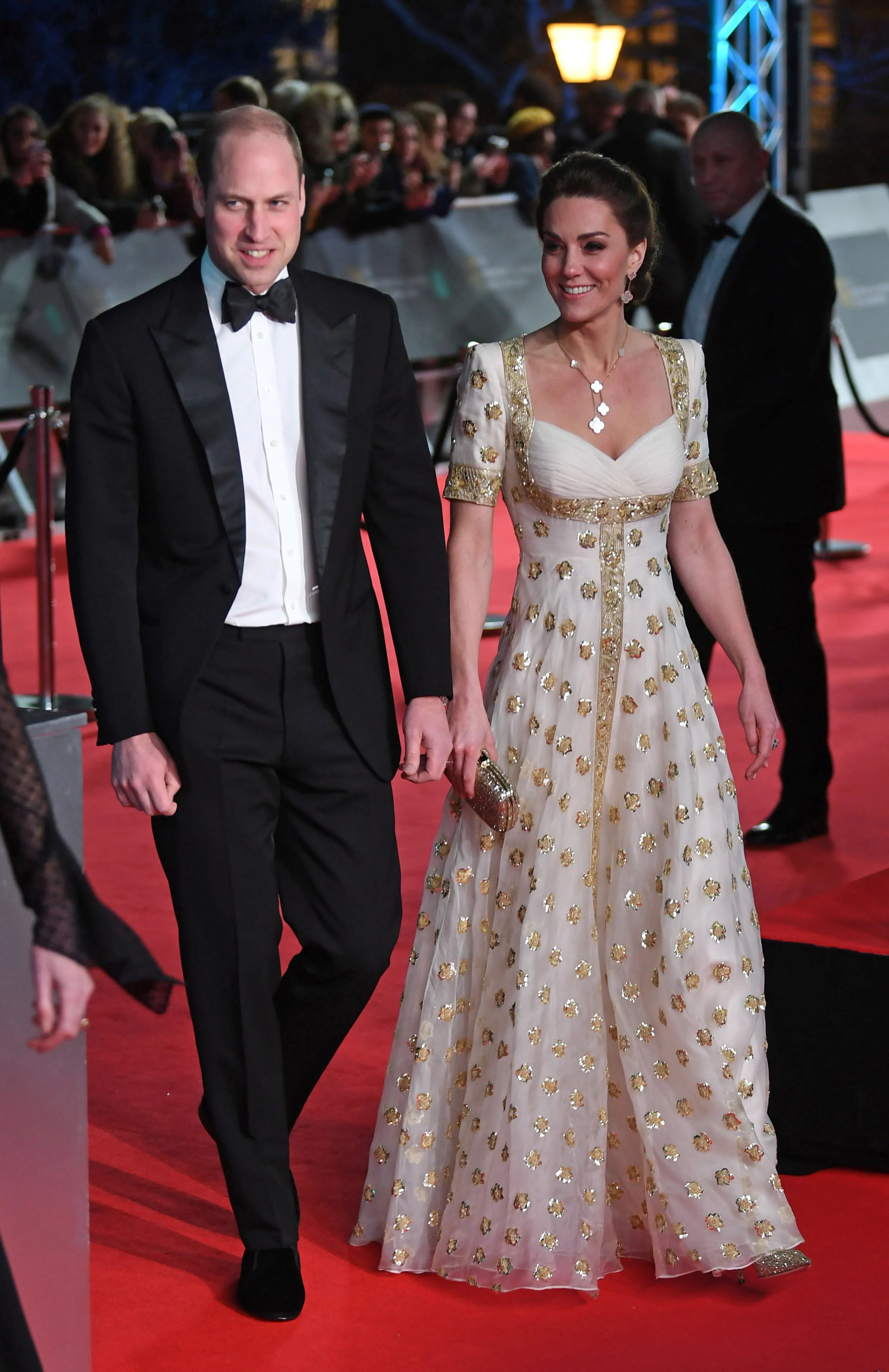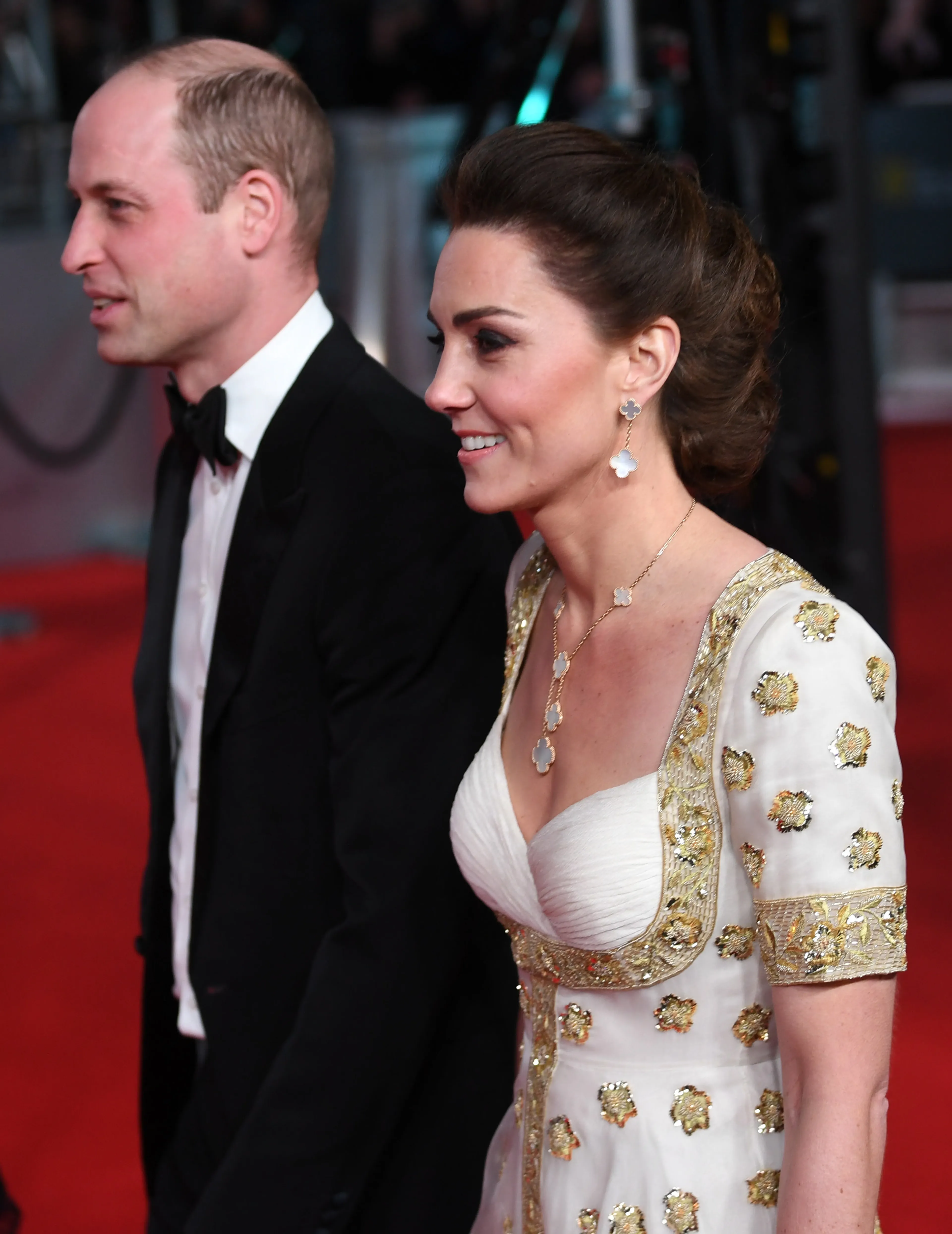 William had zijn beste pak uit de kast gehaald en droeg daar een zwarte vlinderdas bij. De hertogin van Cambridge verscheen op de rode loper in een witte jurk met gouden versieringen.