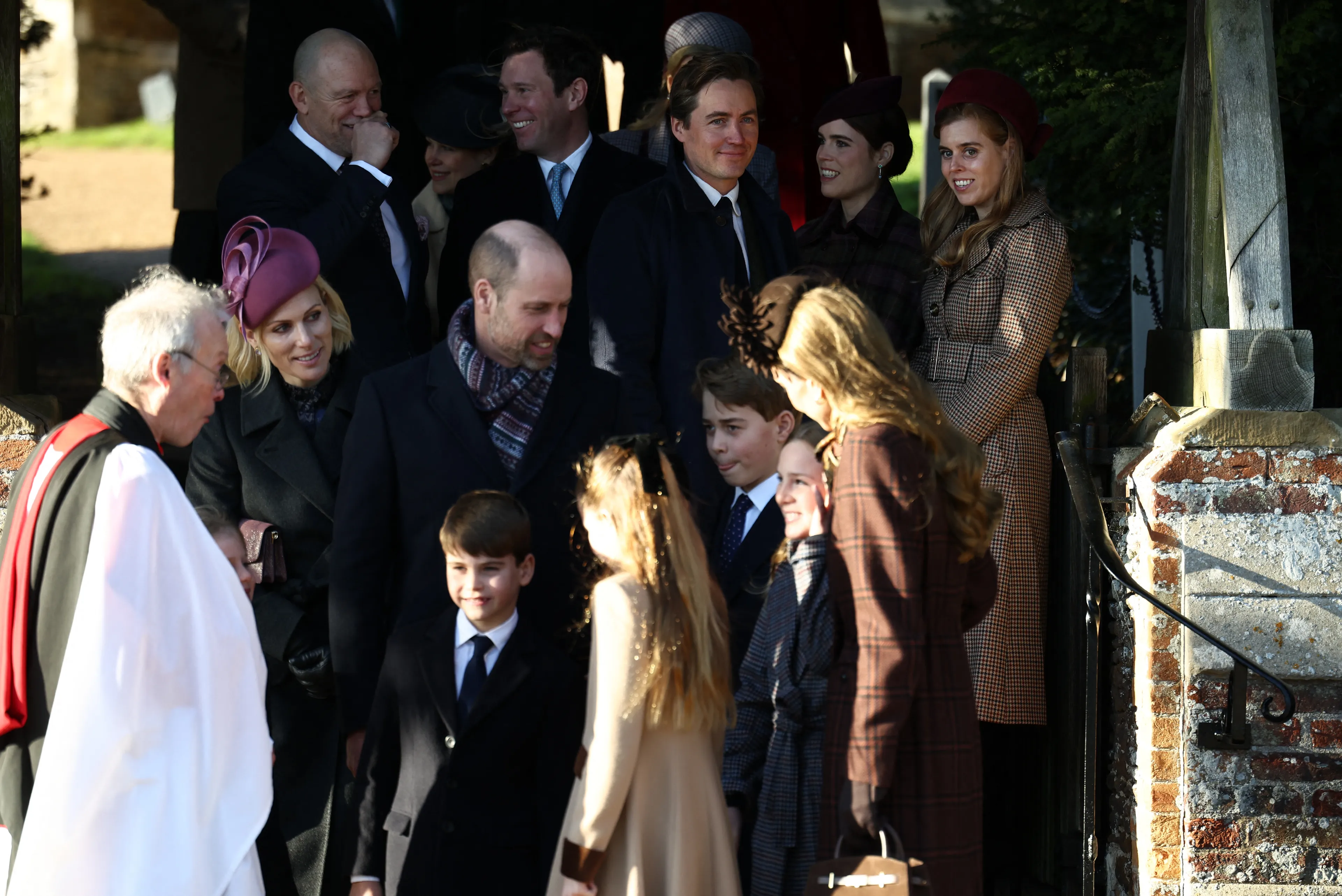 Op de zonnige kerstochtend arriveert de Britse koninklijke familie bij de St. Mary Magdalene kerk op het landgoed Sandringham, waar de Windsors traditiegetrouw de feestdagen doorbrengen. Koning en Charles en koningin Camilla lopen voorop, gevolgd door de rest van de familie. Zo zijn prinses Anne en haar man Timothy Laurence erbij, net als dochter Zara Phillips en Mike Tindall en hun kinderen. Ondanks dat Andrew niet welkom is, zijn zijn dochters er wel bij. Prinses Beatrice is samen met haar man Edoardo Mapelli Mozzi en prinses Eugenie loopt met haar man Jack Brooksbank aan haar zijde. Eugenie draagt vandaag een warme wollen capejas van BYAN. Ook het gezin van de hertog en hertogin van Edinburgh is compleet, want lady Louise en James zijn er ook bij.
