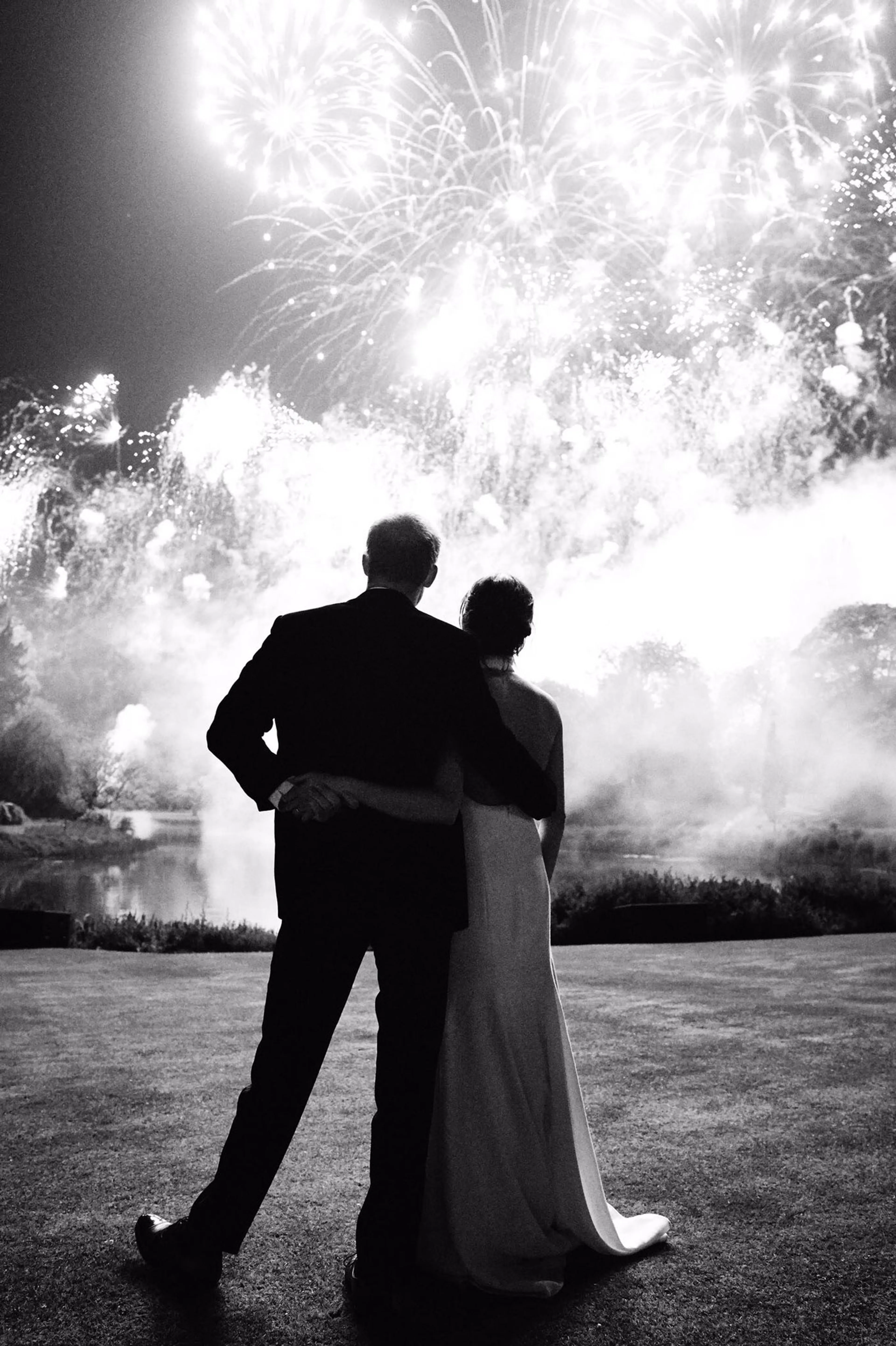 Prins Harry zette een nieuwe foto van zijn huwelijk met Meghan online, waarop de twee na de receptie in Frogmore House naar het vuurwerk staan te kijken. Het romantische kiekje is gemaakt door fotograaf Chris Allerton.
