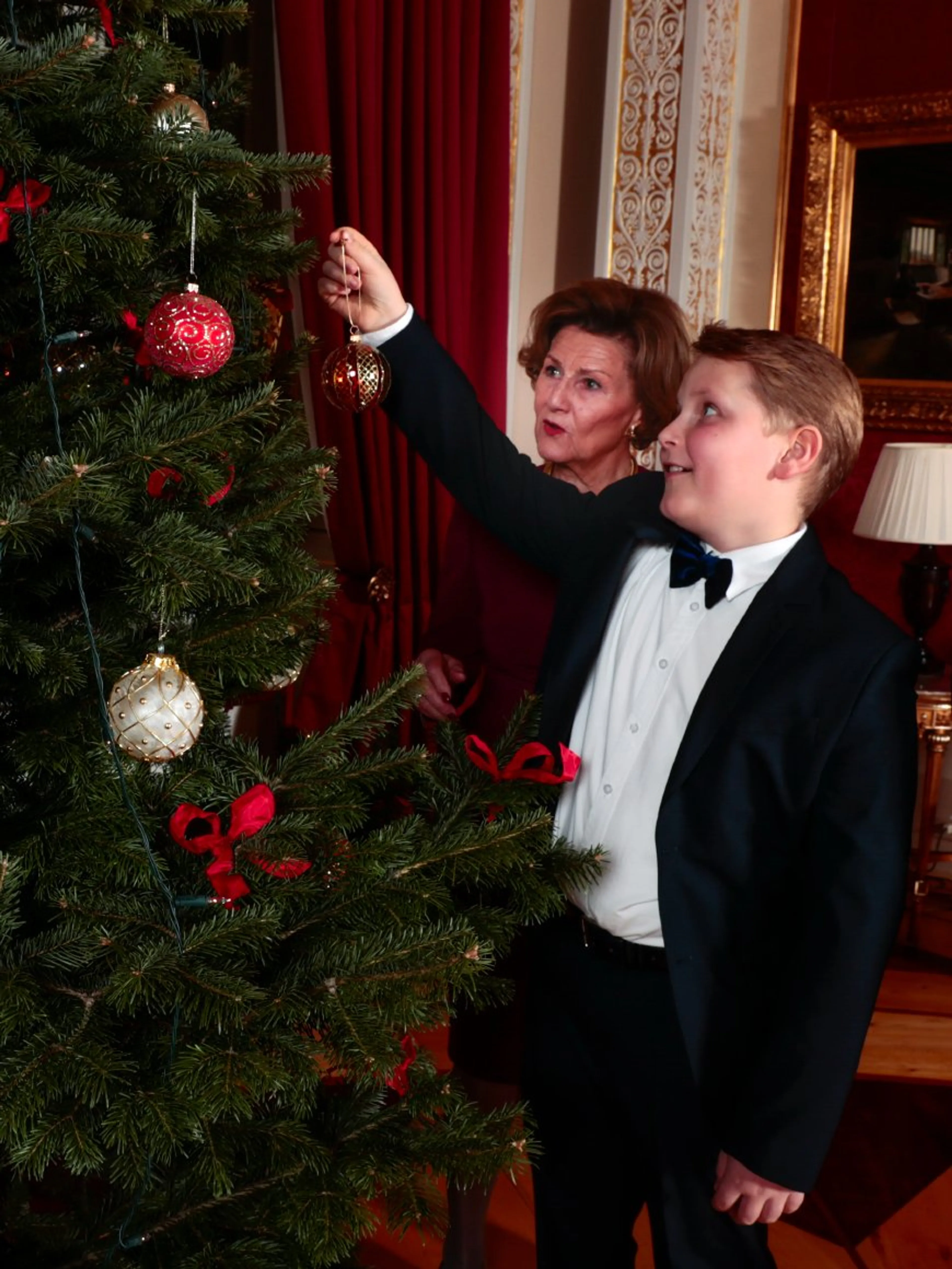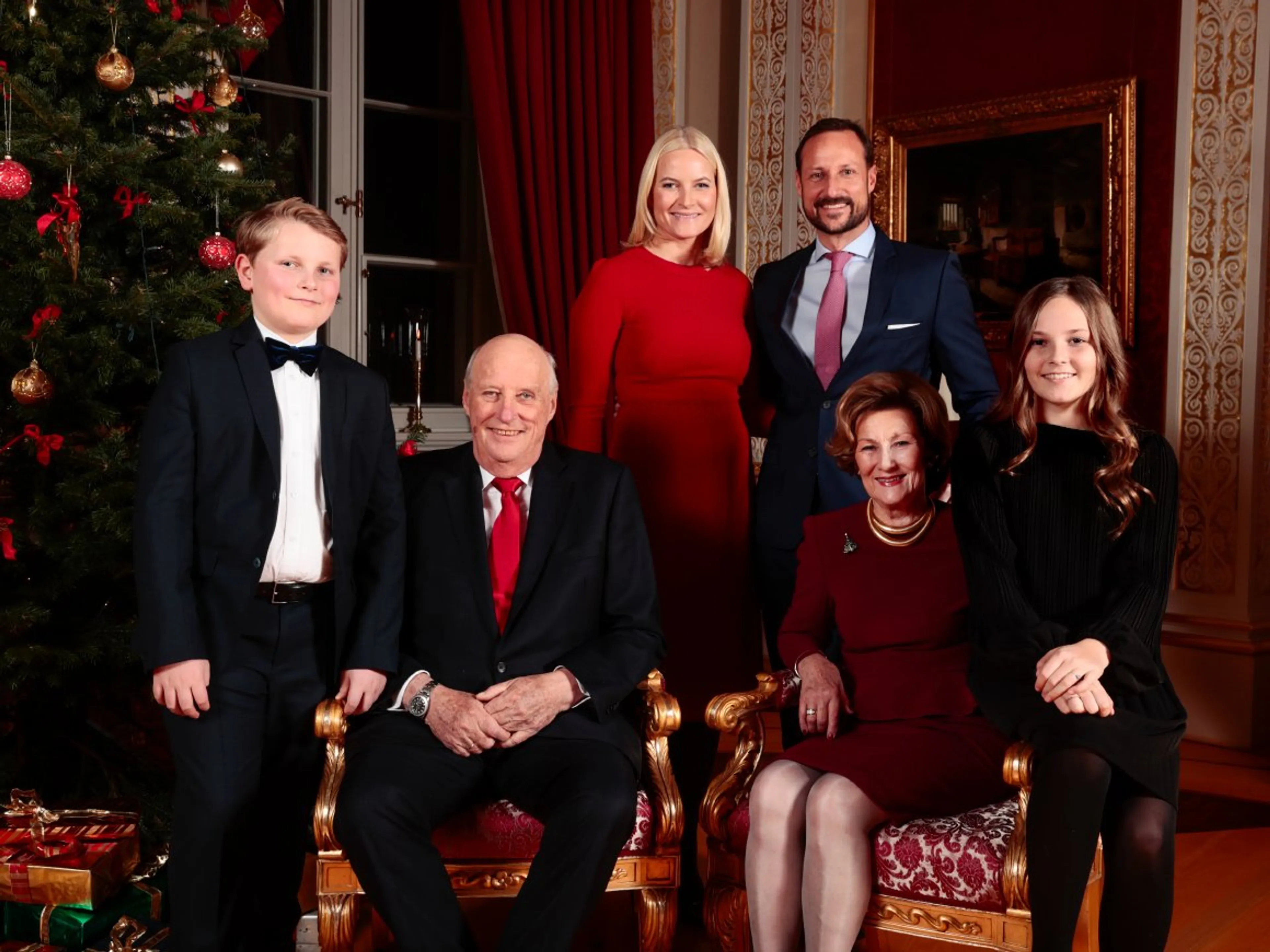 Het koninklijk paar en de familie van de kroonprins verzamelden zich bij de kerstboom voor een kerstshoot. Er zijn verschillende kerstbomen in het kasteel, maar volgens het Noorse hof is de boom in de Rode Salon één van de mooiste. Ook prinses Ingrid Alexandra (13) en prins Sverre Magnus (12), de kinderen van Haakon en Mette-Marit, hielpen om de kerstboom nog feestelijker te maken.