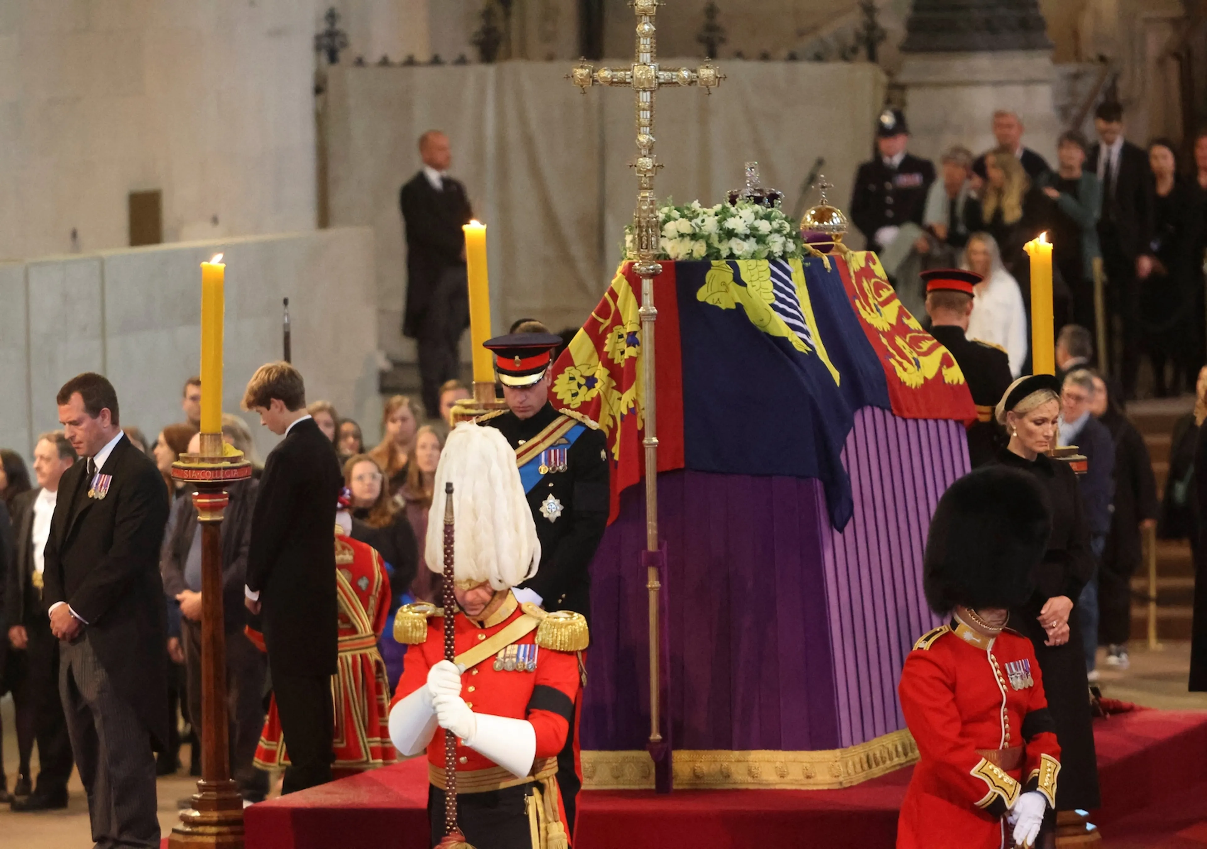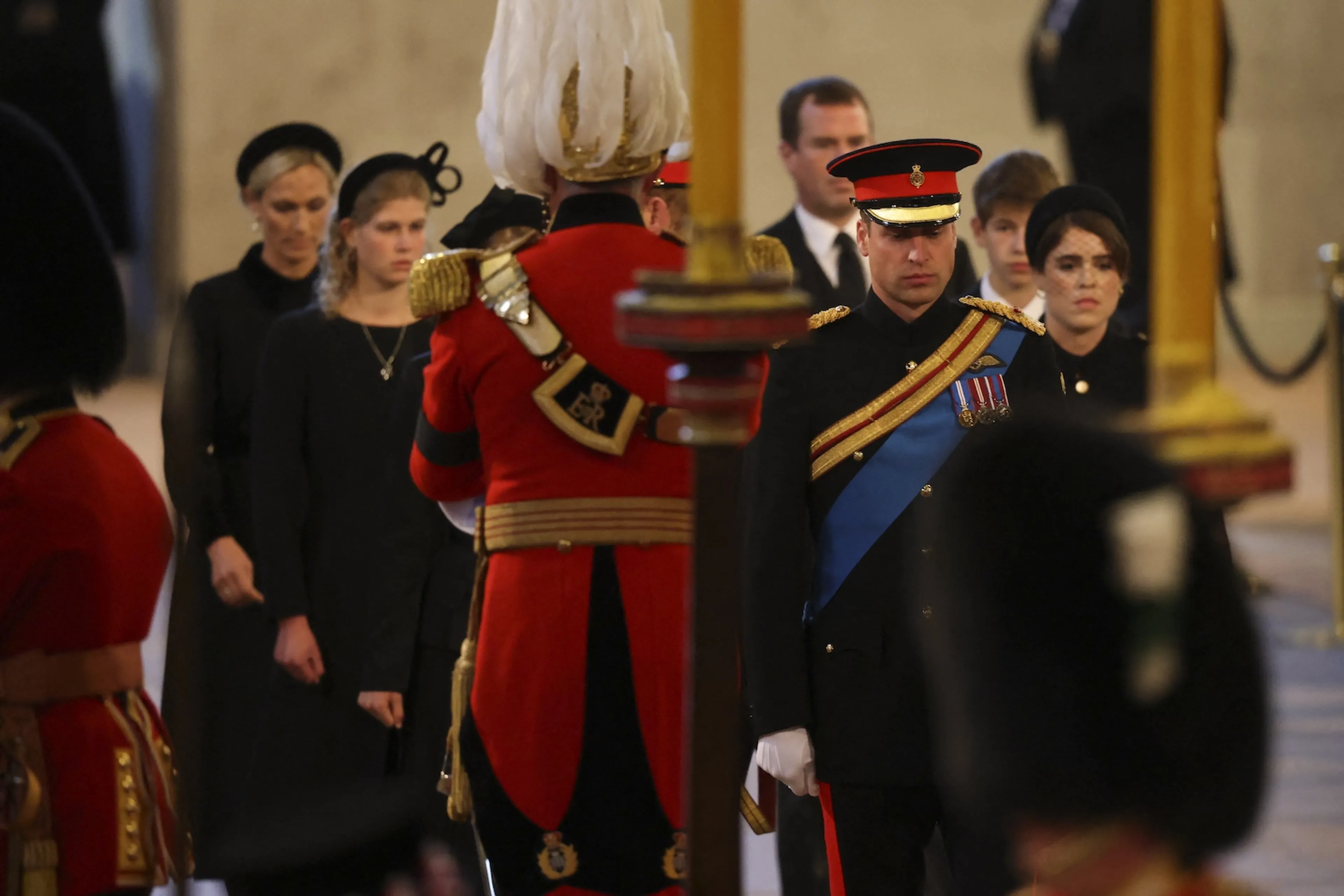 De acht kleinkinderen van koningin Elizabeth hebben zaterdagavond over hun oma gewaakt. Een kwartier lang stonden ze in Westminster Hall naast de kist terwijl het publiek de zaal in en uit bleef gaan om de Queen een laatste keer te groeten.
