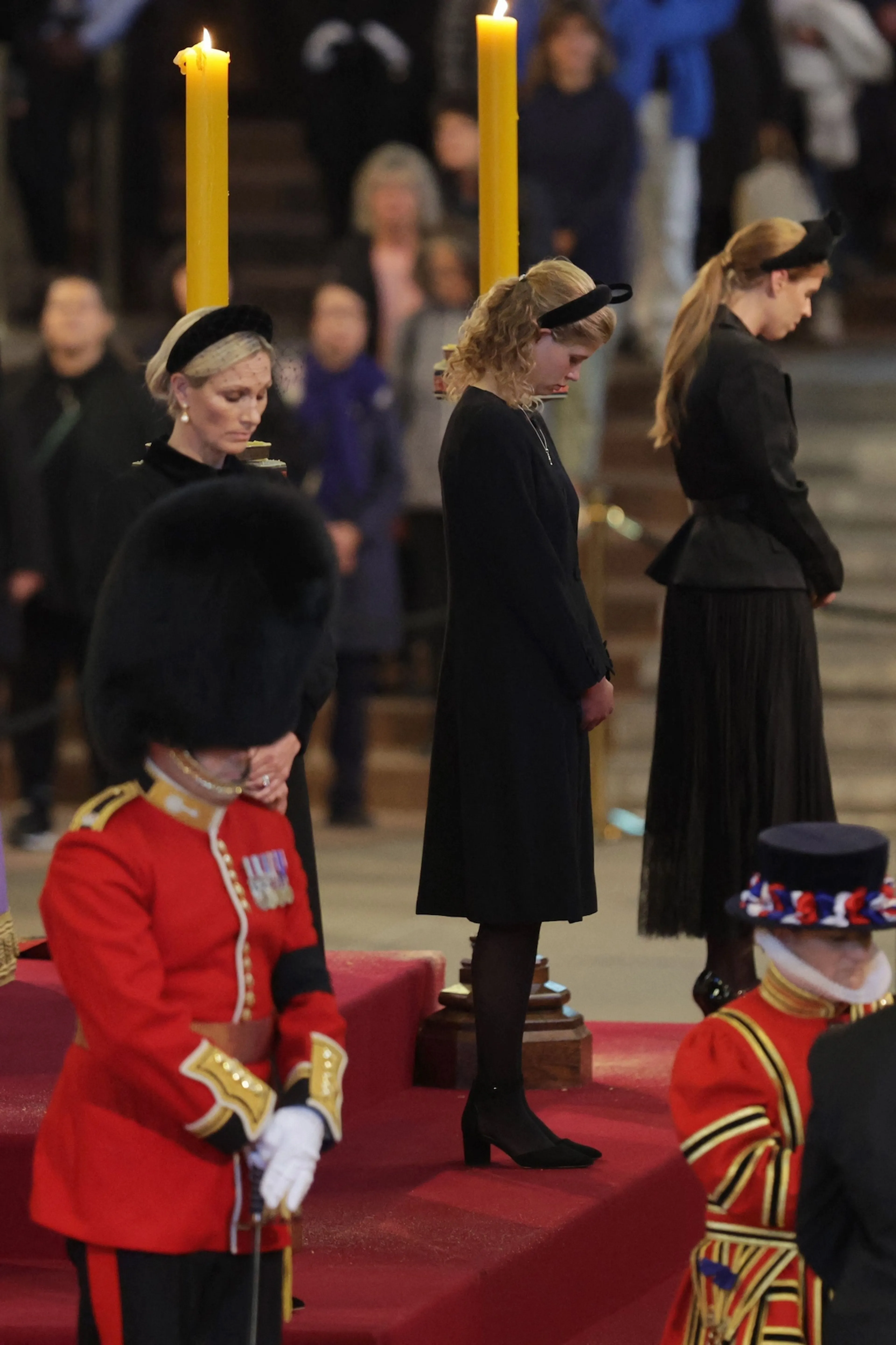 Net als de vier kinderen van Elizabeth, die vrijdagavond over haar waakten, keken ook de kleinkinderen het gehele kwartier naar beneden. Prins Edward en zijn vrouw Sophie, de ouders van Louise en James, keken van een afstand toe.