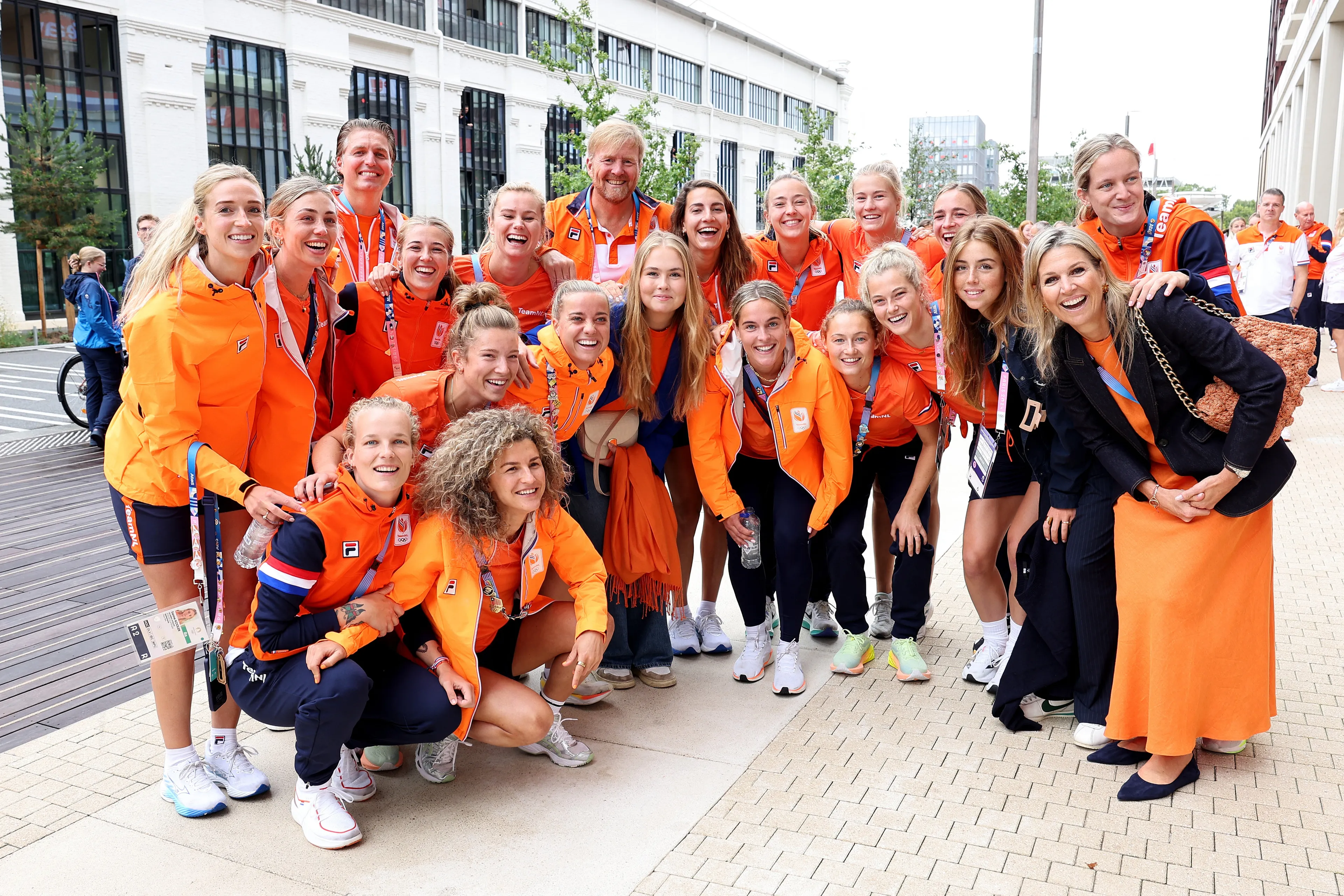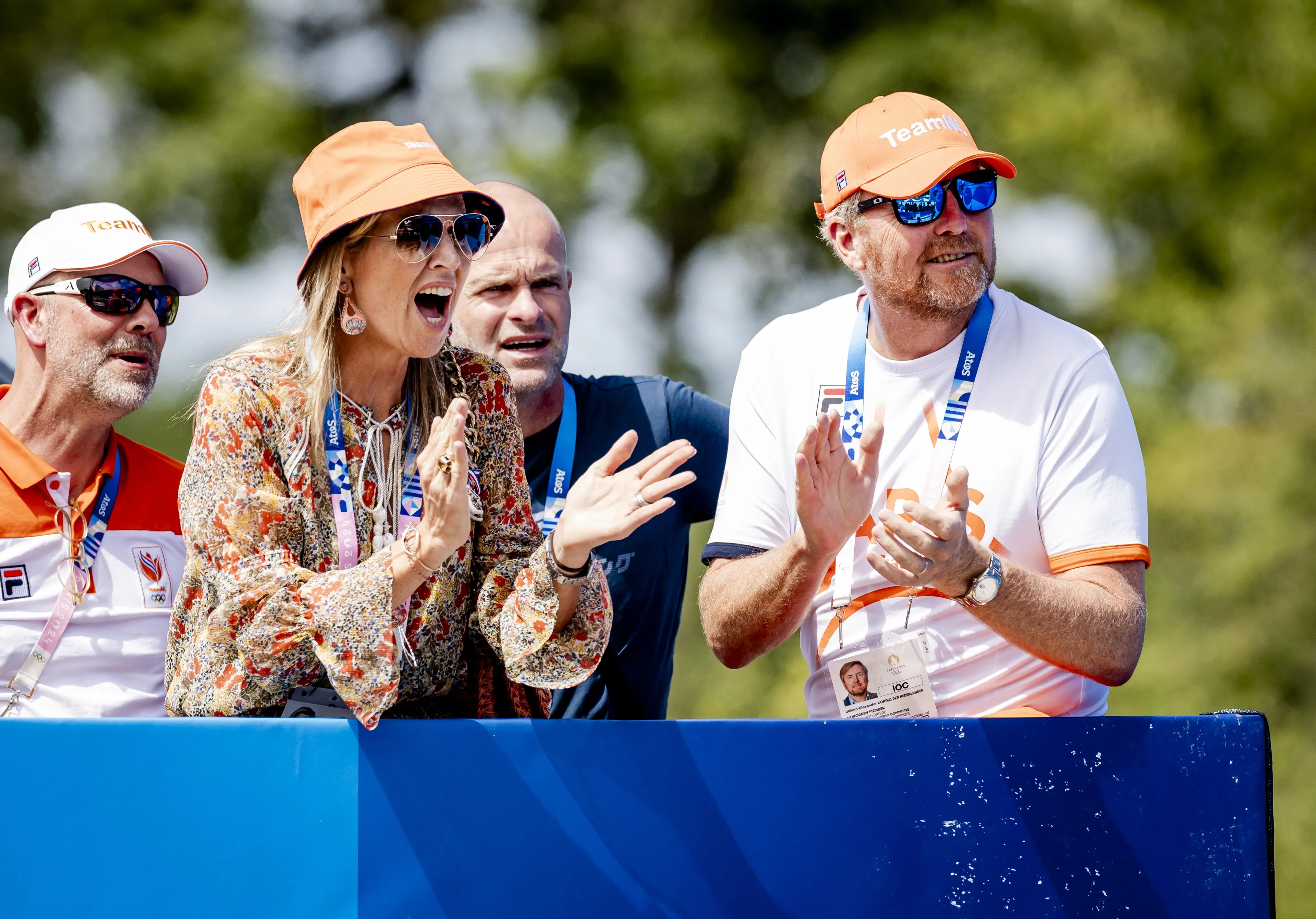 Een dag later, op dag twee van de Olympische Spelen, draagt koningin Máxima een fleurige set met een terracotta bloemenprint van het merk ALEXIS. Onder de rok en blouse draagt Máxima sportieve sneakers. Tijdens het aanmoedigen zet de koningin zelfs even een oranje visserhoedje van Team NL op haar hoofd. Iets wat je niet snel zou verwachten bij onze koningin.