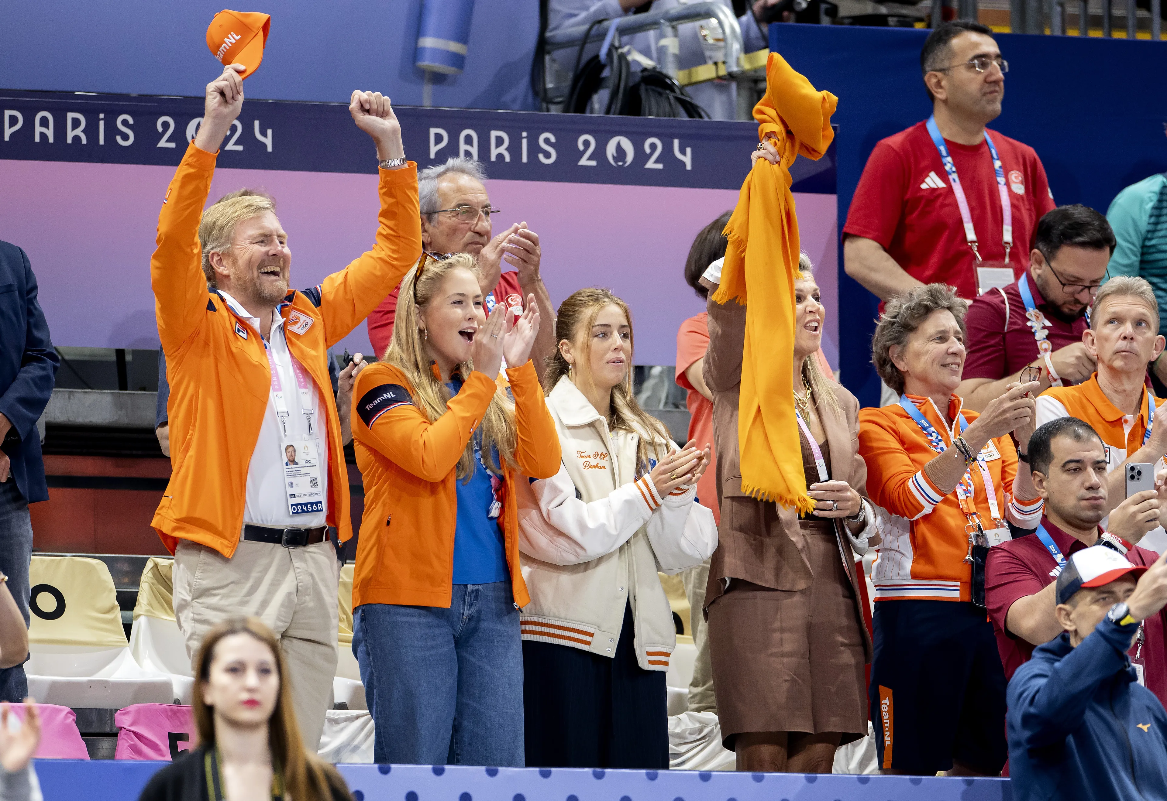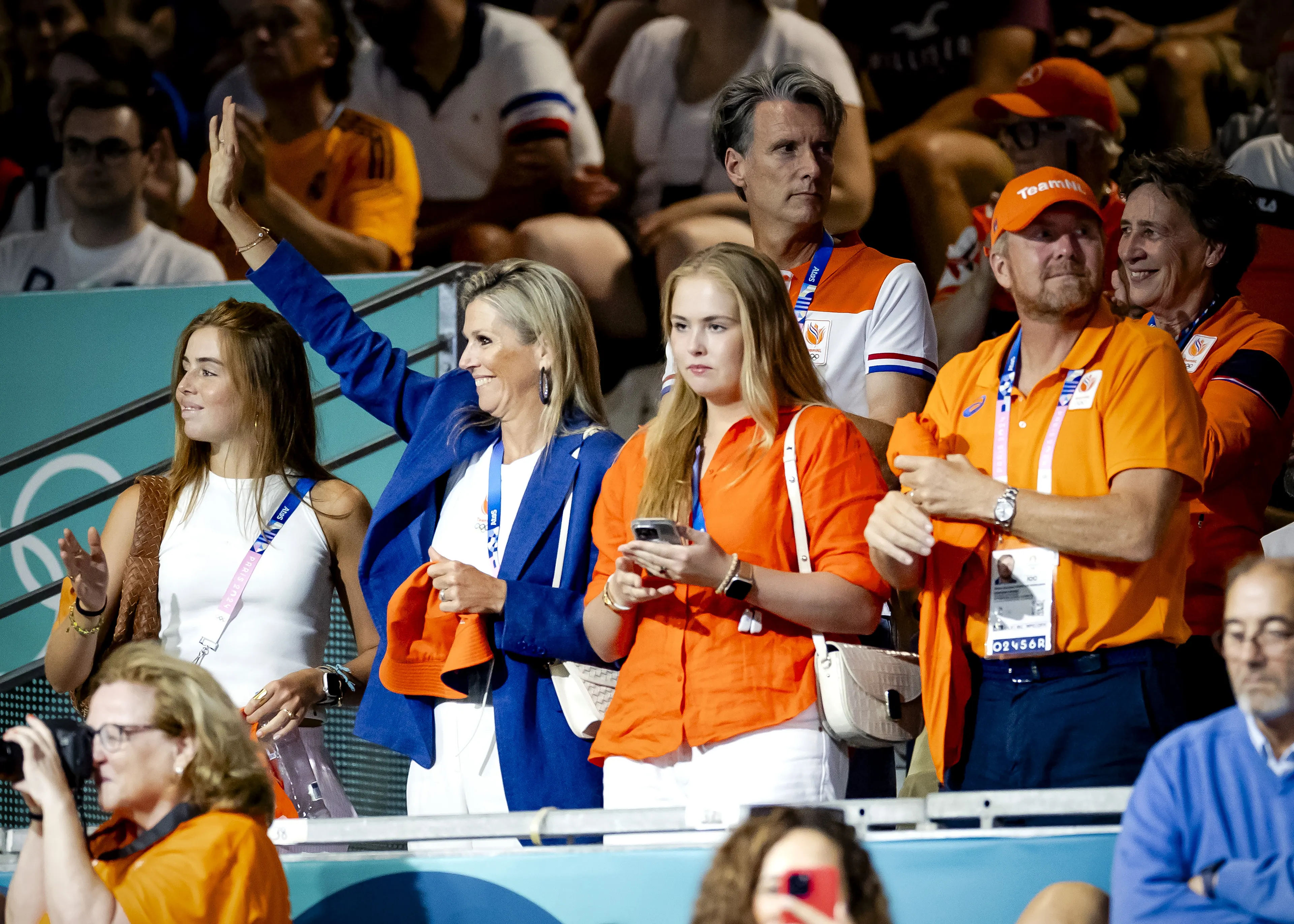 Op de vierde en laatste dag dat het koninklijk gezin op de Spelen is, is het bloedheet in de Franse hoofdstad. Koningin Máxima kleedt zich dan ook in lichte kleuren. Ze draagt een witte tanktop van Team NL op een witte linnen broek. Gewapend met een oranje vissershoedje moedigt ze de Nederlandse afvaardiging vanaf de zijlijn aan. In de middag zit de koningin met haar gezin op de tribune bij de Nederlandse handbalvrouwen. Het is daar aanzienlijk koeler, want de koningin heeft in de zaal een knalblauwe blazer aan.