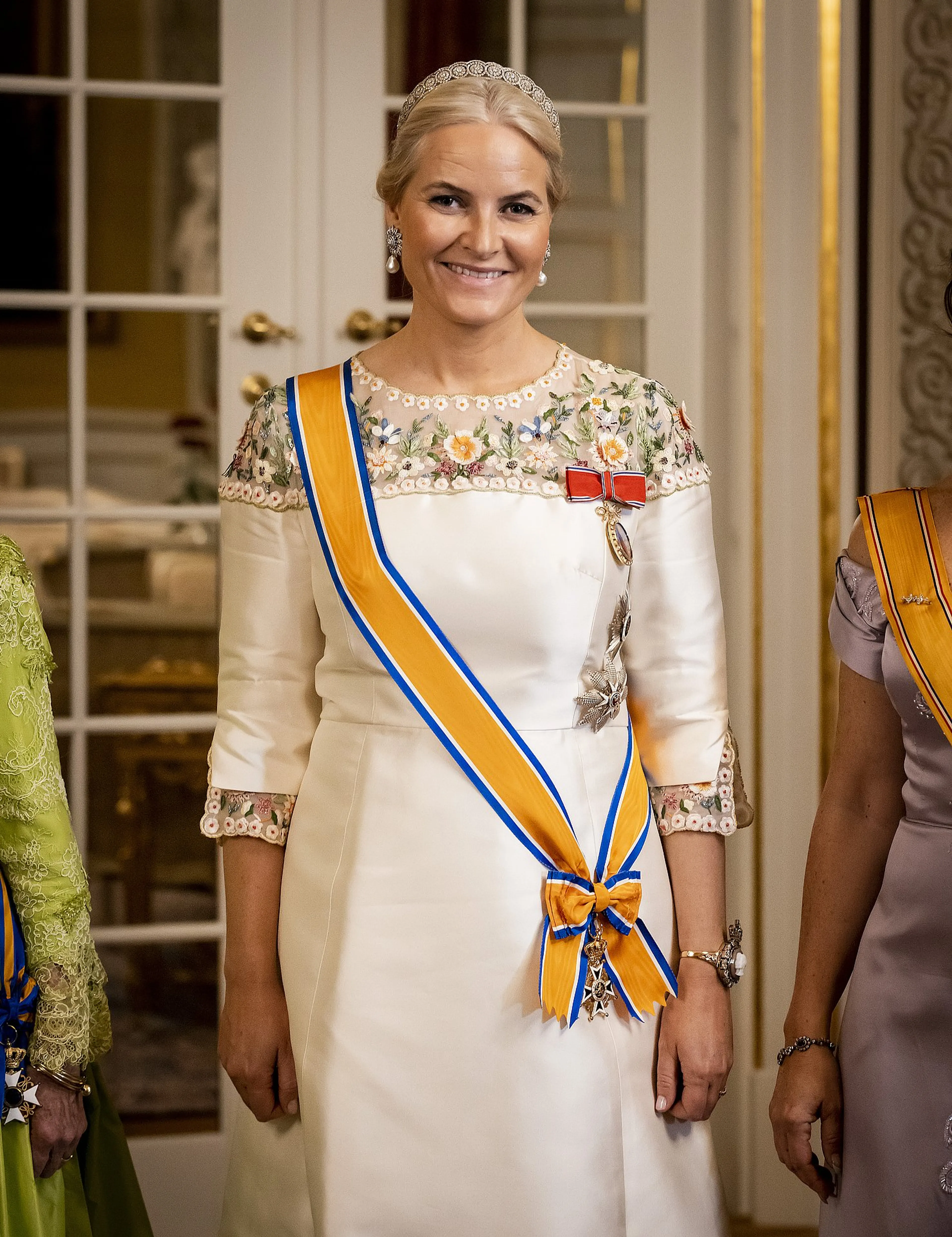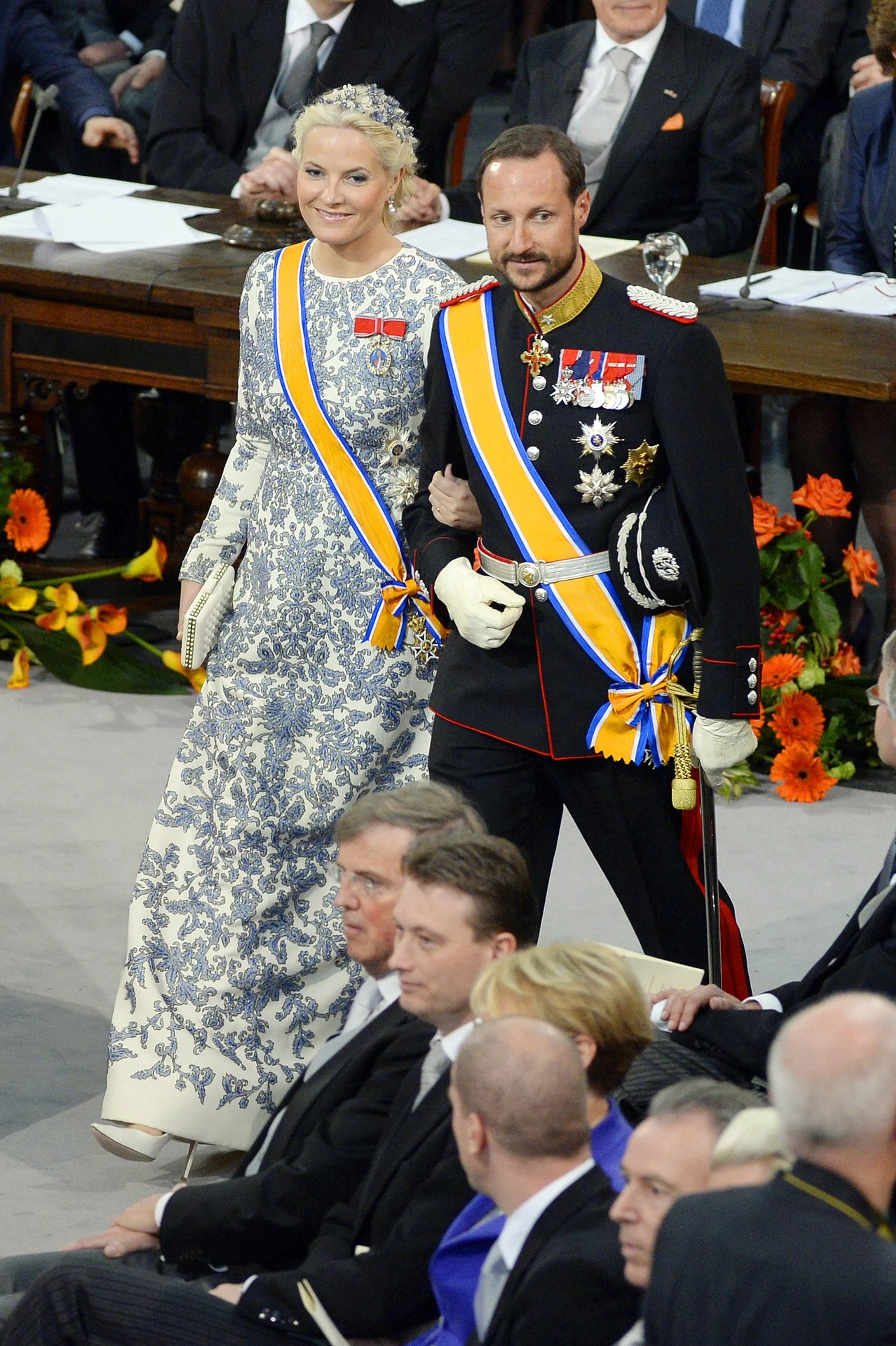 De derde jurk komt je misschien ook bekend voor, want Mette-Marit droeg deze japon namelijk tijdens de inhuldiging van koning Willem-Alexander. Aan de arm van kroonprins Haakon kwam ze de Nieuwe Kerk in Amsterdam binnen. Haar witte jurk was rijkelijk geborduurd met blauwe kraaltjes in een bloemenpatroon.