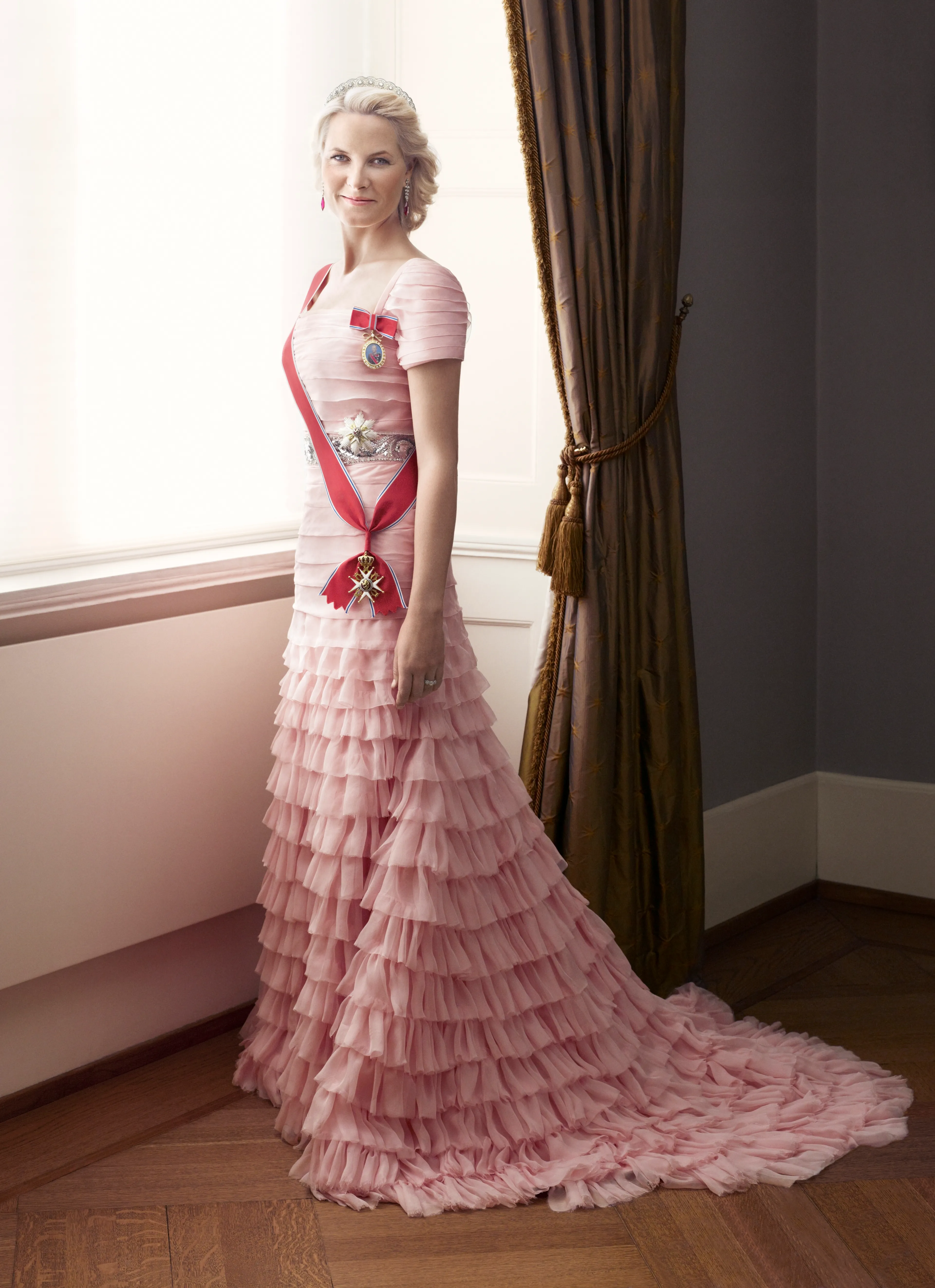 We beginnen ons foto-overzicht met een roze galajurk met ruches. Misschien wel de favoriete galajurk van Mette-Marit? Wie zal het zeggen! De kroonprinses heeft de japon in ieder geval al verschillende keren gedragen. We zagen 'm op de vooravond van het huwelijk van de Zweedse kroonprinses Victoria en op een officieel galaportret (2011). Onlangs haalde ze de jurk opnieuw uit haar kledingkast voor het galadiner ter ere van de achttiende verjaardag van dochter Ingrid Alexandra.