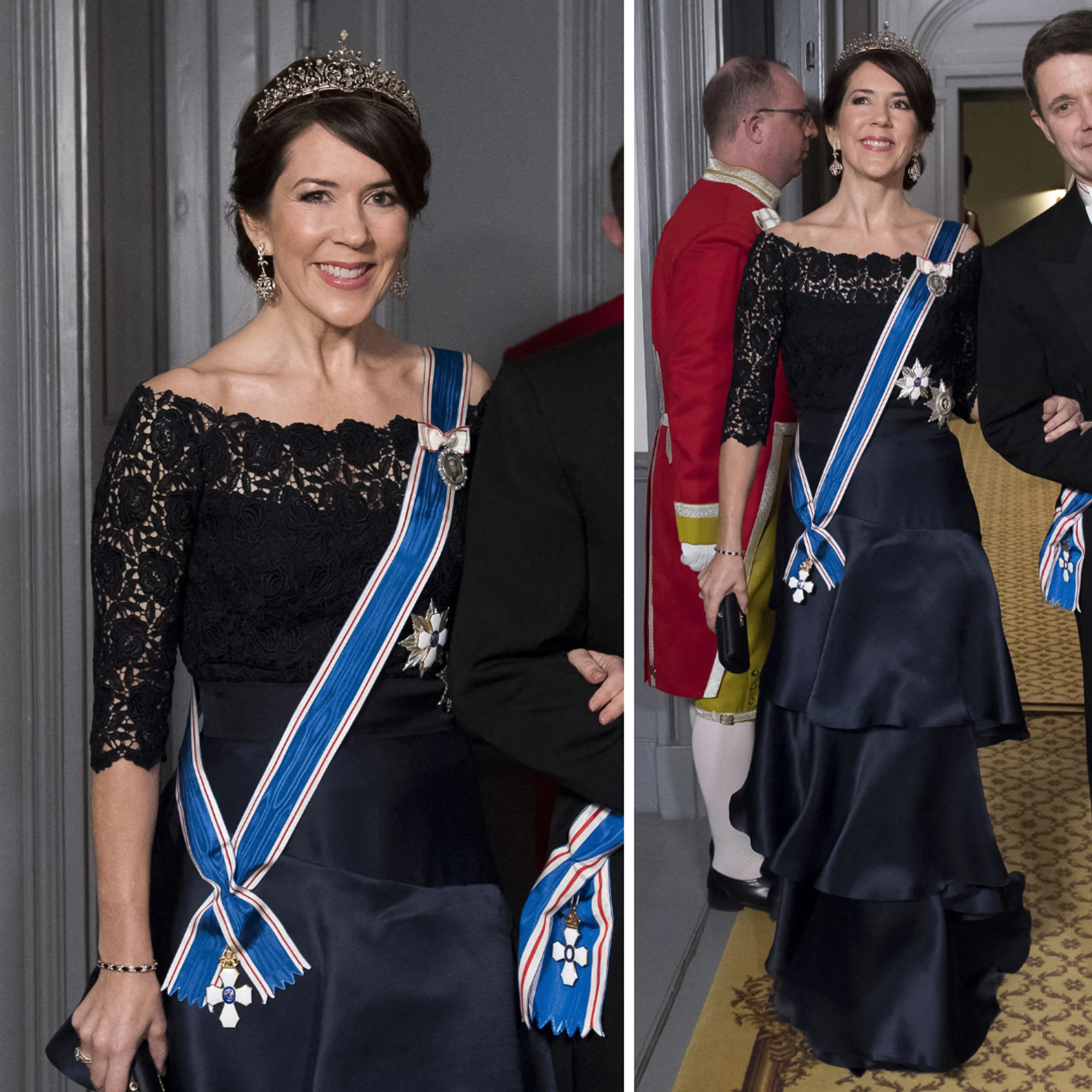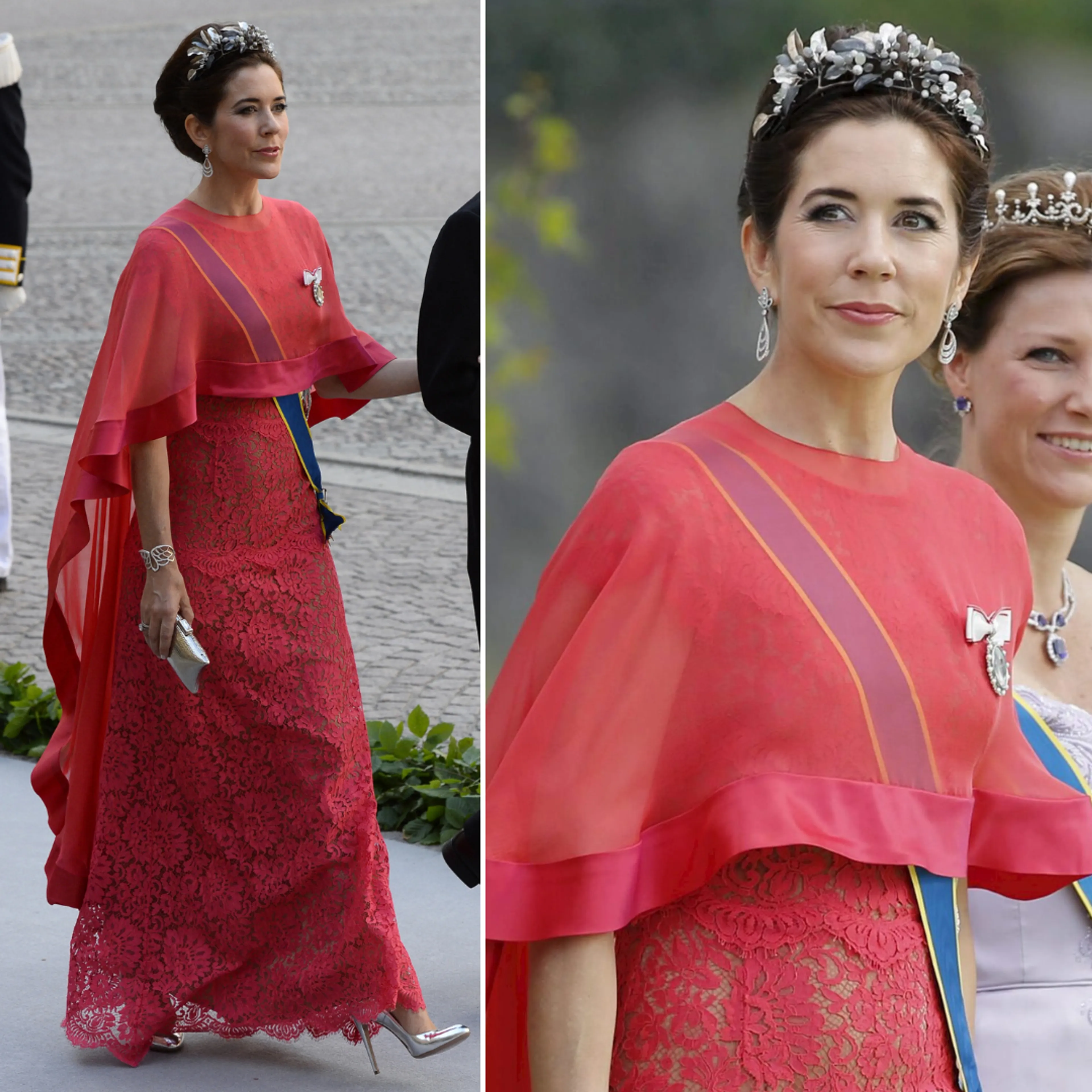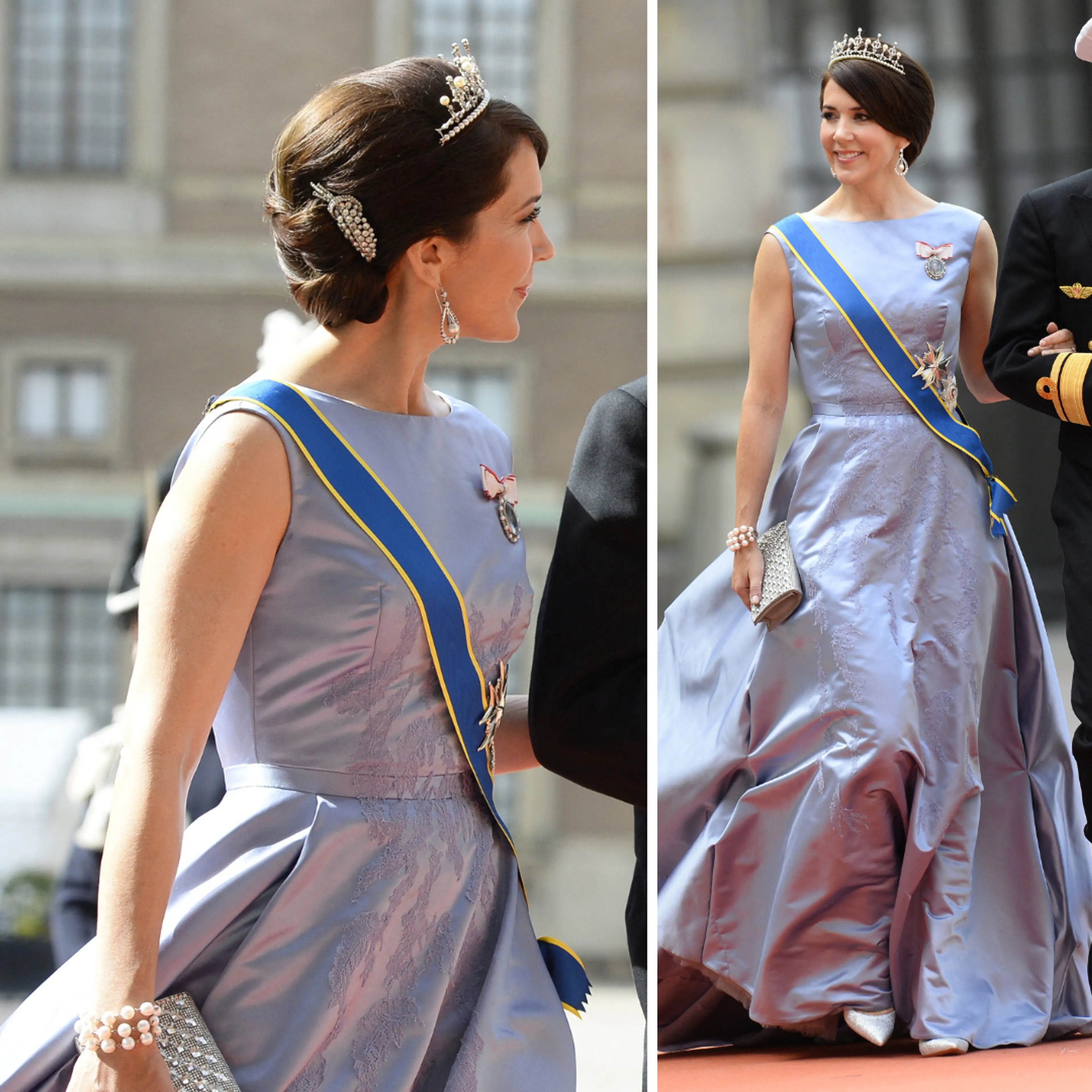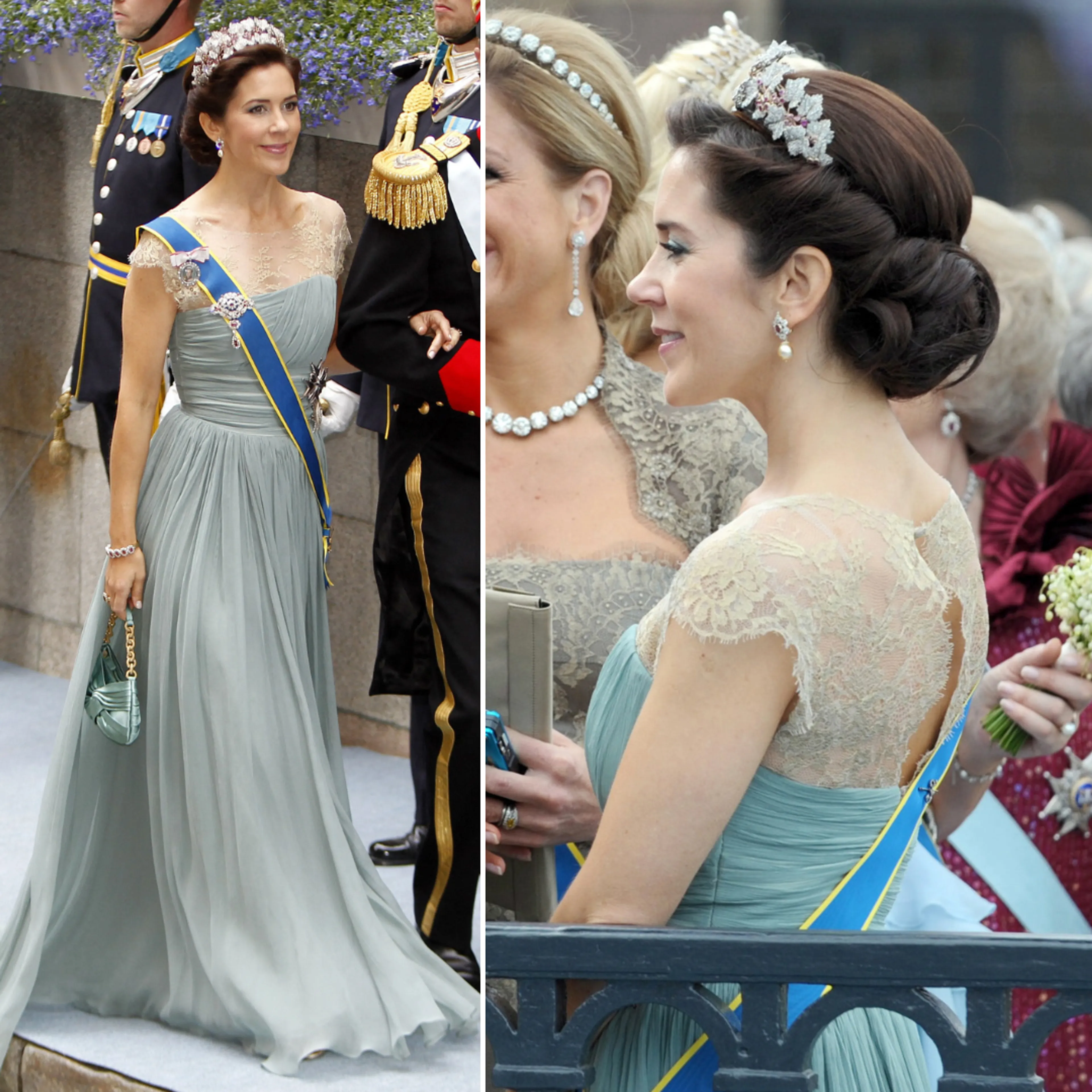 Naast officiële portretten zien we Mary tijdens bruiloften stijlvol verschijnen. Voor het huwelijk van de Zweedse kroonprinses Victoria koos ze voor een luchtige blauwe jurk met kant.