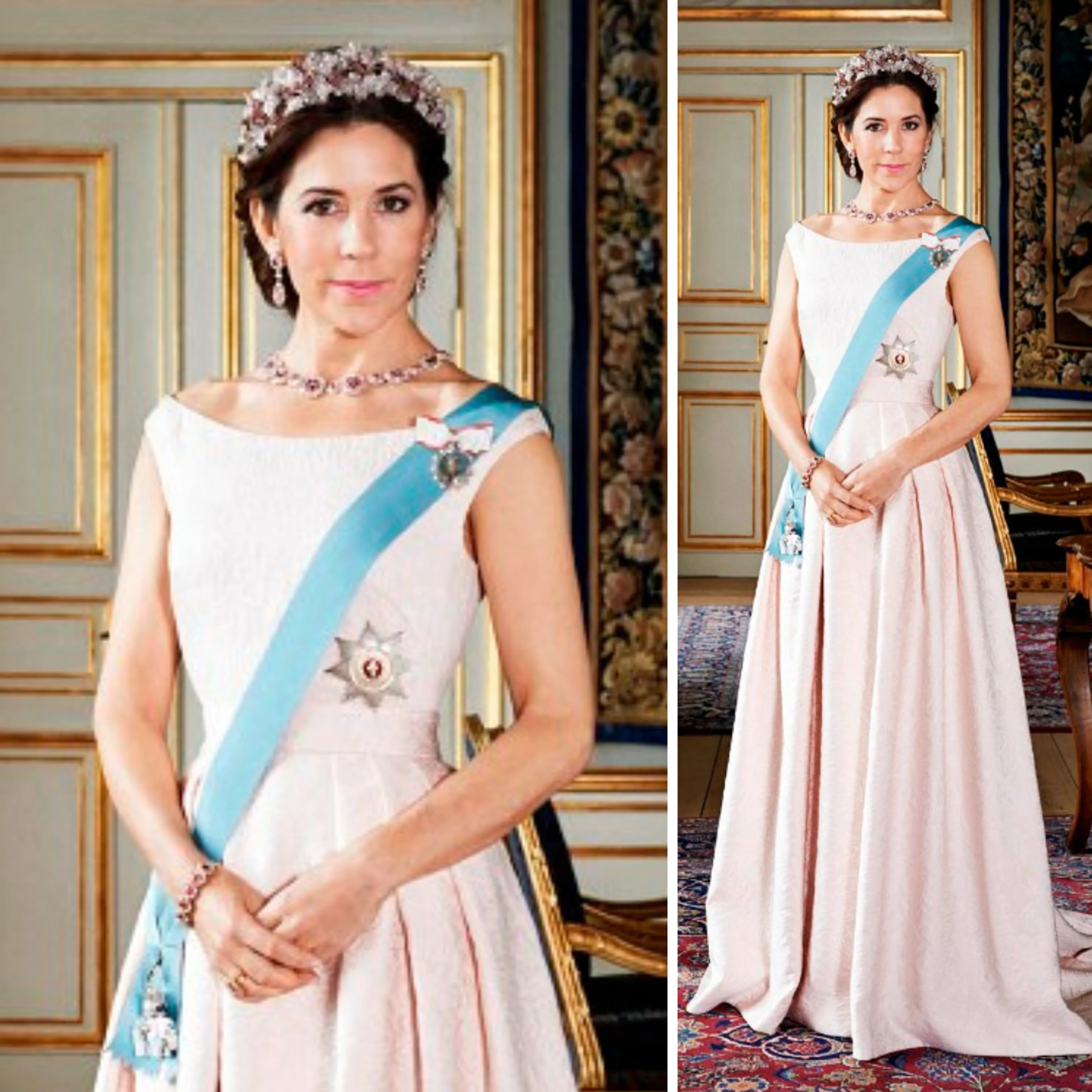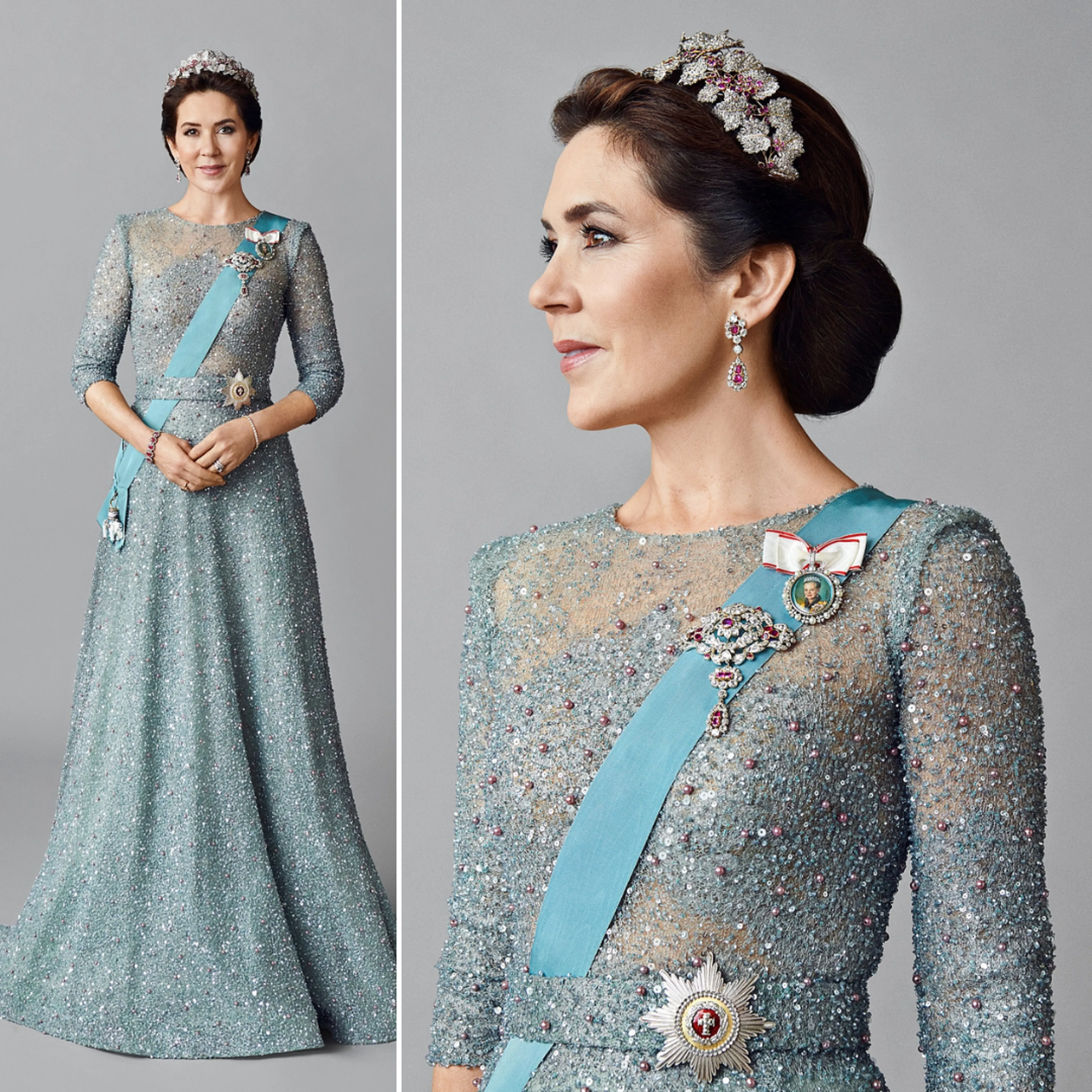 Op officiële portretten draagt Mary vaak schitterende jurken. Deze zachtblauwe creatie van de Deense ontwerper Lasse Spangenberg is bedekt met glinsterende pailletten. Het resultaat is op en top glitter en glamour!