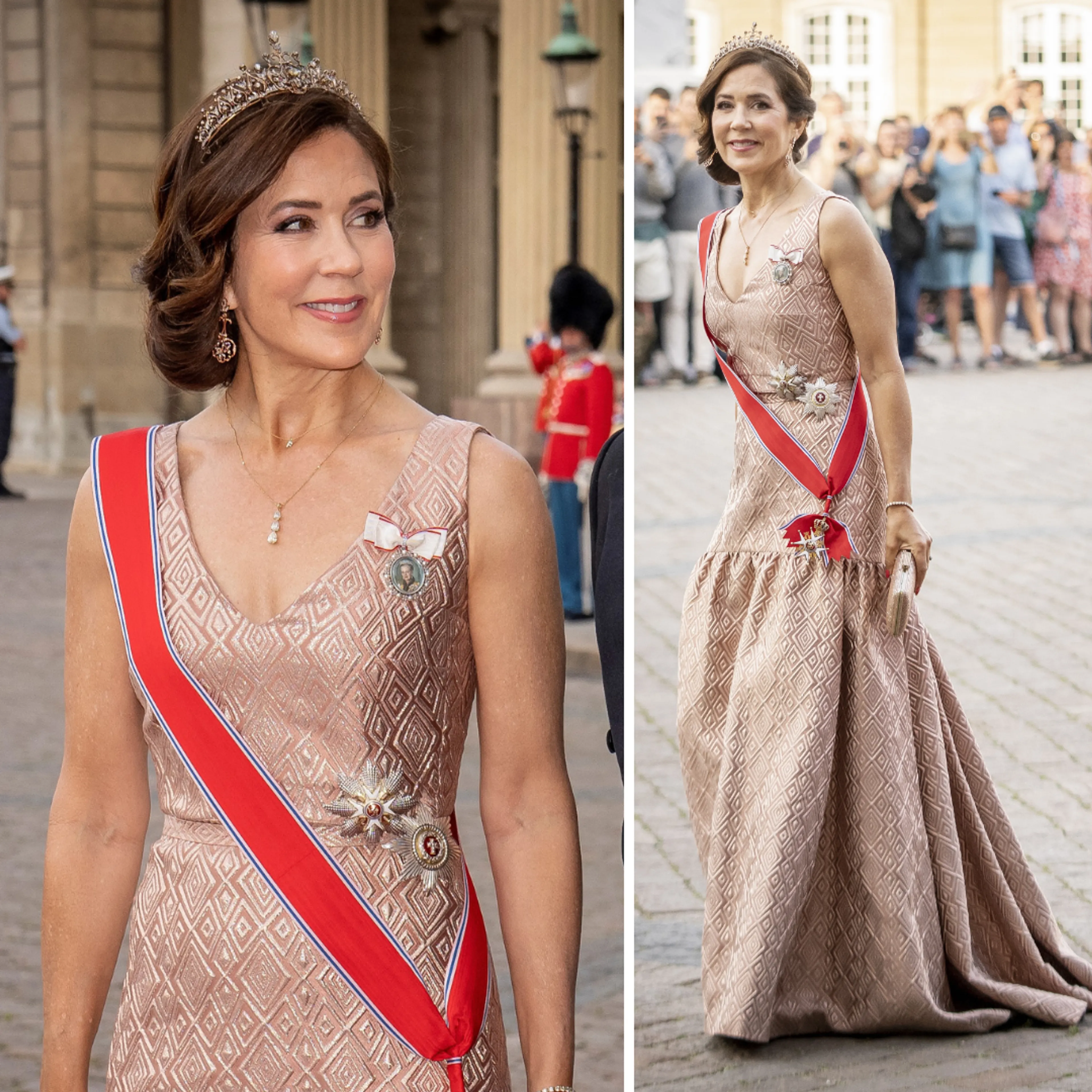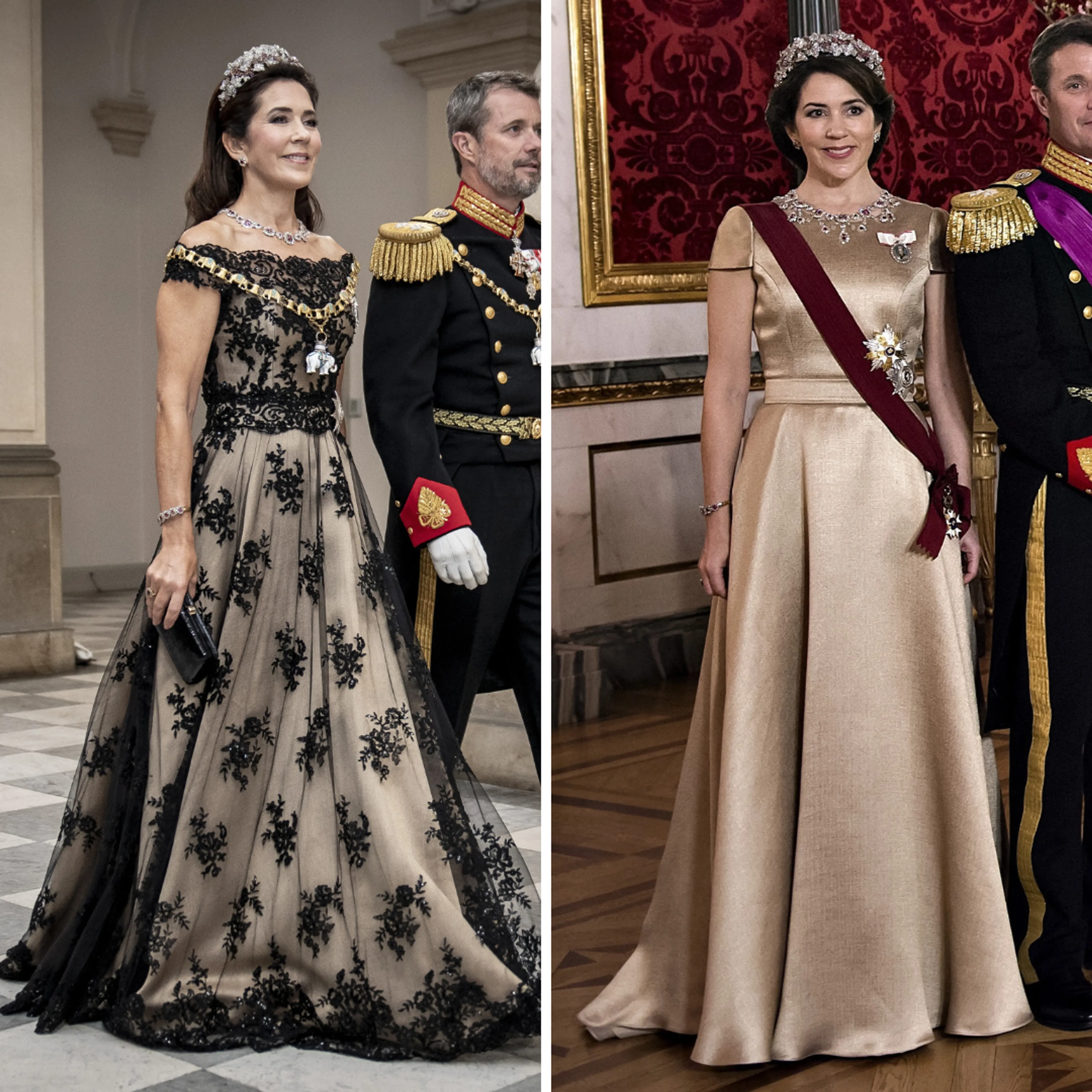 Voor staatsbanketten haalt Mary de mooiste japonnen uit haar kast. Een jurk waar we haar vaker in zien is een goudkleurige japon met een ruitpatroon.
