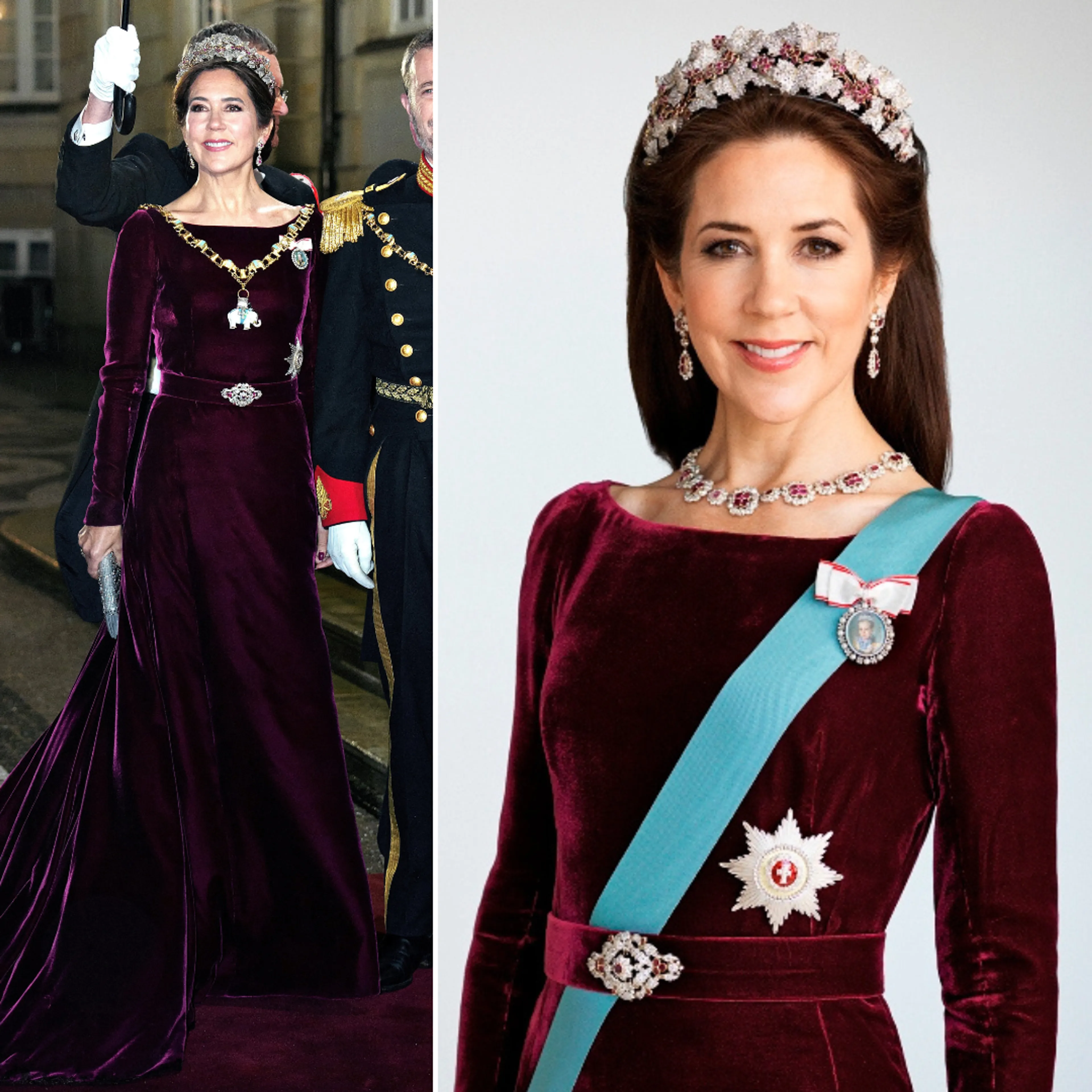 Een galajurk waar we de koningin vaker in zien, is een fluwelen bordeauxrode creatie. Ze droeg deze vorige week nog bij een galadiner in combinatie met de Ruby Parure Tiara.