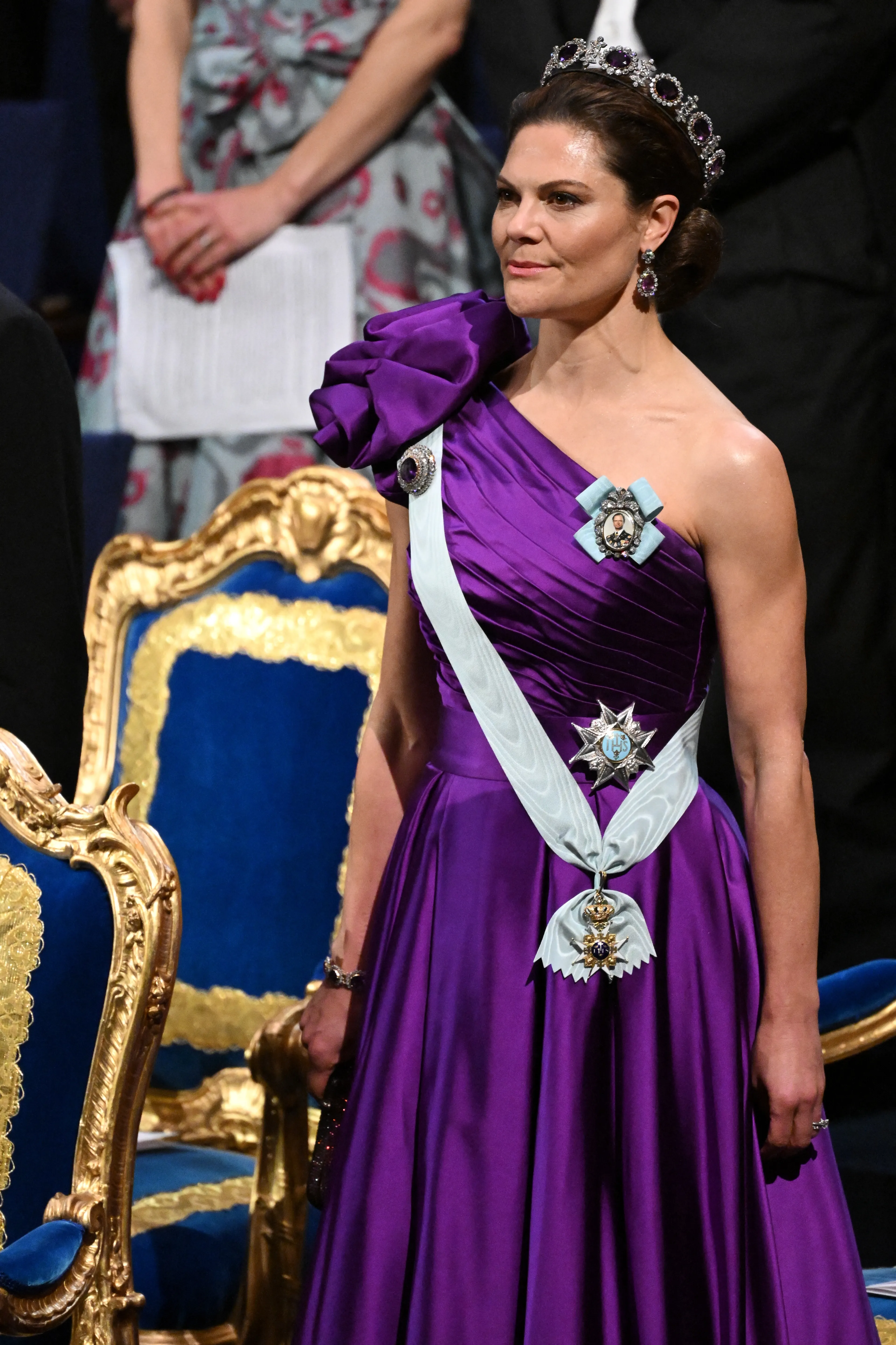 Voor de uitreiking van de Nobelprijzen in 2023 kiest Victoria voor een paarse jurk, met een opvallende schouder-applicatie.