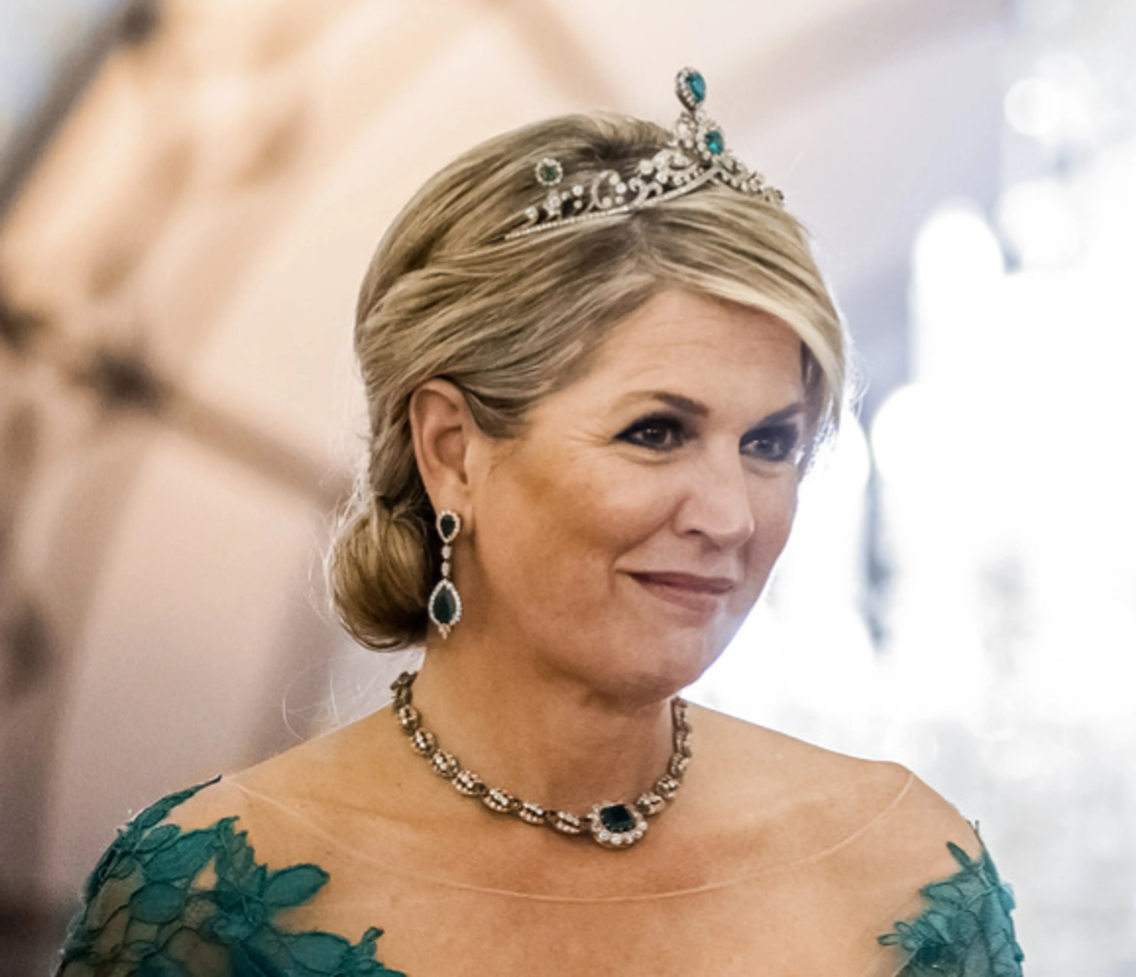 Bij de jurk draagt zij ook een bijpassend diadeem vol smaragden, het juweel komt uit de tijd van koningin Wilhelmina. De 16-jarige Wilhelmina kreeg in 1896 het diadeem als kerstcadeau.