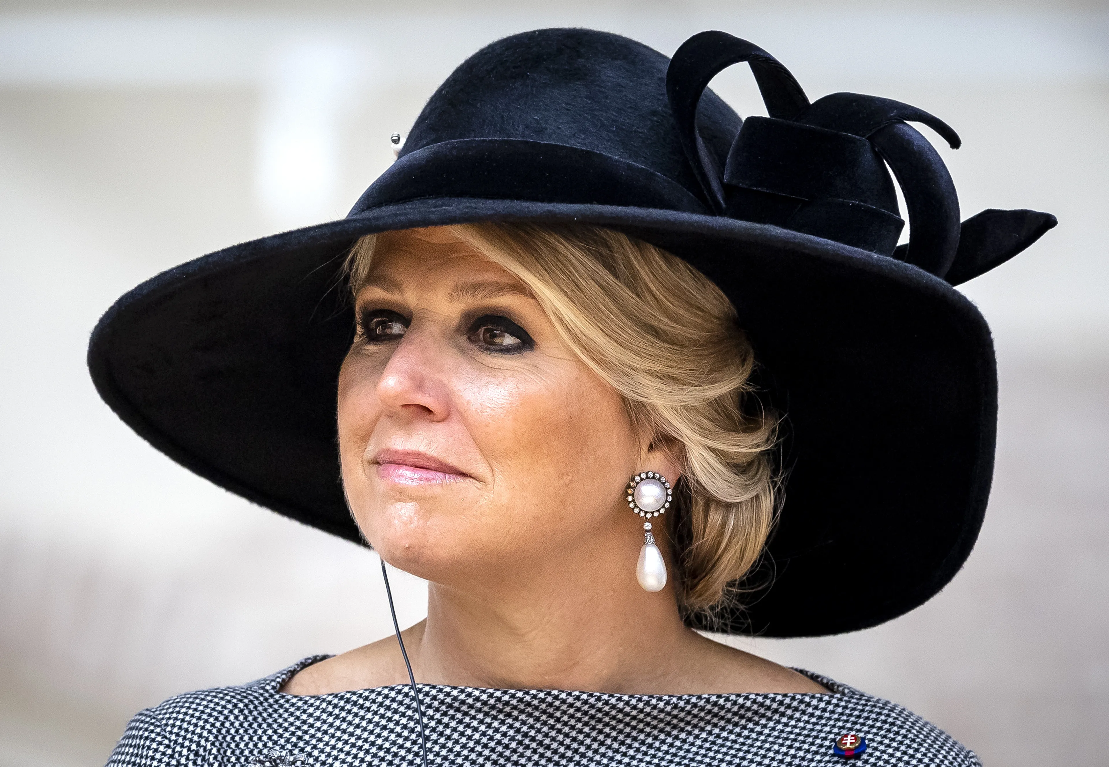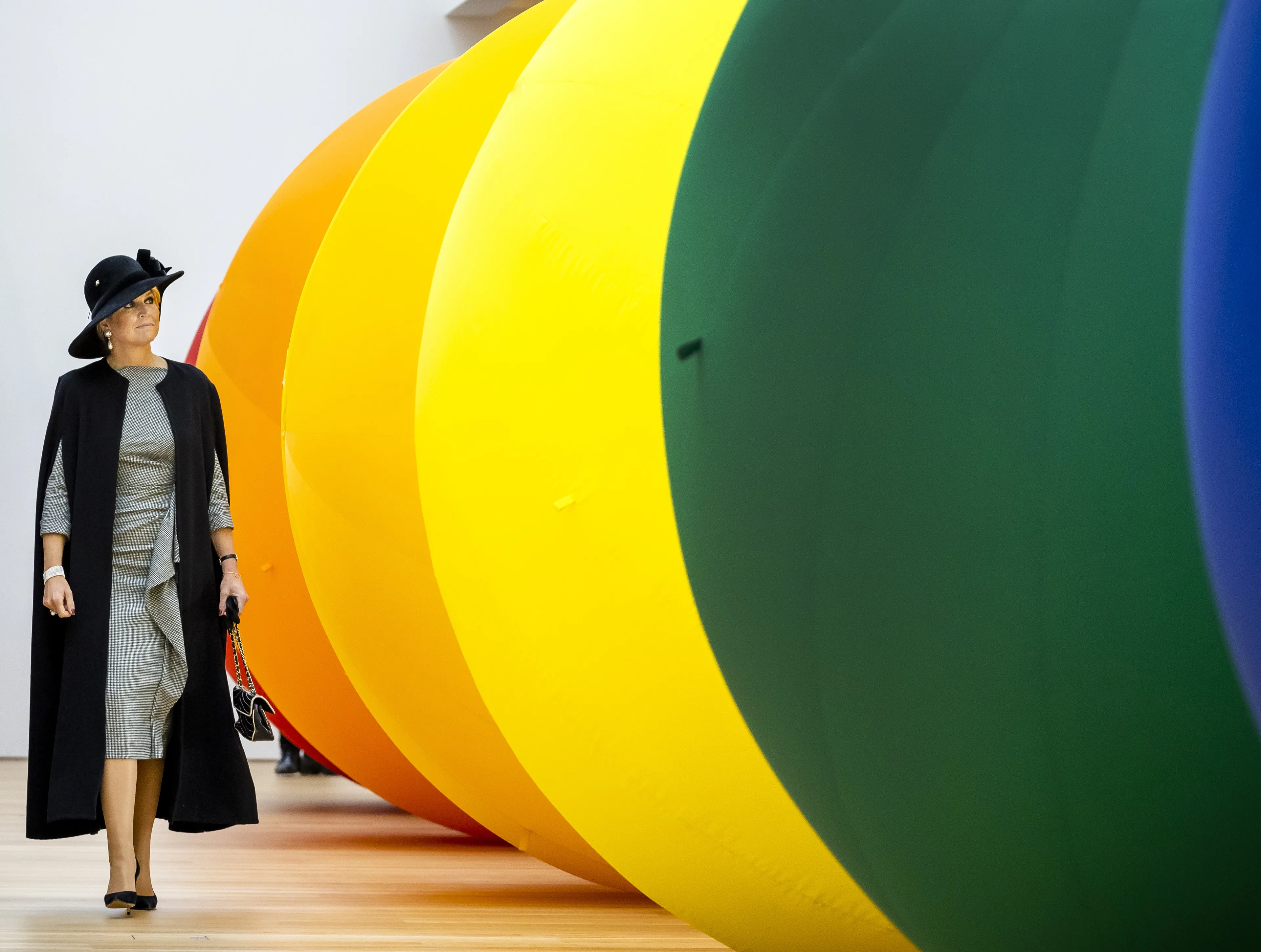 De volgende zien we koningin Máxima opnieuw met een hoed van Philip Treacy. De zwarte hoed droeg Máxima ook tijdens de Nationale Dodenherdenking in 2022. De hoed combineert zij met een zwart-witte japon en een zwarte mantel van Natan.