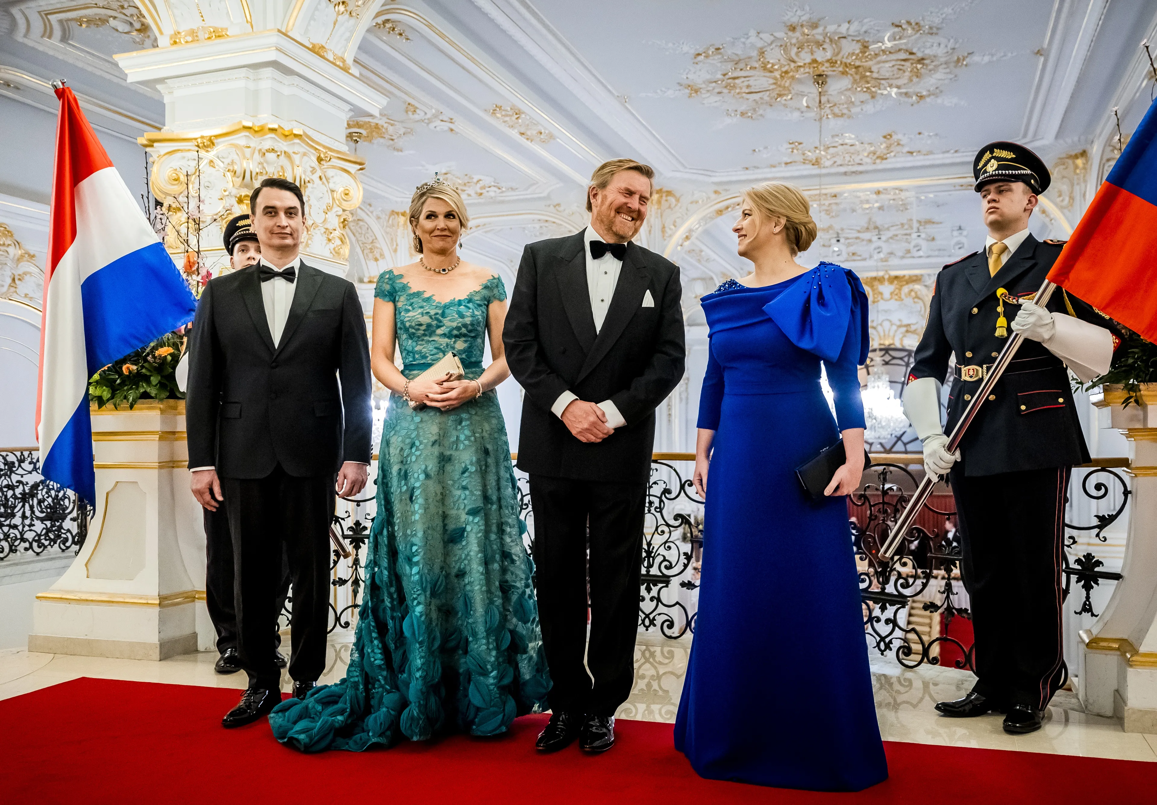 Traditiegetrouw verscheen Máxima in een spectaculaire avondjurk bij het staatsbanket. Deze smaragdgroene jurk komt van Nederlandse bodem en is een ontwerp van Jan Taminiau. De japon heeft zij al meerdere keren uit de kast gehaald tijdens verschillende staatsbezoeken.