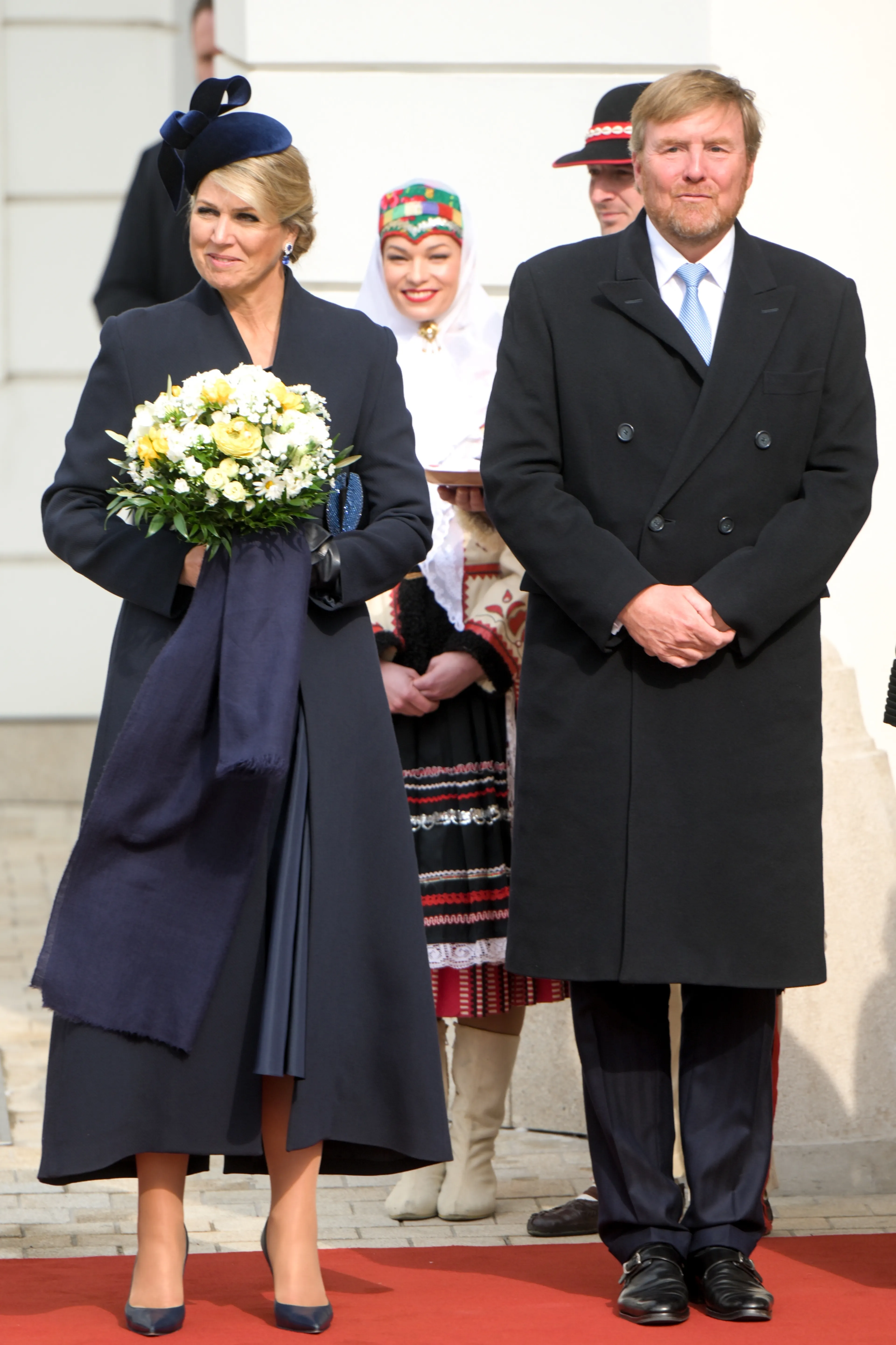 Op de eerste dag van het staatsbezoek droeg koningin Máxima deze donkerblauwe overslagjurk van Natan. Dit combineert zij met een bijpassende mantel van hetzelfde modehuis. De fluwelen hoed is ontworpen door de Britse designer Philip Treacy.