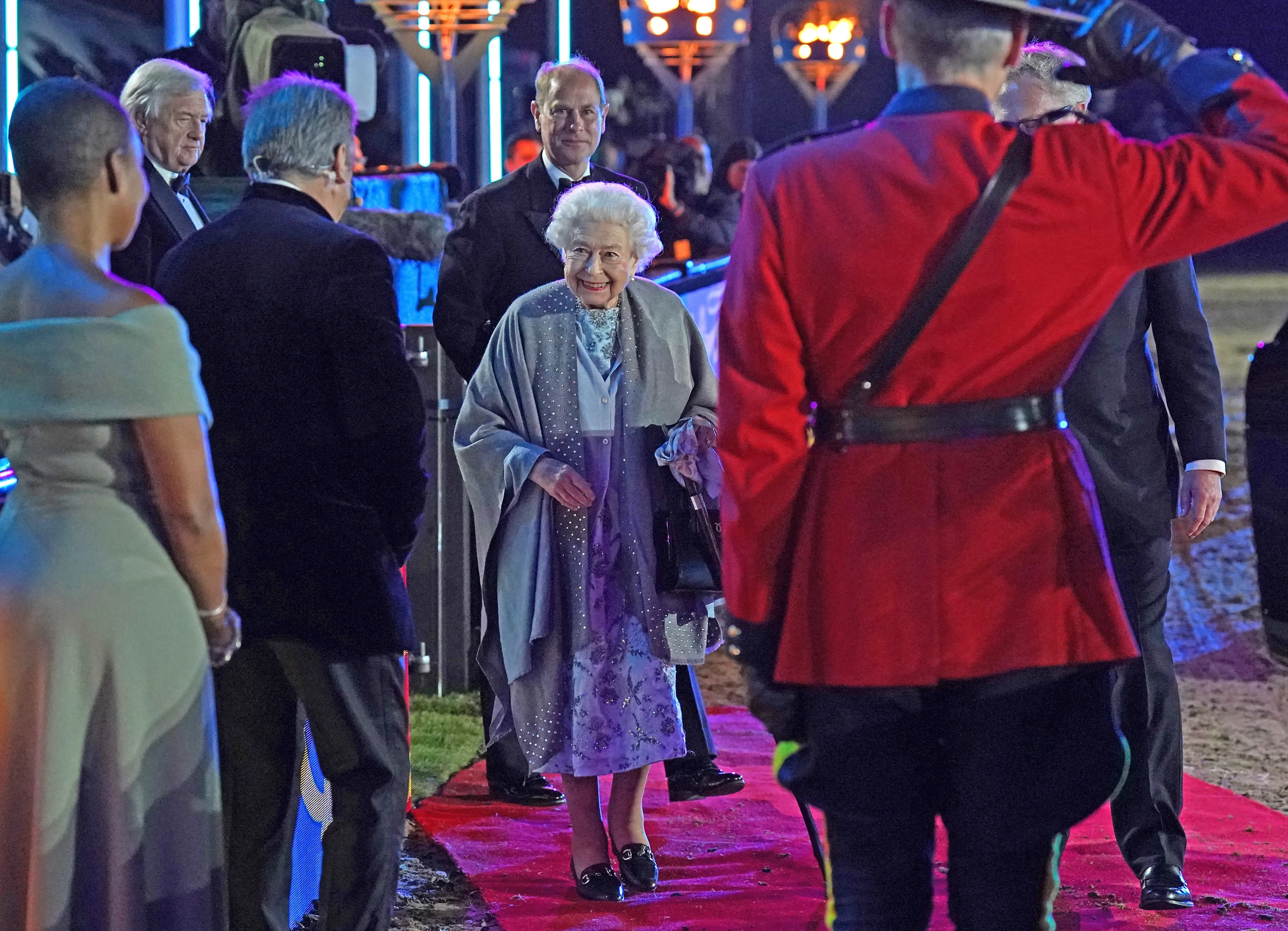 Elizabeth maakte gebruik van een stok toen ze naar haar plaats op de tribune wandelde en werd geflankeerd door haar zoon prins Edward, de hertog van Wessex. De koningin genoot zichtbaar van de optredens en maakte een montere indruk.