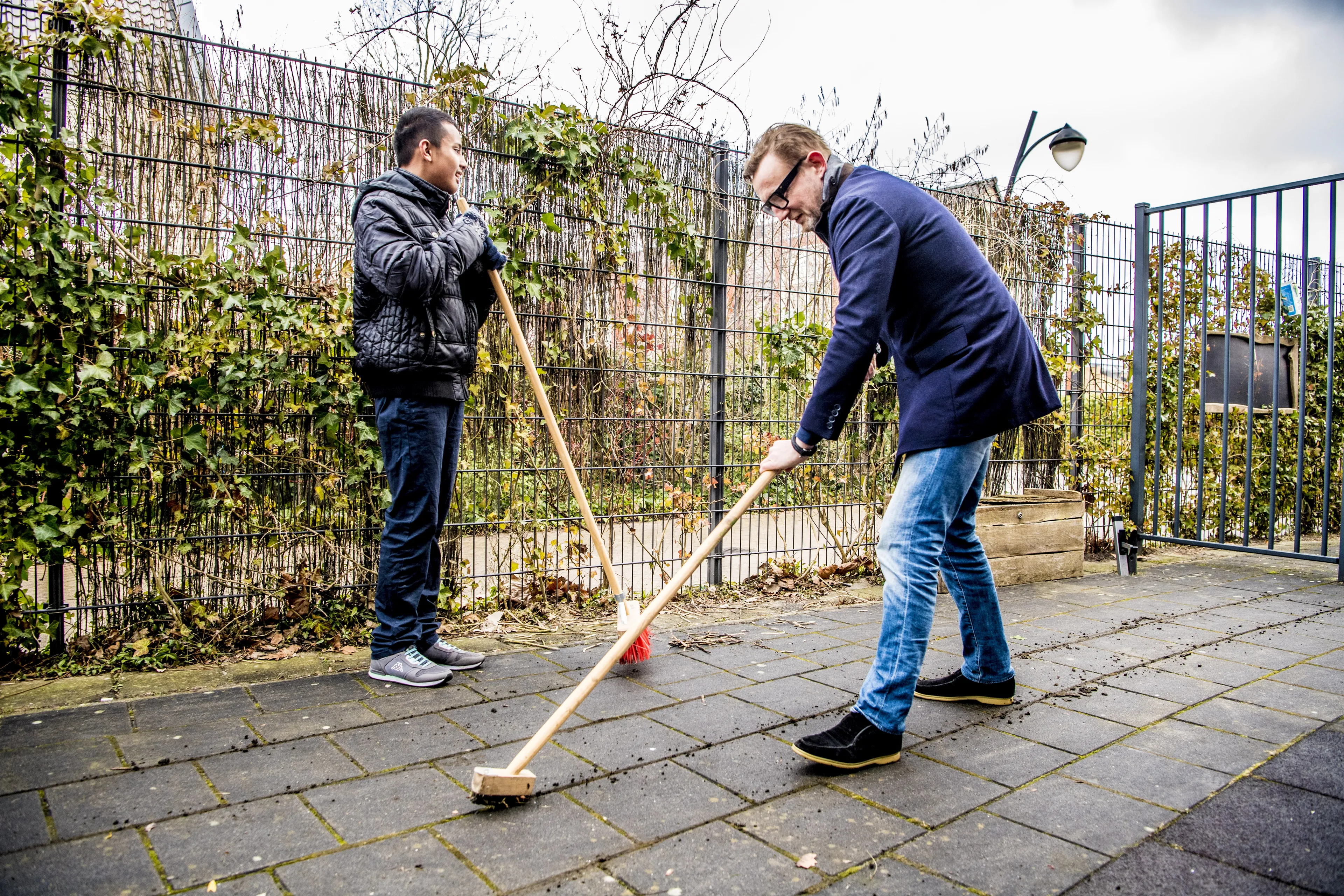 Ook prins Bernhard weet van aanpakken. De zoon van prinses Margriet en Pieter van Vollenhoven helpt bij een kinderdagcentrum om het onkruid tussen de tegels te verwijderen.