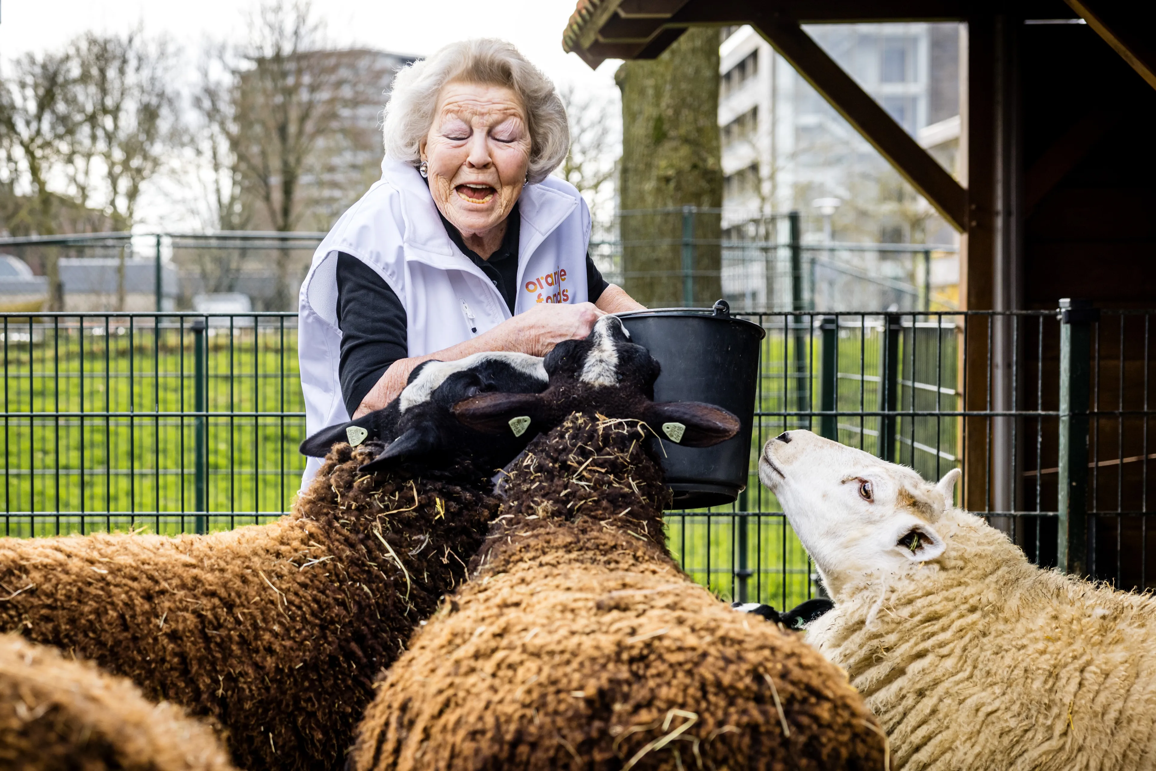 In de lente worden veel jonge dieren geboren. Deze schapen willen maar wat graag de aandacht van voormalig koningin Beatrix.