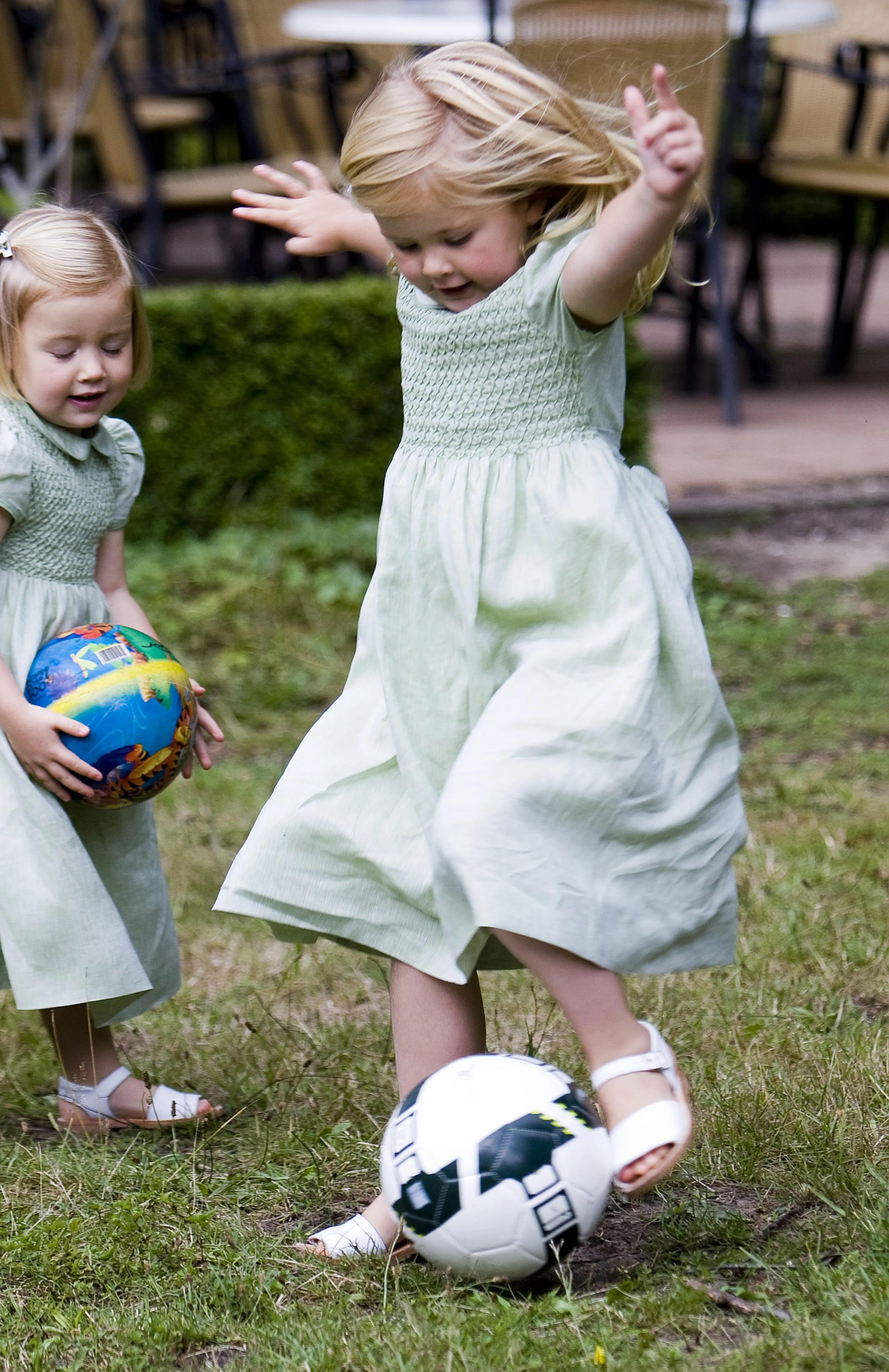 Ook de prinsessen Amalia en Alexia helpen een handje mee in de tuin, zoals hier tijdens Koningsdag 2014 in Amstelveen.