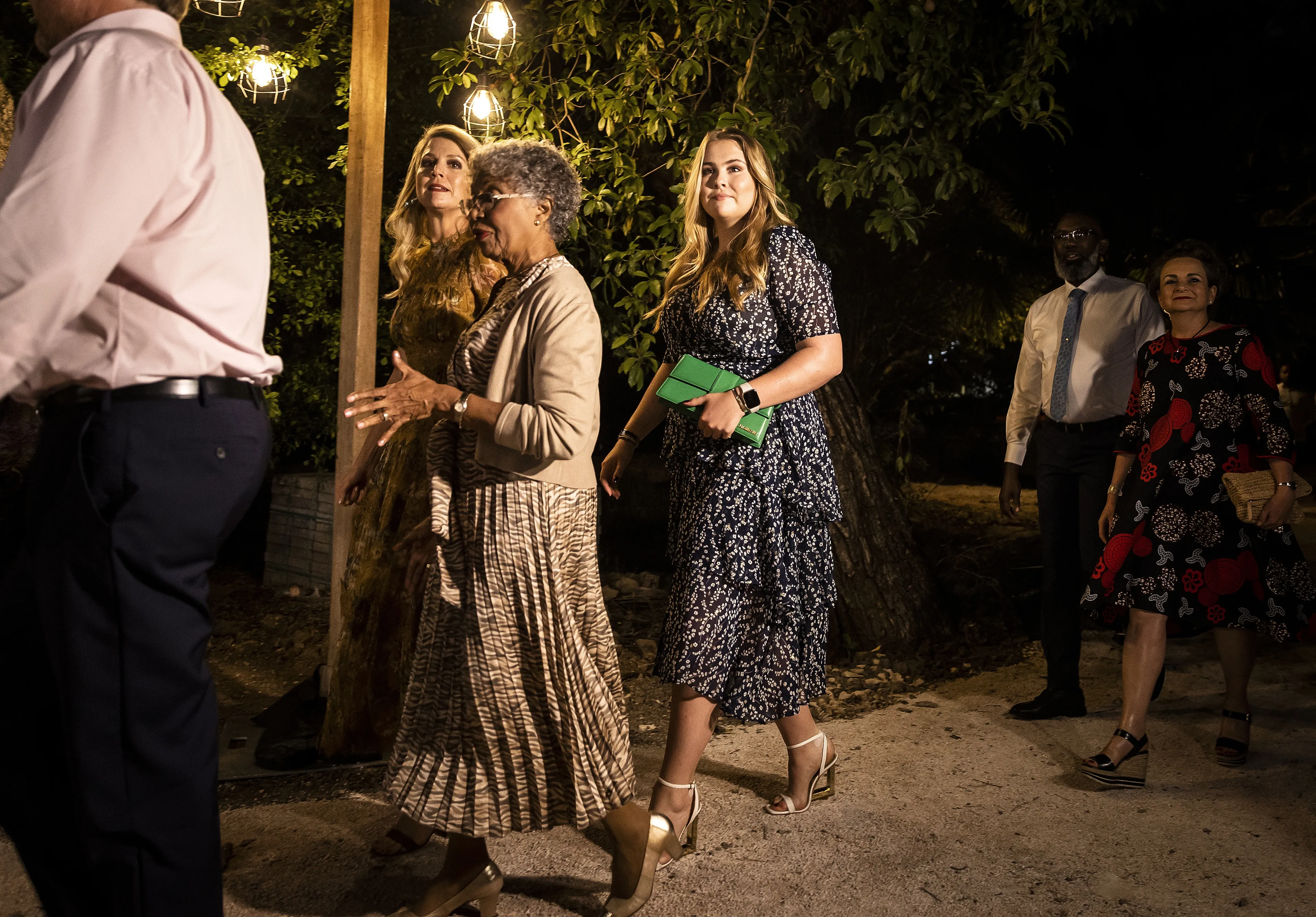 Moeder en dochter kleedden zich donderdagavond voor een diner op Curaçao. Samen met koning Willem-Alexander en éénentwintig Curaçaoënaars, die veel betekenen voor de maatschappij, dineerden zij bij de Kathedraal van Doornen. Het aantal gasten staat symbool voor het 21-jarig huwelijk van het Koninklijk Paar die dag.