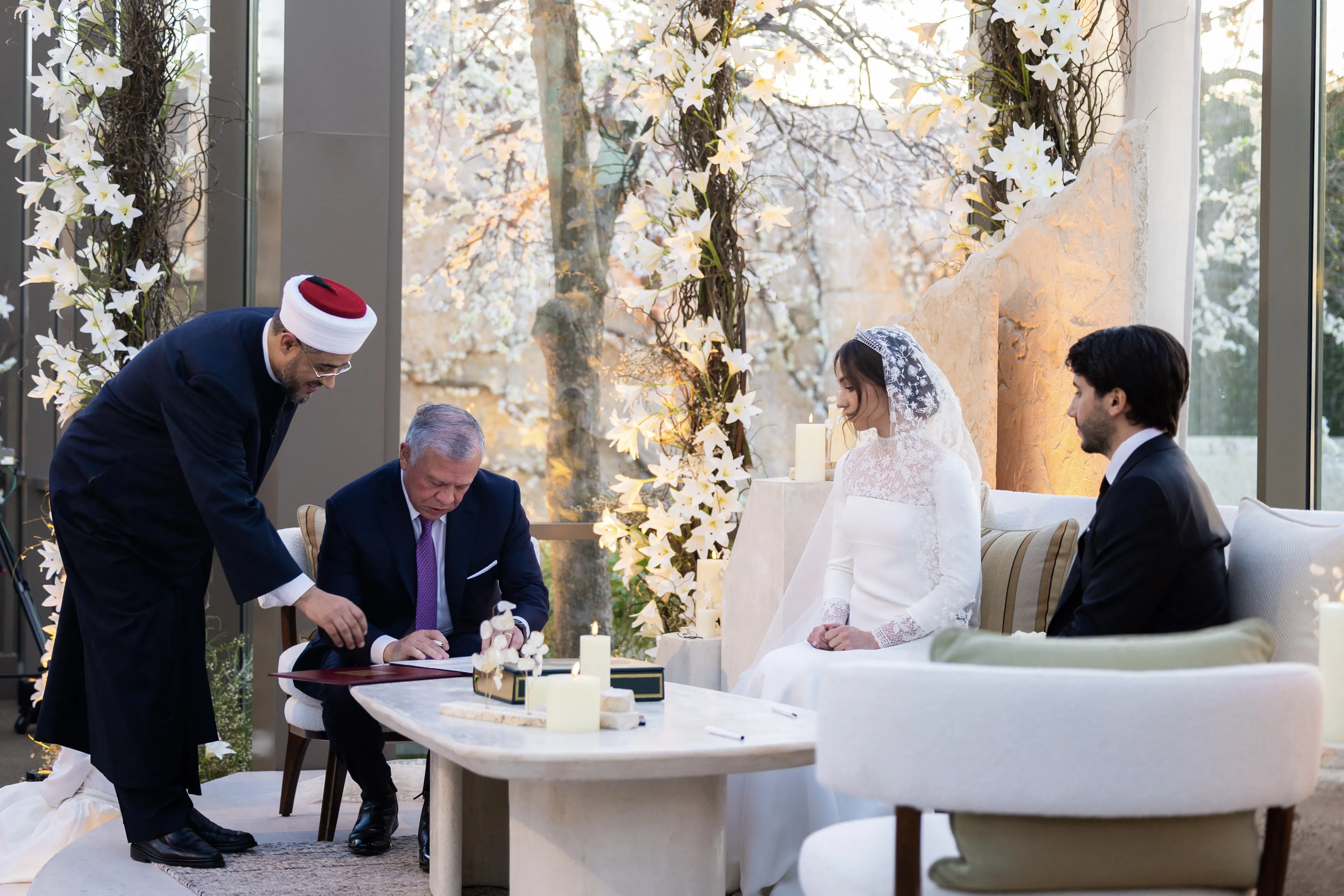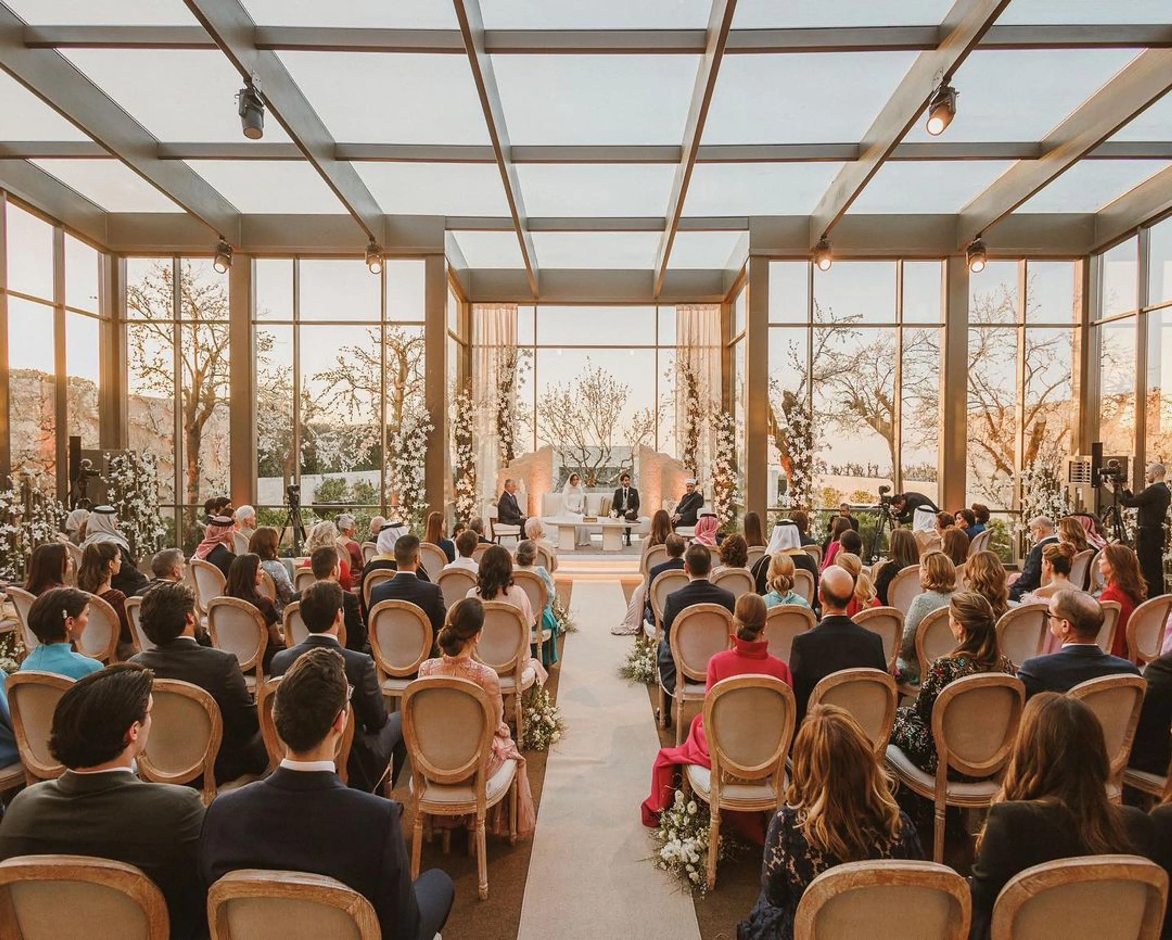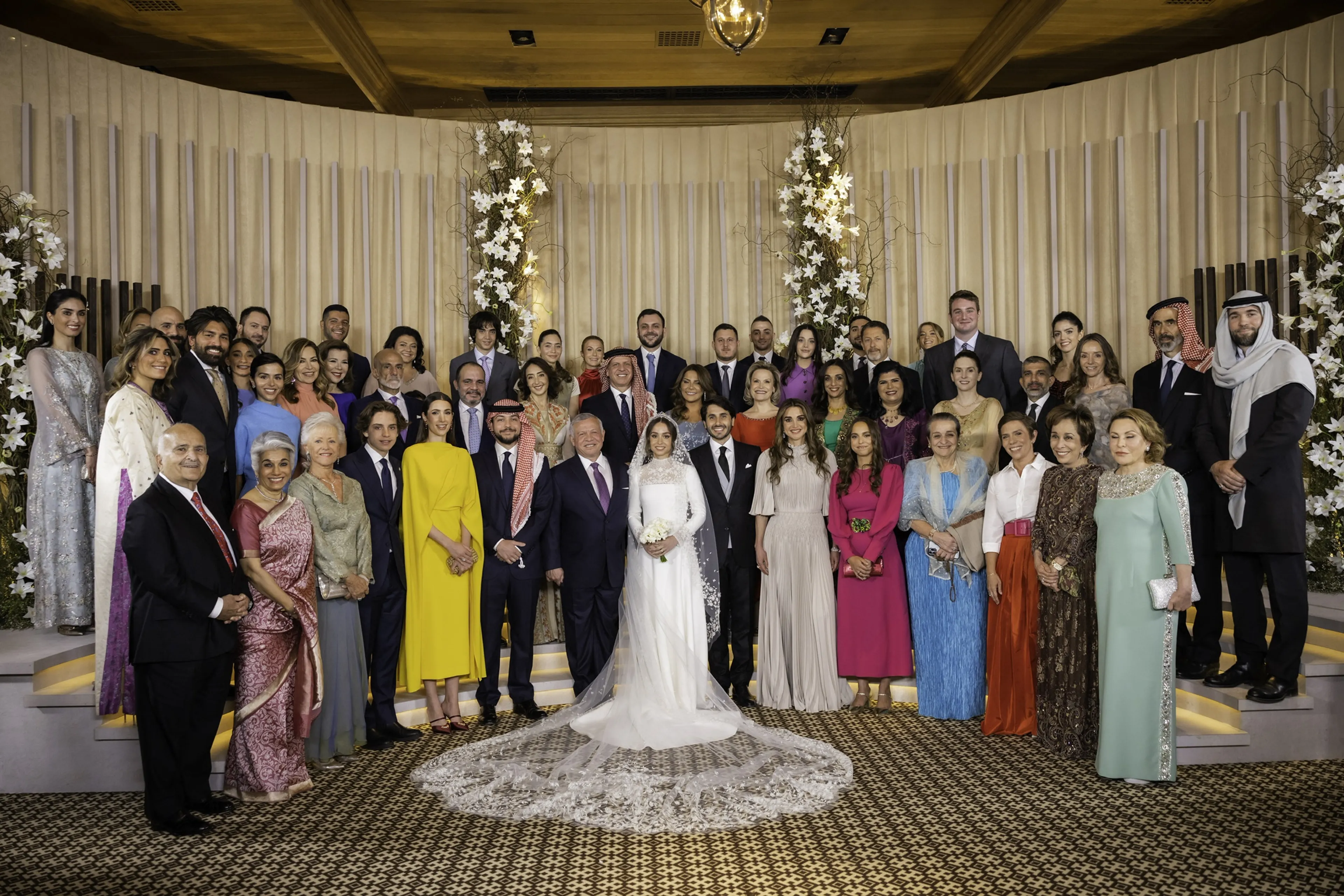 De bruid werd door haar oudere broer, kroonprins Hoessein, naar het altaar begeleid. Daar gaf koning Abdullah zijn dochter weg.