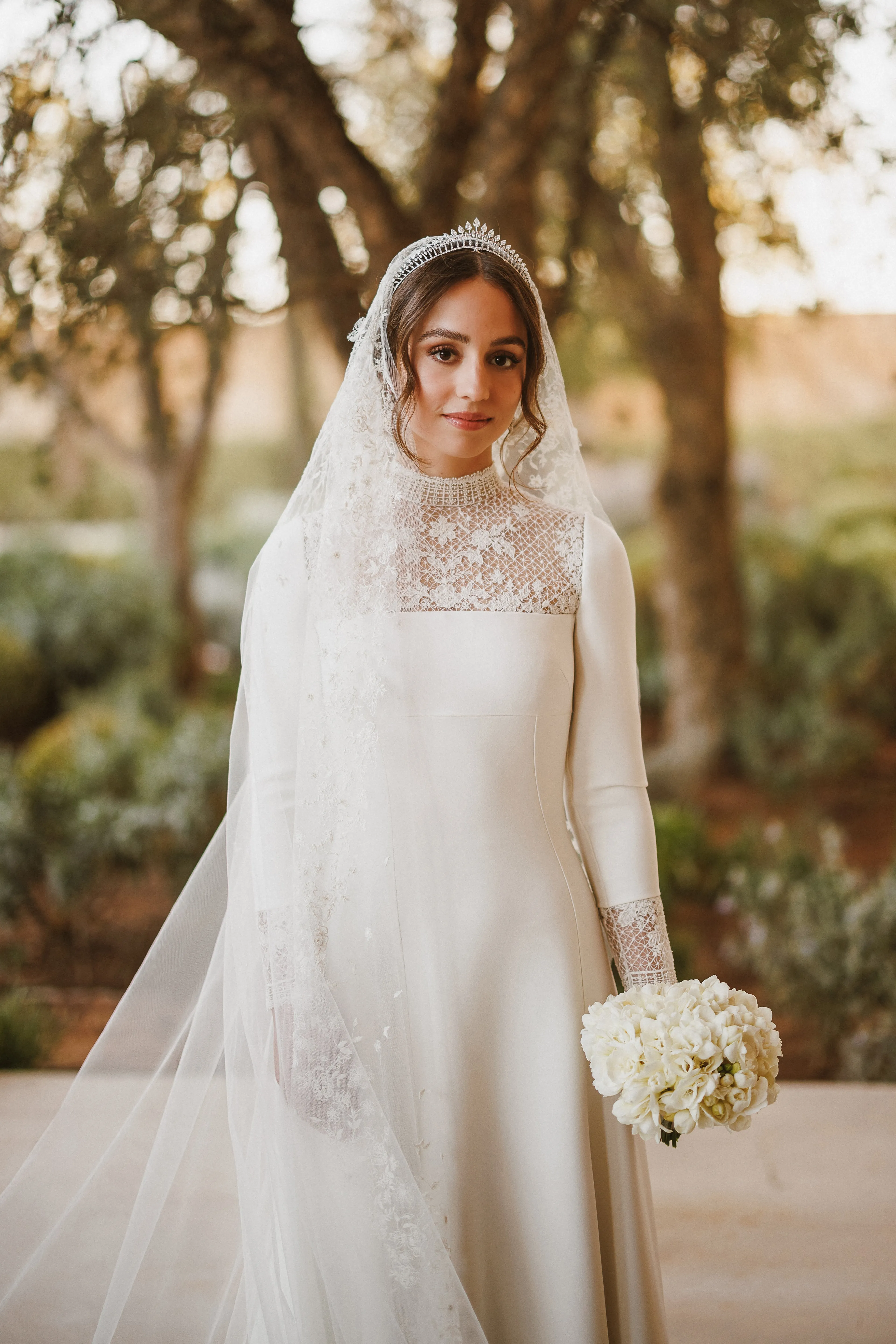 Iman koos voor een witte jurk met details van kant en een lange sleep. De tiara die ze droeg was volgens verschillende media van haar oma prinses Muna al-Hussein.
