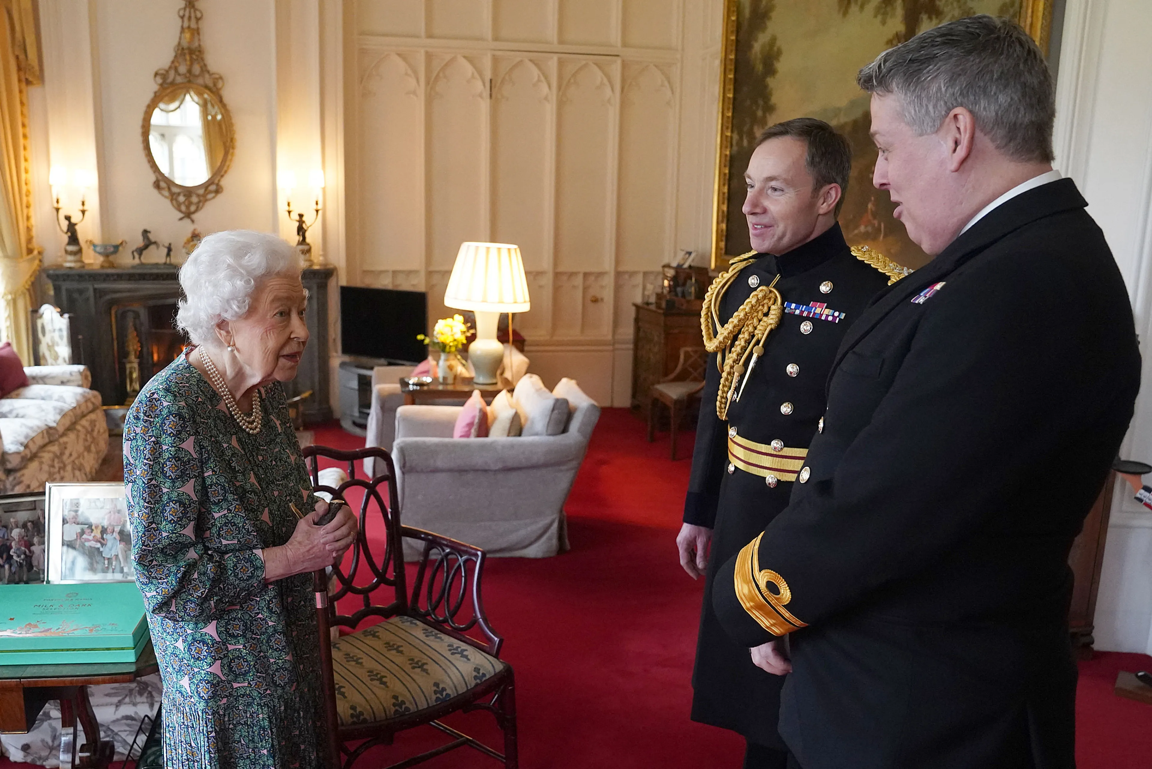 In de Oak Room van haar huis in Berkshire ontmoette de koningin zowel de vertrekkende als de nieuwe Britse minister van Defensie. Bij de bijeenkomst met James Macleod en de nieuwe minister Eldon Millar droeg de 95-jarige monarch geen mondkapje. Ook liep zij opnieuw met een wandelstok.