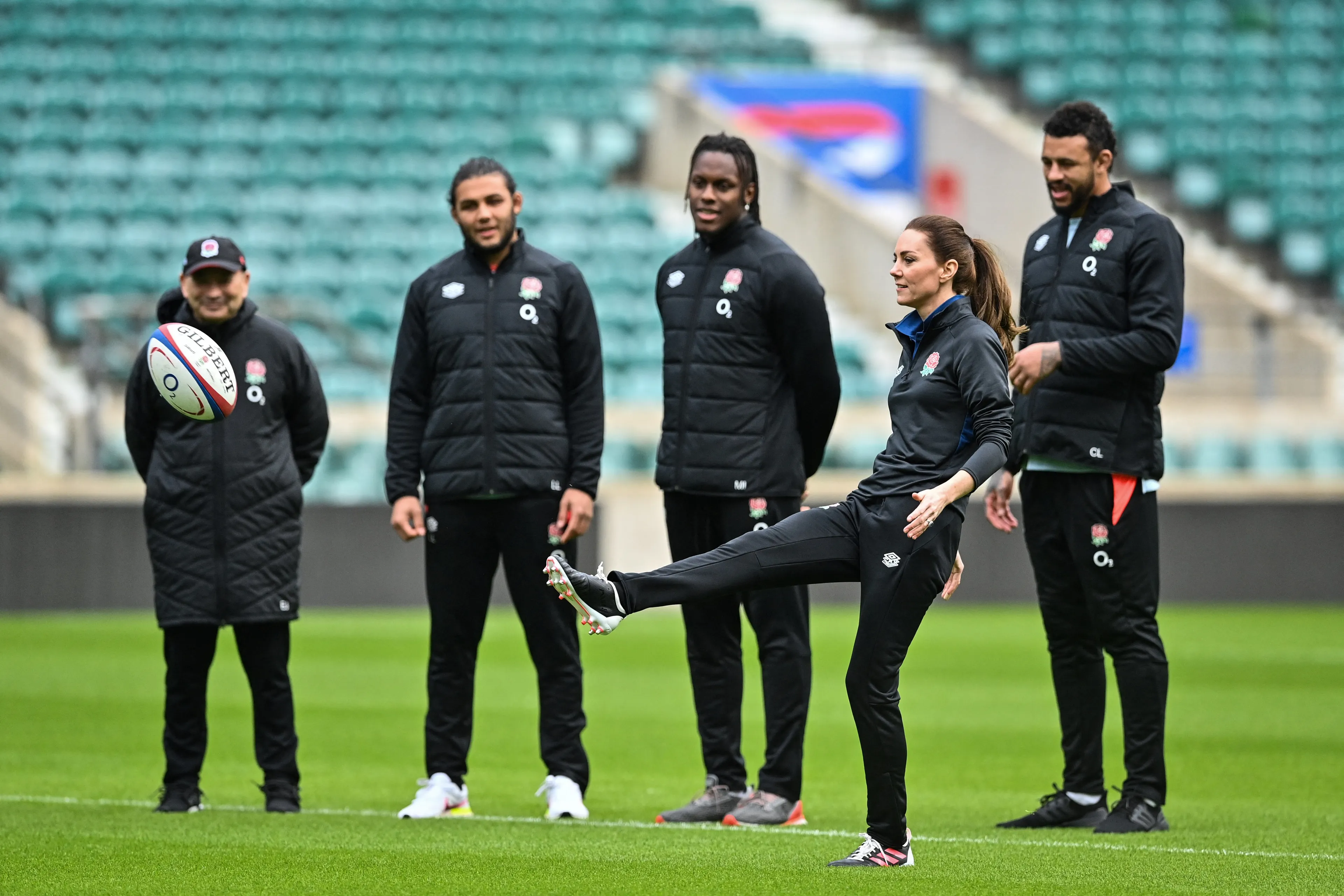 De prinses van Wales laat vaker haar sportieve kant zien tijdens werkbezoeken.Vorig jaar, bij een bezoek aan een trainingssessie van Engelse rugbyteams, deed ze actief mee met de training. Kate is beschermvrouwe van de Rugby Football Union en de Rugby Football League. Een taak die ze vorig jaar heeft overgenomen van prins Harry.