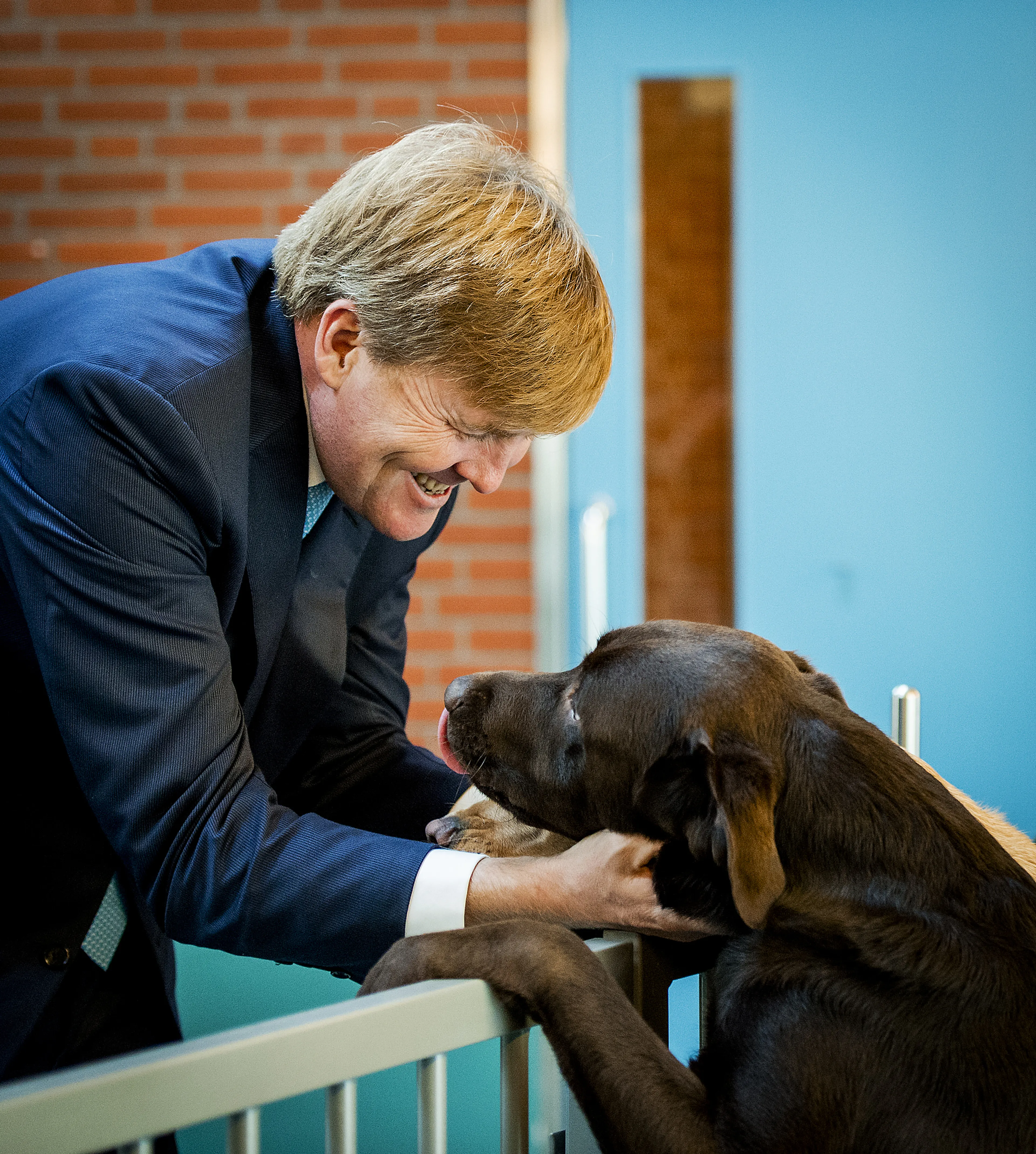 De koning heeft een zwak voor honden. Dat is duidelijk te zien tijdens zijn bezoek aan KNGF Geleidehonden. Als trotse eigenaar van drie trouwe viervoeters kan hij het dan ook niet laten om de dieren even aan te halen. “Hebben jullie genoeg beelden zo?” grapt hij naar de pers, maar de koning lijkt zelf geen genoeg te kunnen krijgen en knuffelt nog rustig even door.