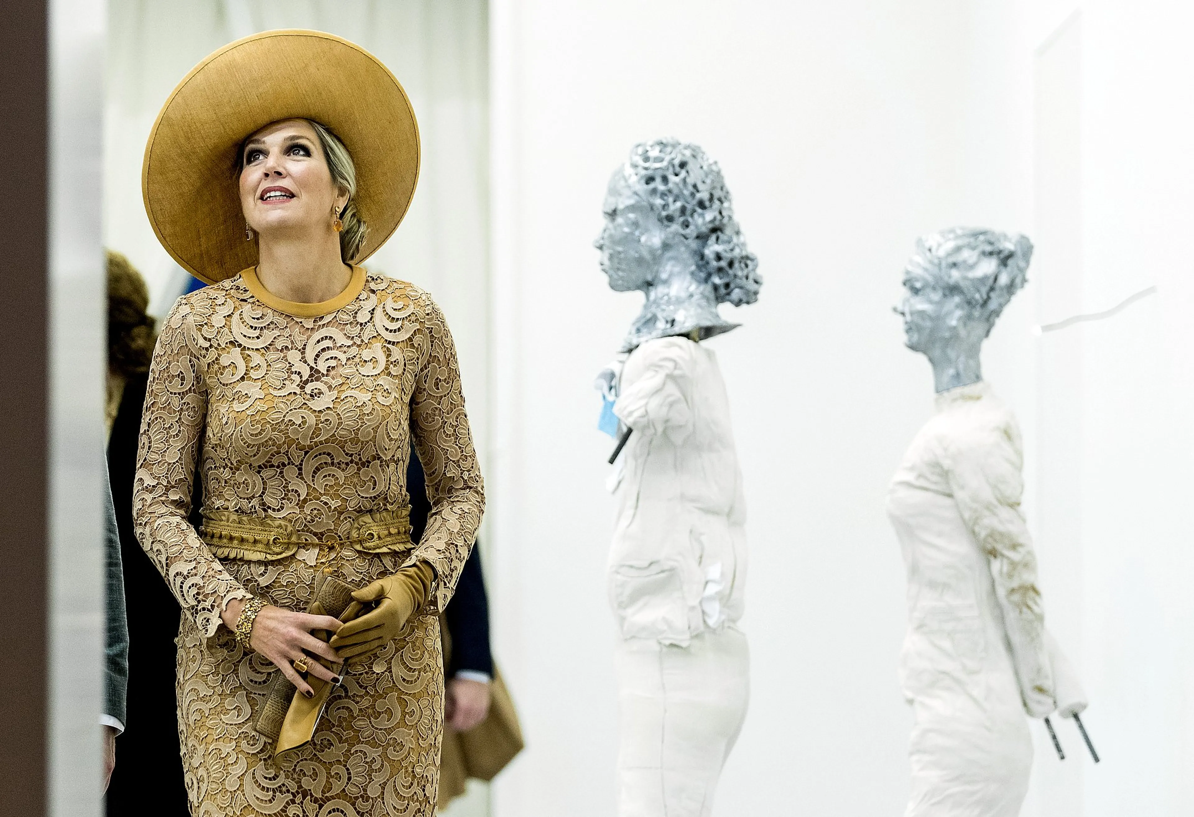 Voor haar derde bezoek van de dag koos Máxima voor een kledingwissel. Voor haar eerste twee bezoeken bestond haar outfit uit een broekpak van auberginekleurige wol van modehuis Natan. Die bevat enkele bijzondere details. De kleding heeft een asymmetrisch ceintuur bij de heup en een brede omslag bij de pantalon. Twee elementen die uit de wintercollectie van het Belgische modehuis komen. In de middag droeg Máxima vervolgens een wollen mantel en kanten japon van Claes Iversen, gecombineerd met een goudkleurige relevé.