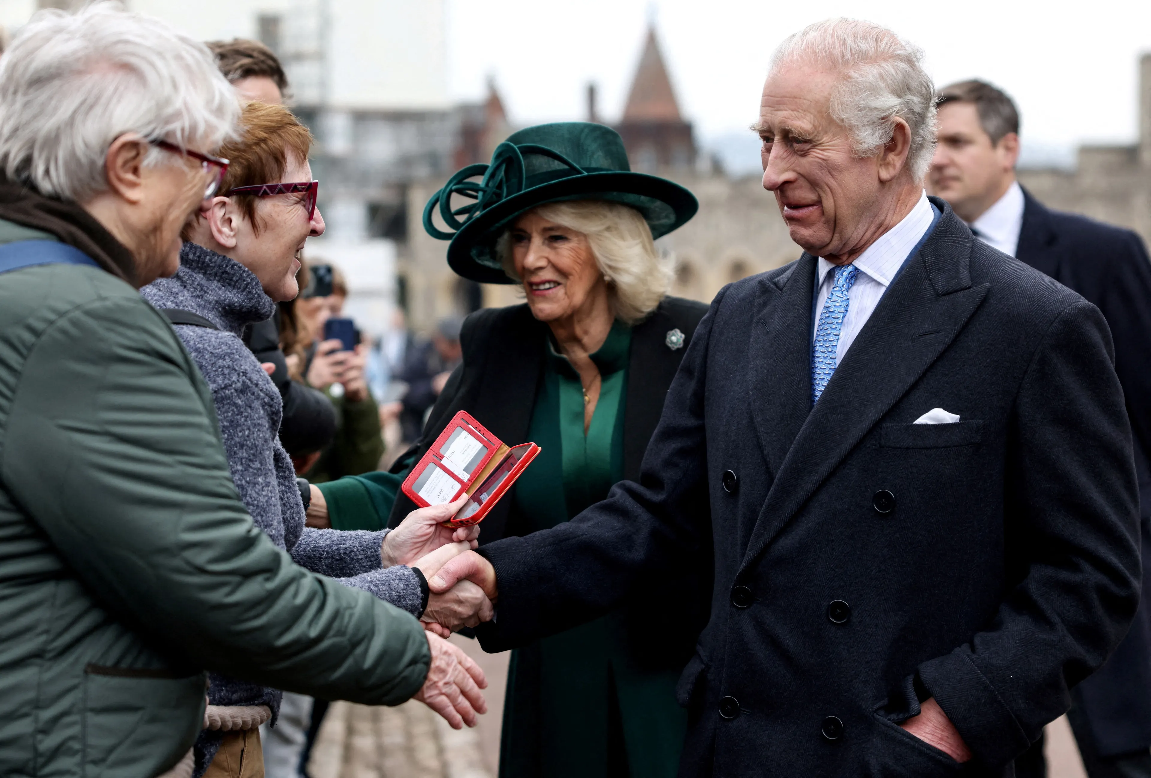 Na het bijwonen van de paasmis neemt koning Charles de tijd om het wachtende publiek te groeten. Samen met zijn vrouw koningin Camilla maakt hij een praatje met de mensen op de eerste rij en schudt hij handen. Artsen hadden Charles geadviseerd om tijdens zijn behandeling het contact met mensen te beperken. Dat weerhield de Britse vorst er niet van toch naar het toegestroomde publiek te gaan. Velen wensen Charles beterschap en een vrolijk Pasen toe, zo melden Britse media.