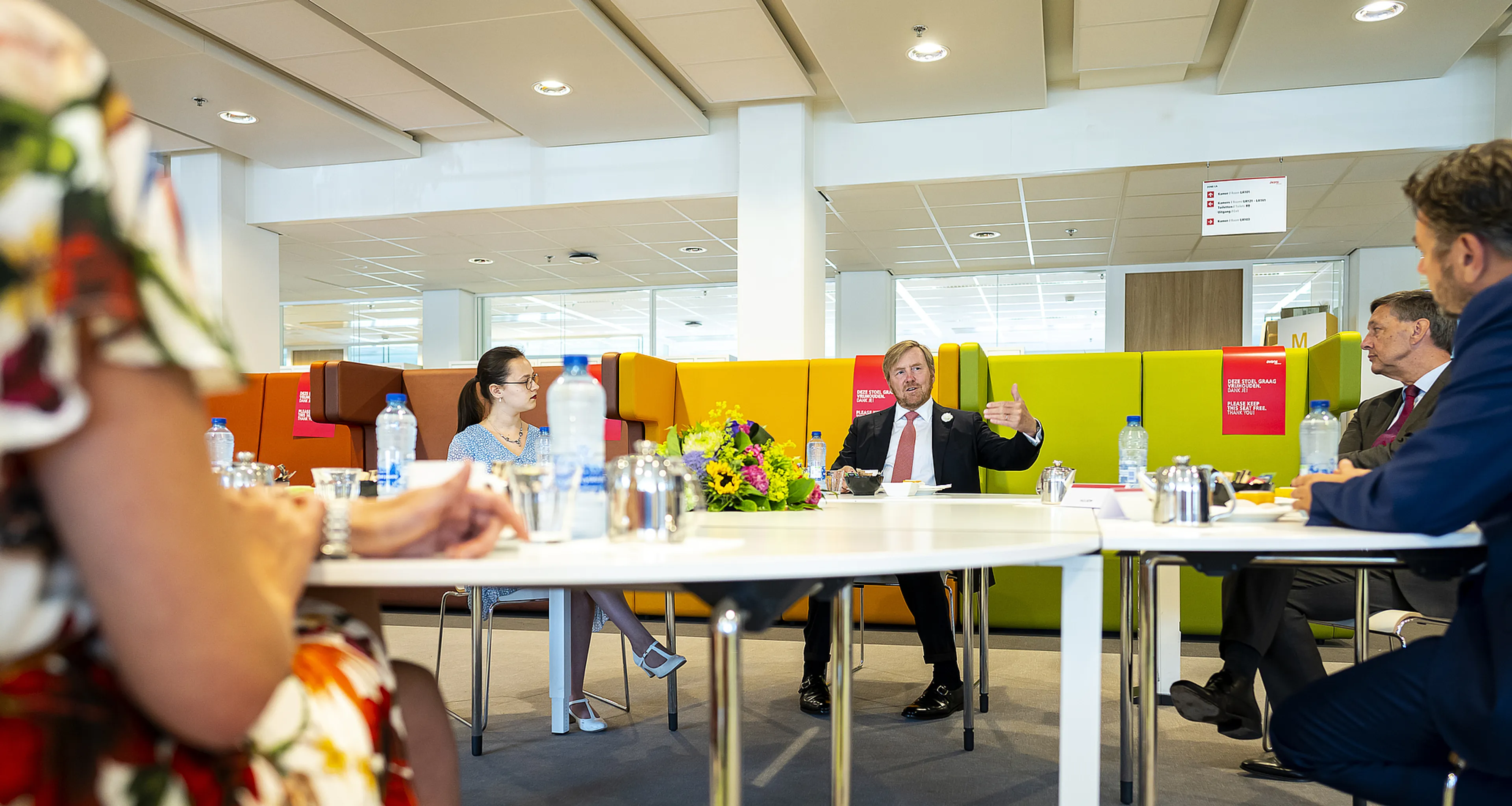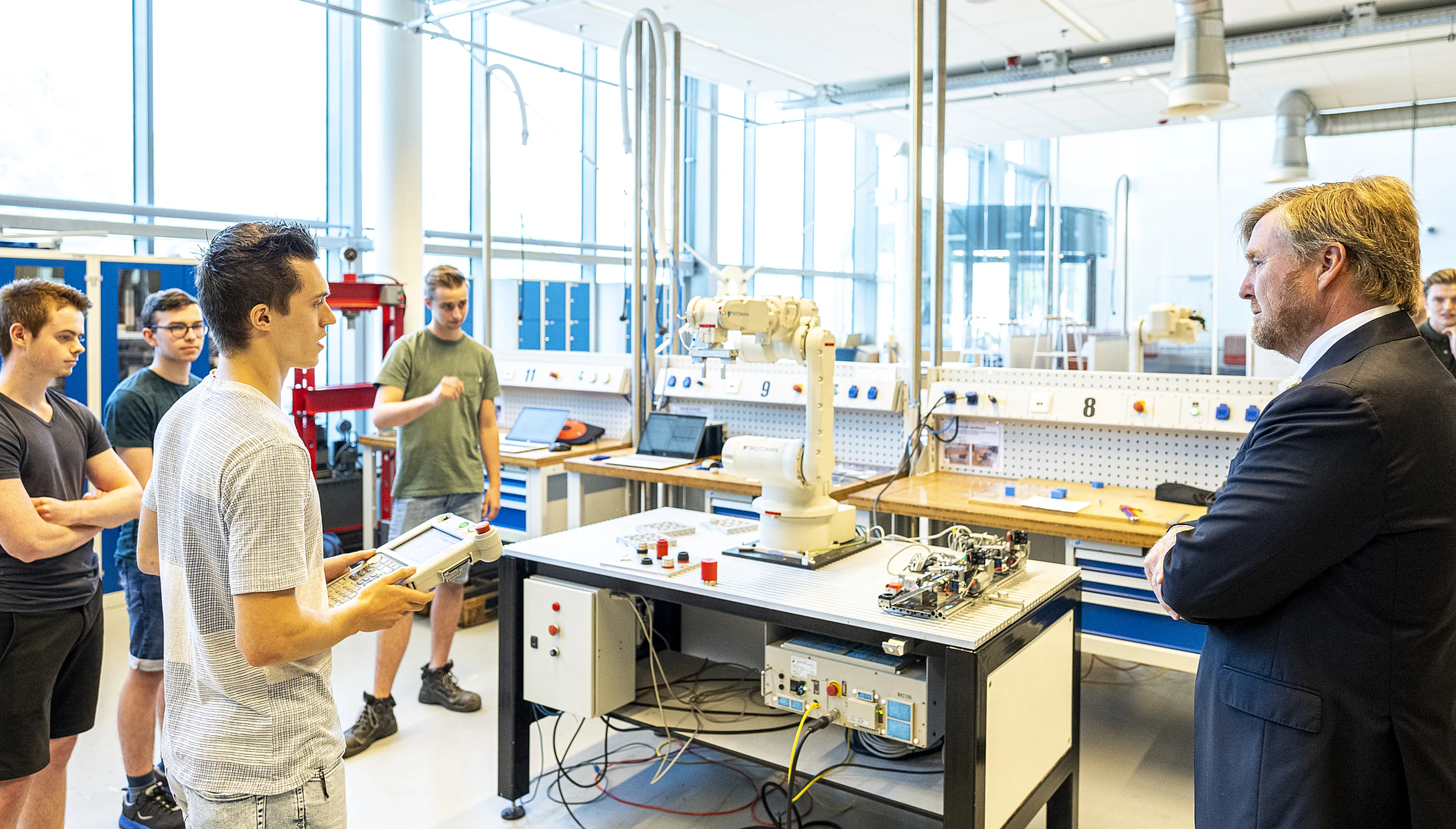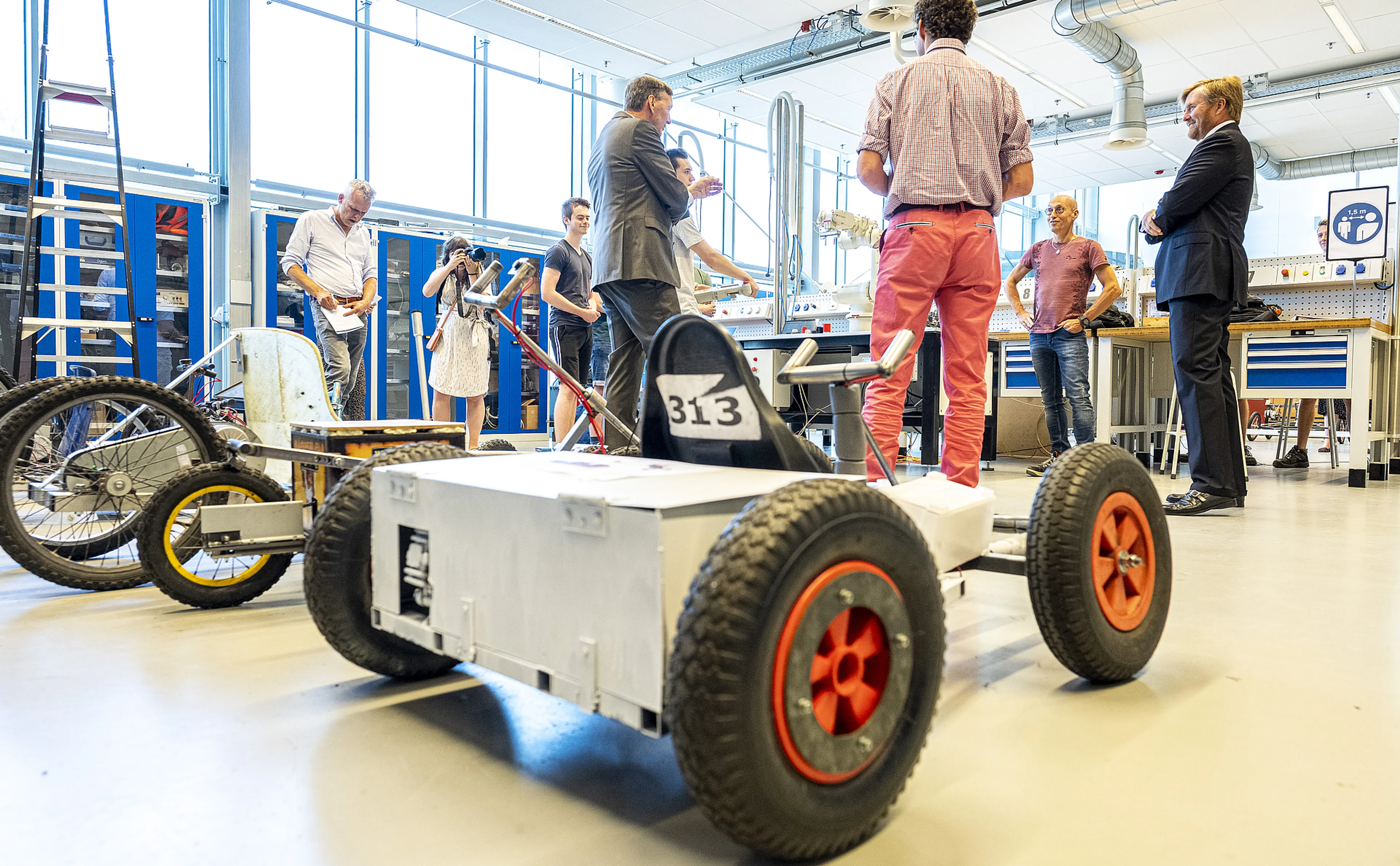 De middag startte in een organisch lab en de werkplaats Mechatronica van de hogeschool. In labjas en met een veiligheidsbril ging de koning met studenten in gesprek en hoorde hij hoe zij het onderwijs op afstand en de gedeeltelijke terugkeer naar school ervaren. Daarna sprak Willem-Alexander met betrokkenen over de inrichting van het online-onderwijs en hoe praktijkonderwijs, met inachtneming van de RIVM-richtlijnen, in zijn werk gaat.