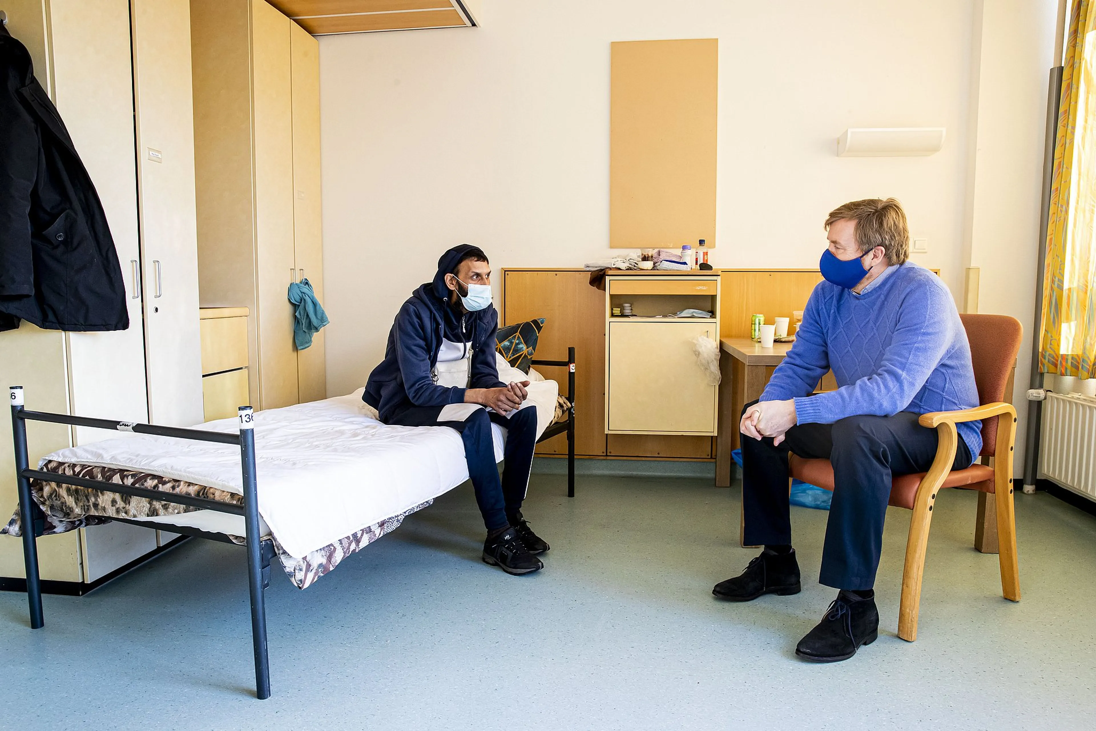 De koning sprak met Erik in zijn kamer, maar ook met medewerkers van de opvang. Erik (49), die in 1979 van Suriname naar Nederland kwam, verbleef nu een week in het Haagse Lozerhof, een voormalig verzorgingshuis dat sinds november een tijdelijke herbestemming heeft gekregen. "Het bevalt me hier goed, maar overdag ga ik naar buiten. Want ja, hier is verder niks te doen."