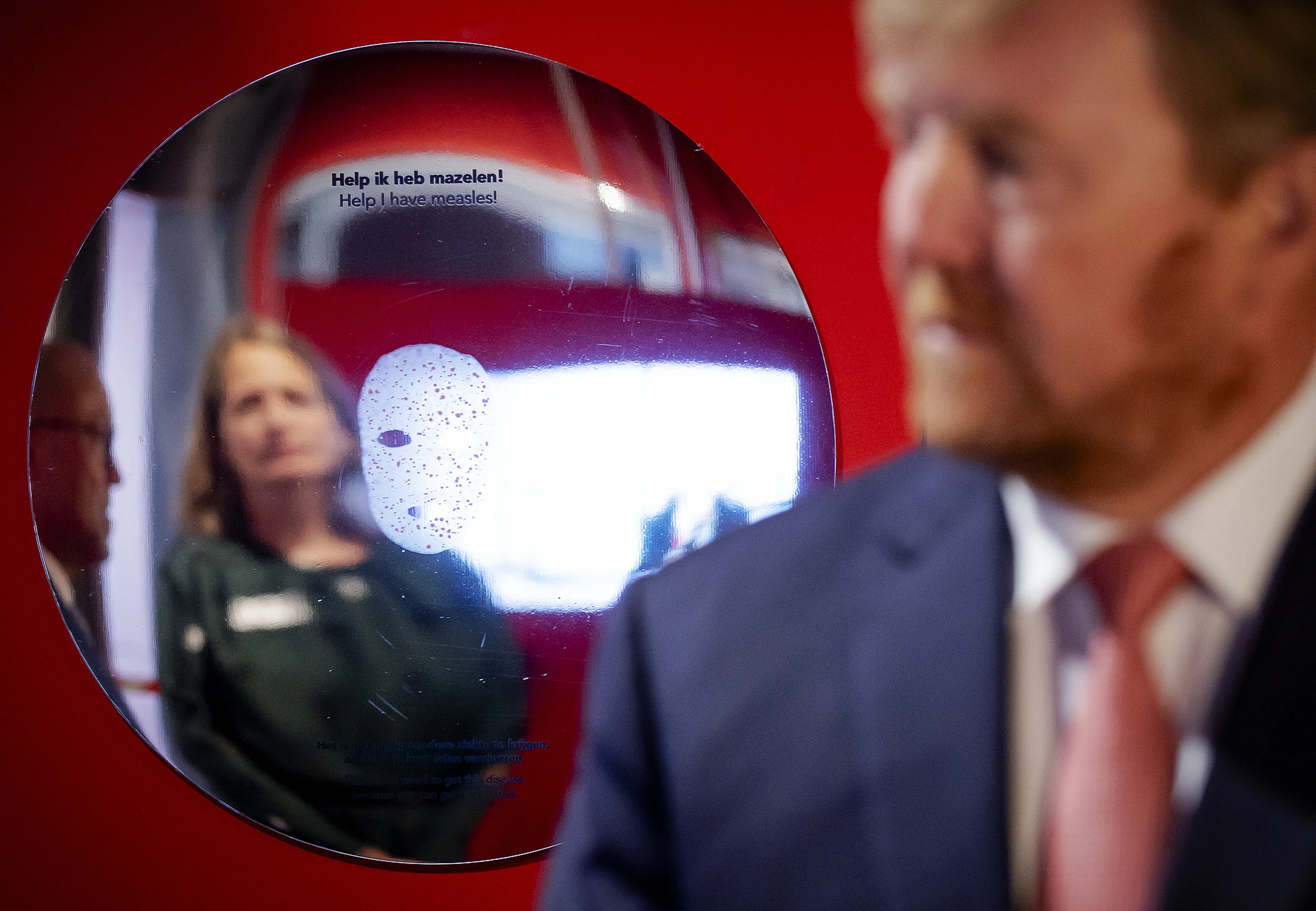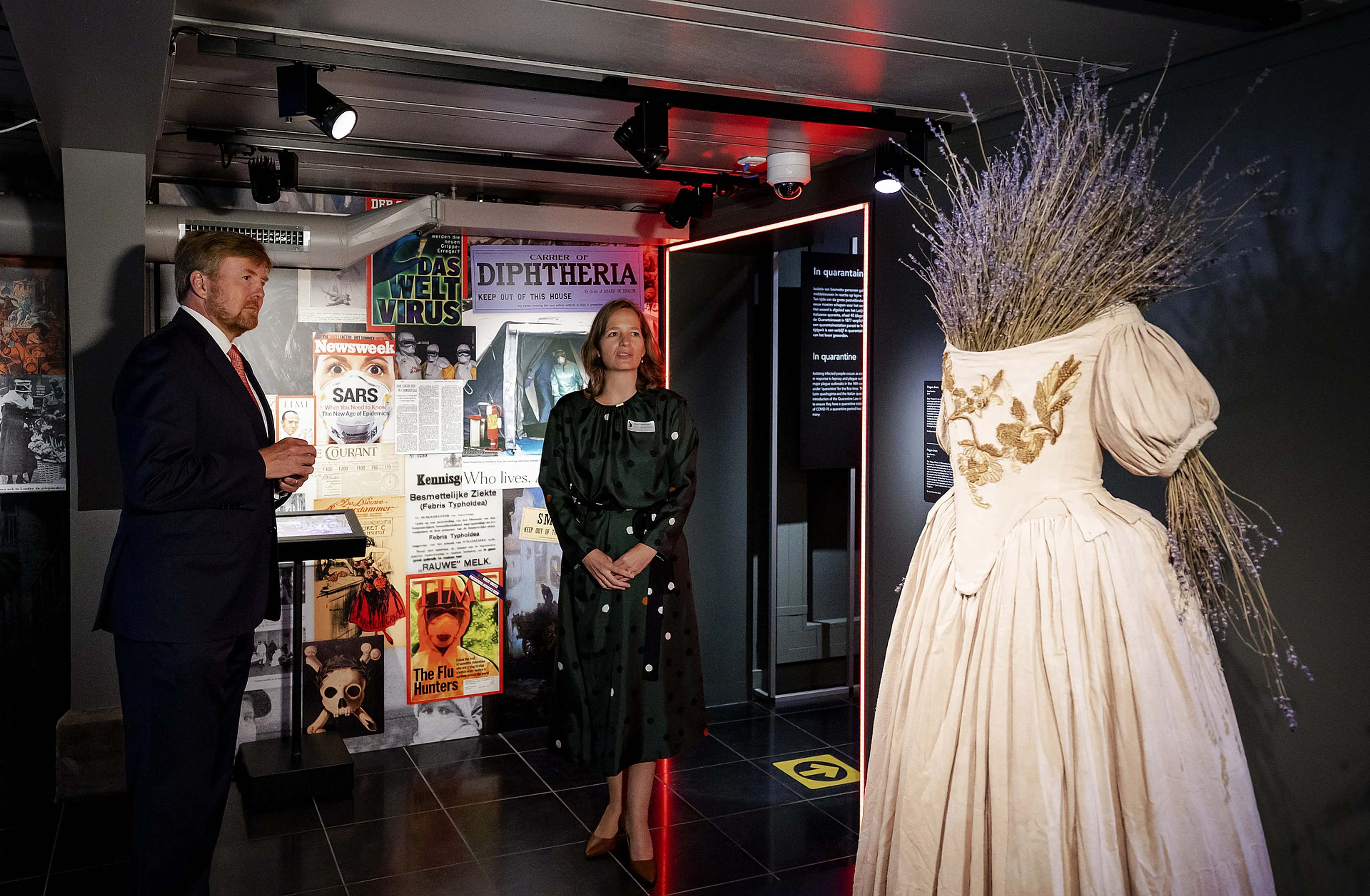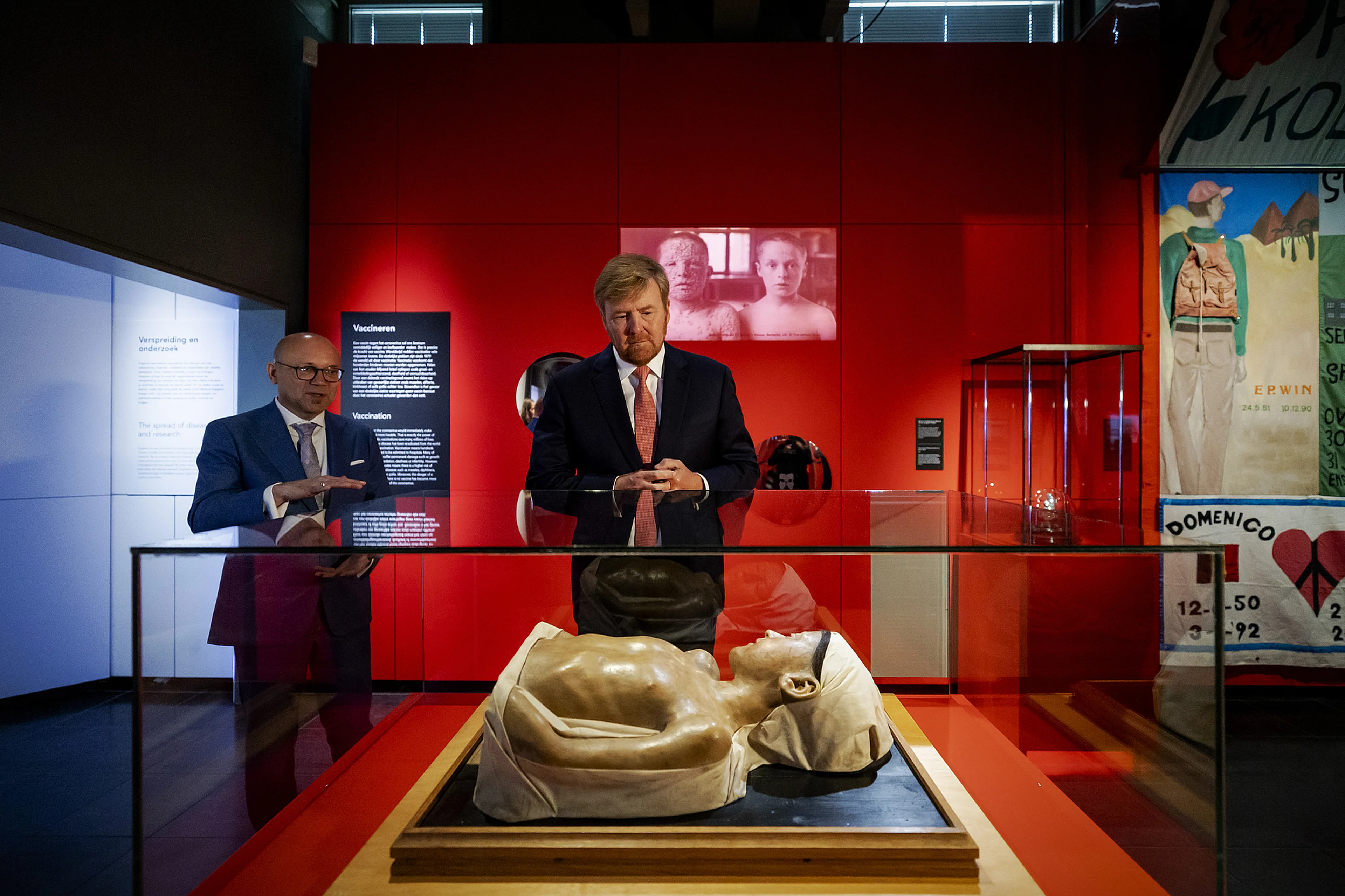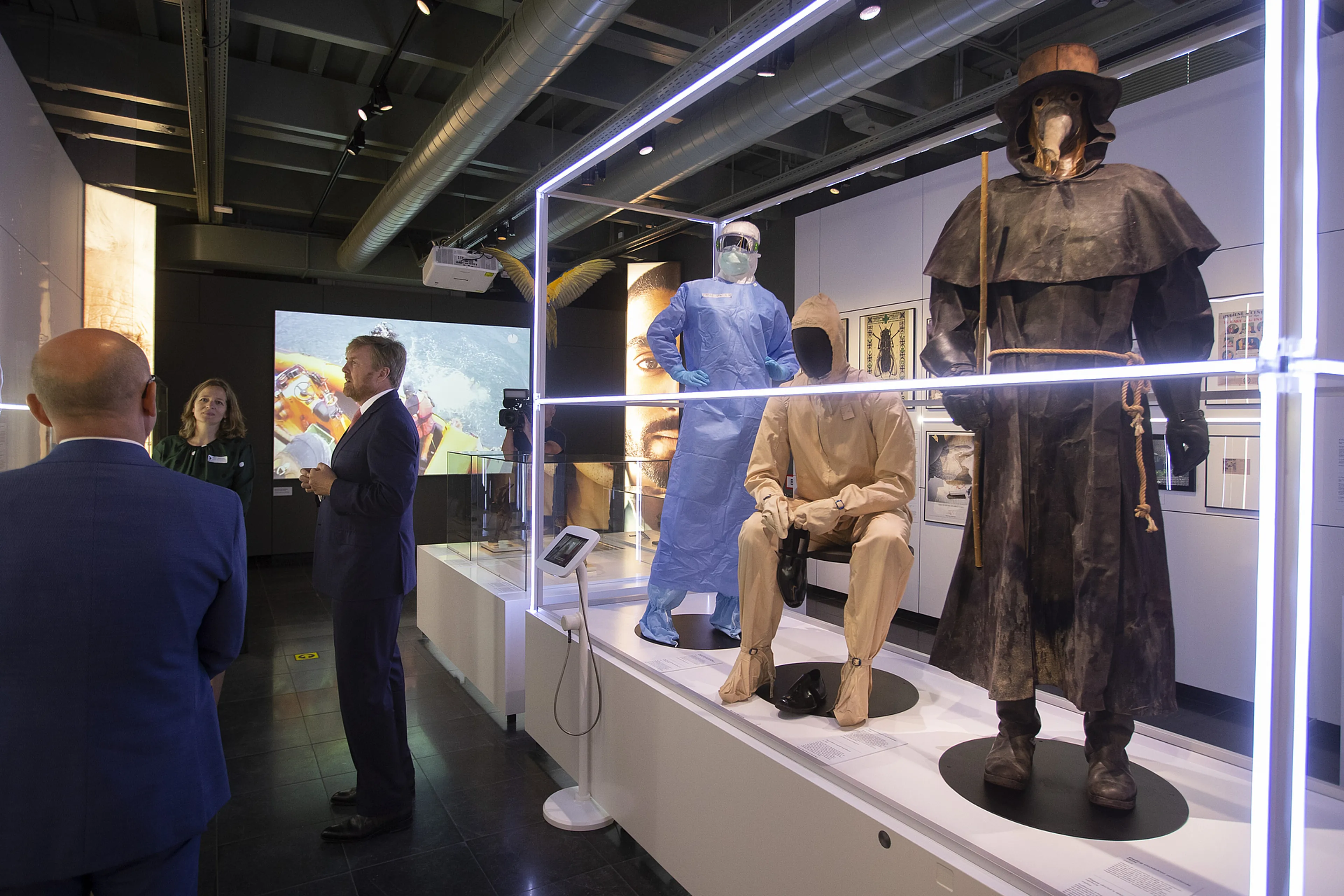 Koning Willem-Alexander heeft donderdagmiddag met drie maanden vertraging vanwege de coronacrisis in het Leidse museum Boerhaave de tentoonstelling 'Besmet!' geopend. Hij deed dat door de expositie als eerste te bezoeken.