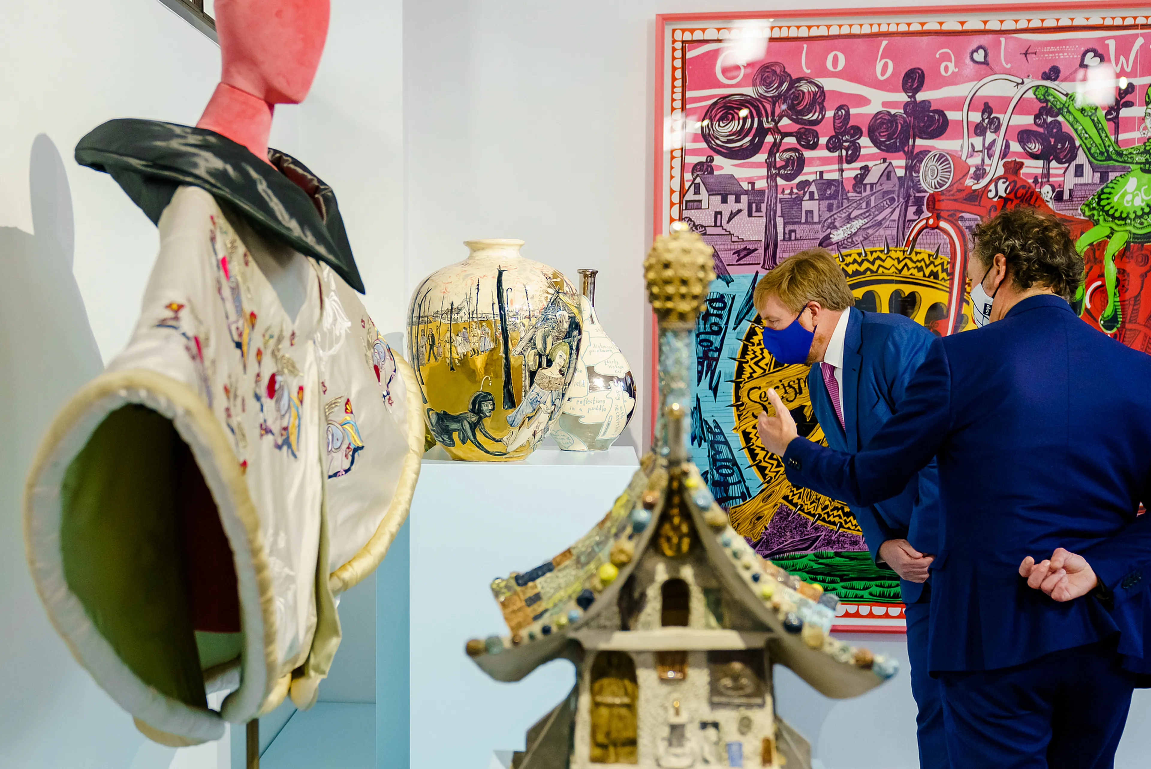 Koning Willem-Alexander heeft donderdagmiddag op aangepaste wijze de Britse beeldend kunstenaar en schrijver Grayson Perry de Erasmusprijs uitgereikt. Dat deed hij via een videoverbinding vanuit Kunstmuseum Den Haag, waar hij ook een kleine expositie met werk van Perry bekeek. "Dit zijn de versierselen die ik normaal gesproken zou omhangen", vertelde de koning.