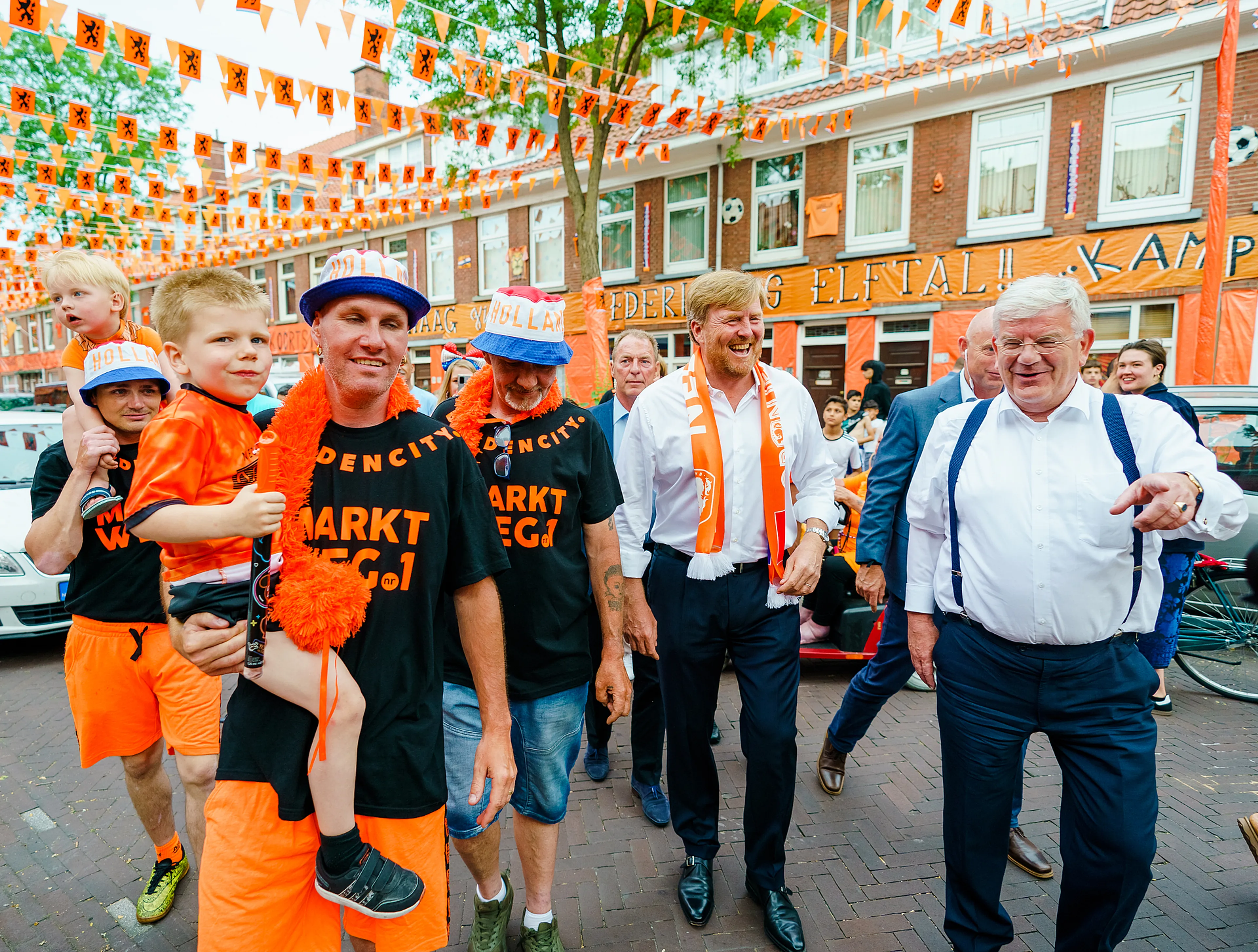 Koning Willem-Alexander heeft donderdagavond, vlak voor de tweede wedstrijd van het Nederlands elftal op het EK voetbal, een verrassingsbezoek gebracht aan de Haagse Marktweg. De straat werd begin deze maand na een wedstrijd uitgeroepen tot 'Mooiste Oranjestraat van Nederland'.