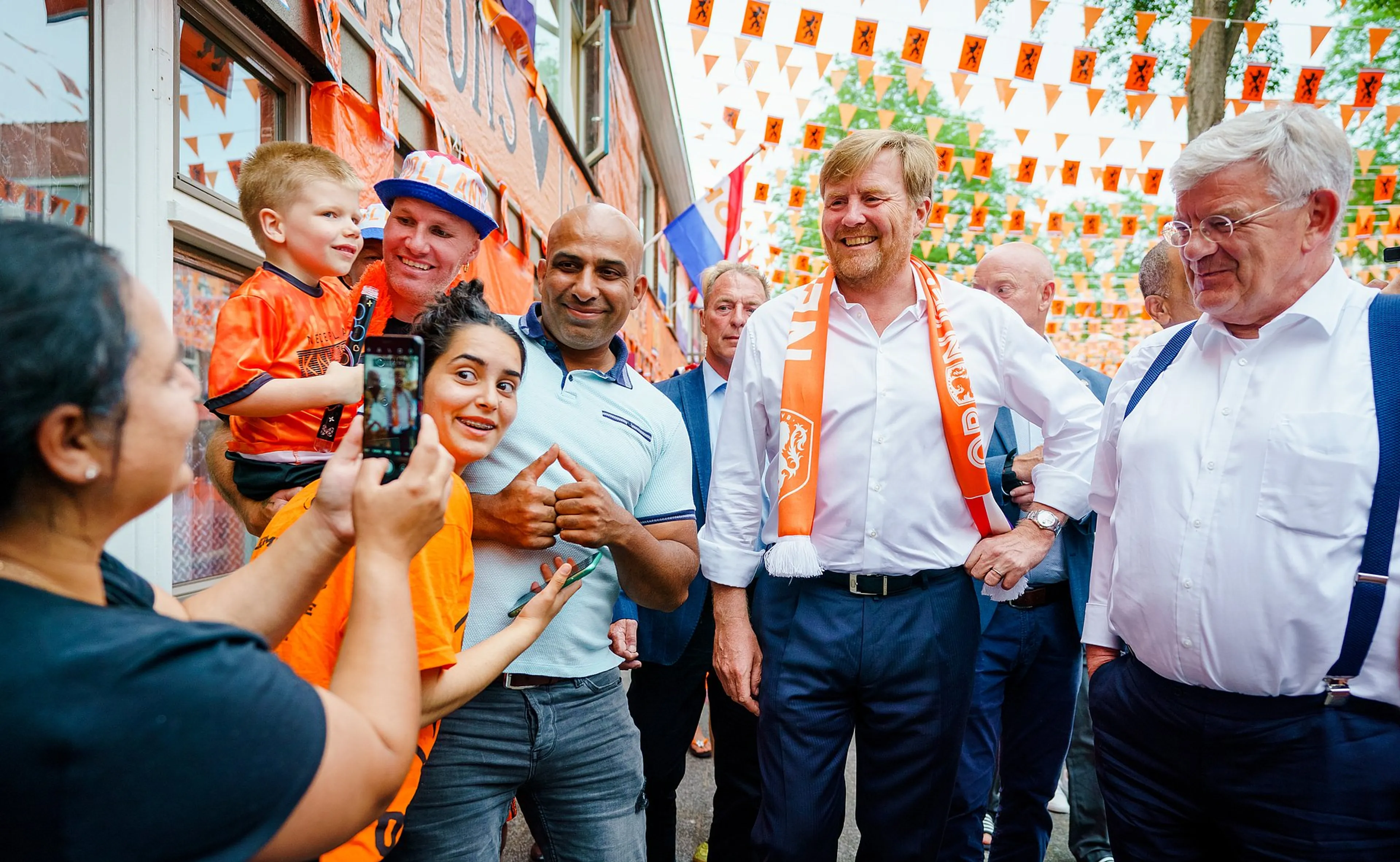 Van anderhalve meter afstand houden was meteen geen sprake meer, maar daarvan was in de wijk al vaker geen sprake en bij het gezamenlijk kijken naar de wedstrijden van het andere Oranje al helemaal niet. Willem-Alexander, die de regel het afgelopen jaar heel streng handhaafde, paste zich aan en stortte zich in de menigte die zich meteen rondom hem heen vormde.