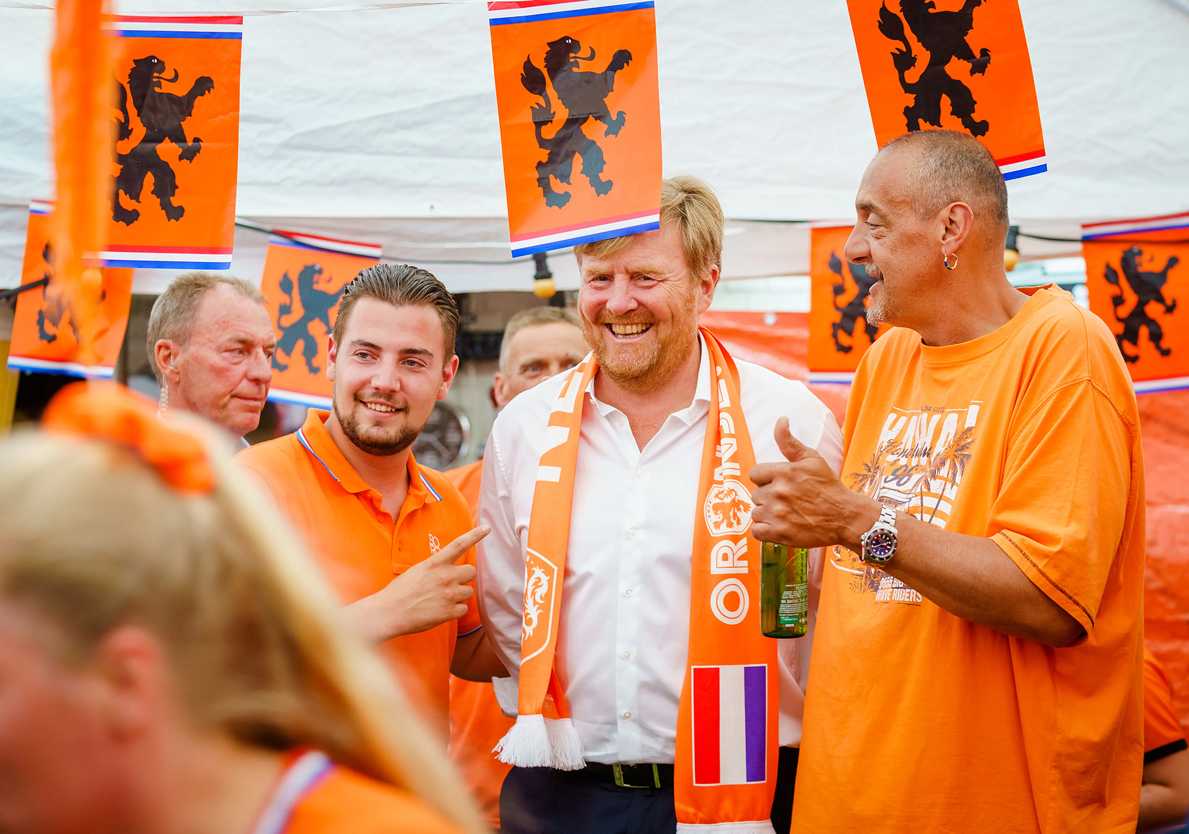 Het moest dit jaar nog groter, nog uitbundiger kreeg hij te horen. "De passie en creativiteit spatten er vanaf. Hier zijn spijkers met koppen geslagen", aldus het oordeel van de jury. De koning nam ook een kijkje in de tuin van een van de initiatiefnemers, Raymond Zwennes, die daar kunstgras heeft neergelegd: een mooie plek om op het eveneens aanwezig grote scherm naar de EK-wedstrijden te kijken. Willem-Alexander kon wel zien dat hier veel plezier aan werd beleefd.