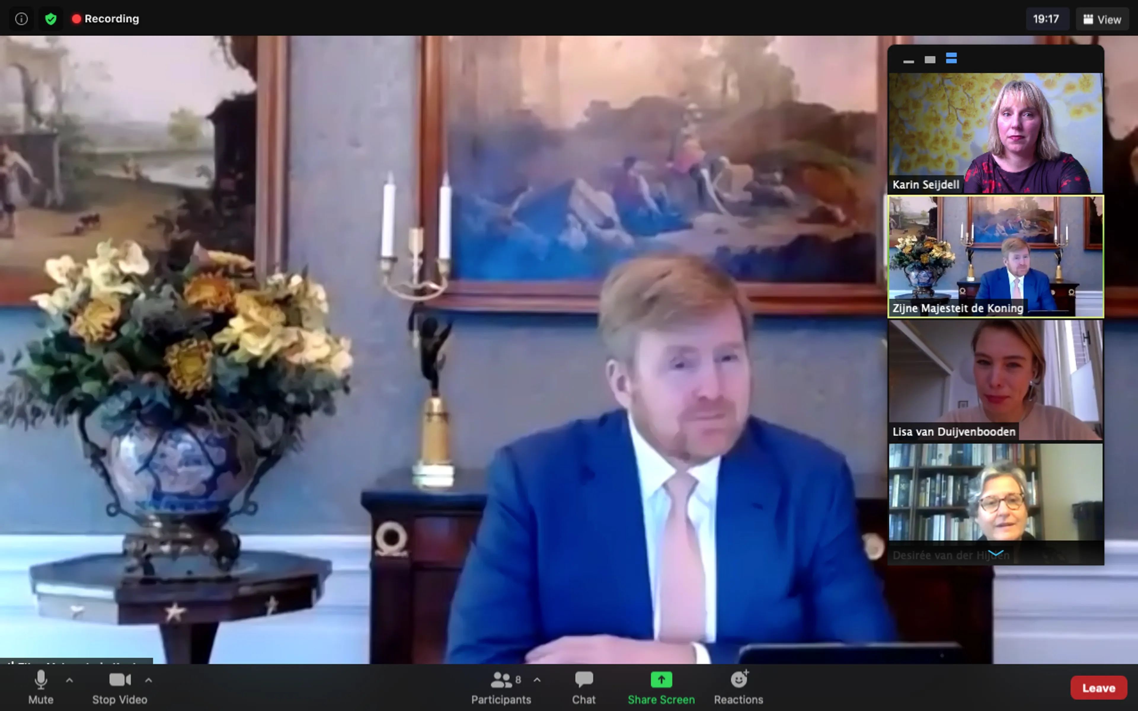 Koning Willem-Alexander heeft donderdag online een gesprek gehad met vertegenwoordigers van de Vereniging van Geestelijk Verzorgers (VGVZ). Hij vroeg hen naar hun werk in coronatijd en de impact van de crisis.