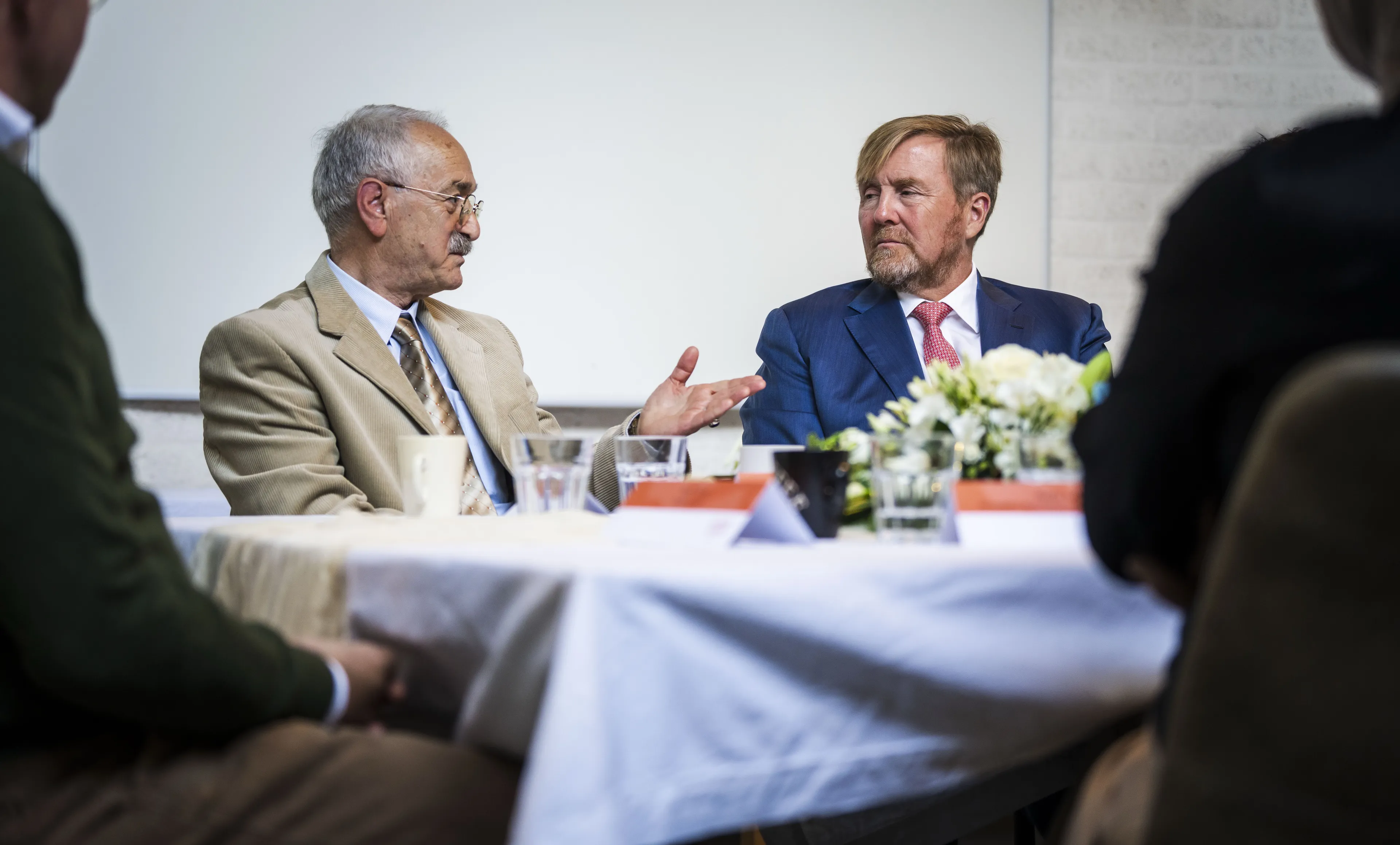 Bij een andere tafel ging de koning in gesprek met moeder en dochter, waarvan de moeder taallessen volgt bij het IDO en ook workshops bloemschikken geeft. Elke bloem heeft een betekenis, zo vertelde ze. Willem-Alexander was onder de indruk van de bloemen die op tafel staan en nam zelf het kaartje mee naar huis met de uitleg van alle bloemen.