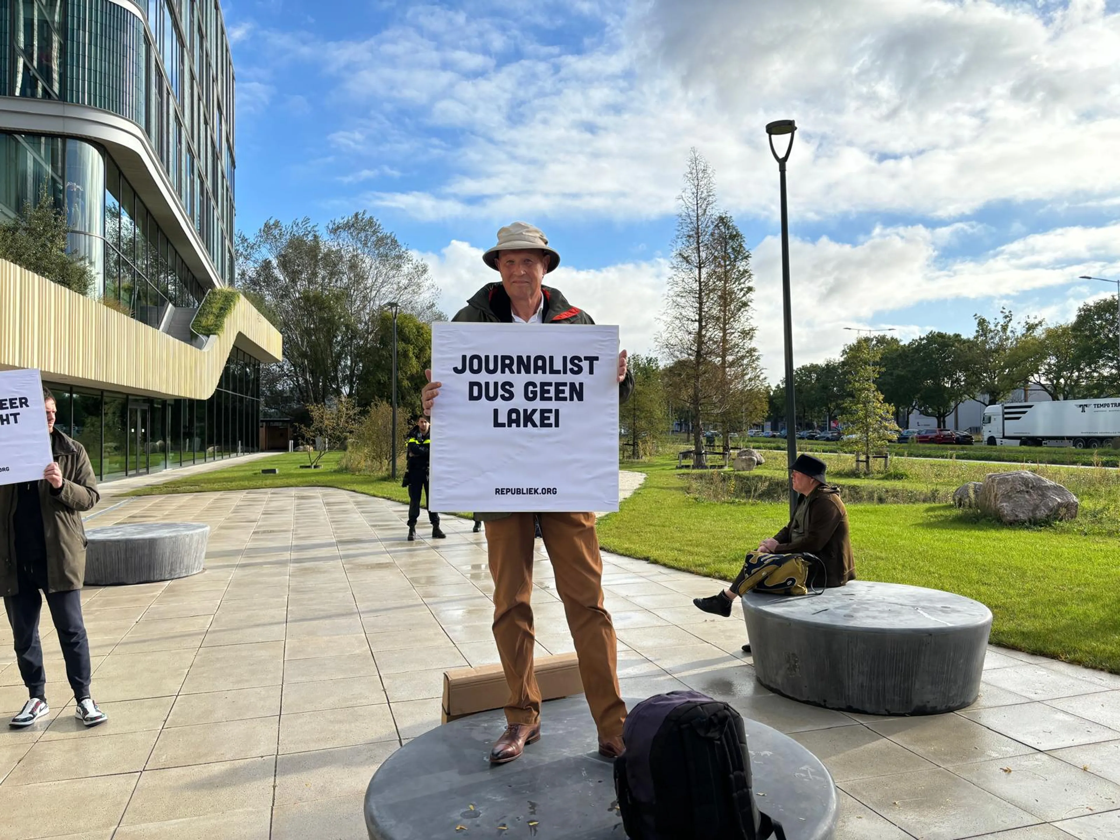 Het bezoek van de koning trekt deze ochtend veel bekijks, maar niet iedereen is blij met zijn komst. Anti-monarchiebeweging Republiek staat namelijk met zo'n acht personen voor de deur van het gebouw. Op borden staan teksten als 'journalisten zijn geen lakeien', 'weg met de mediacode' en 'controleer de macht'.