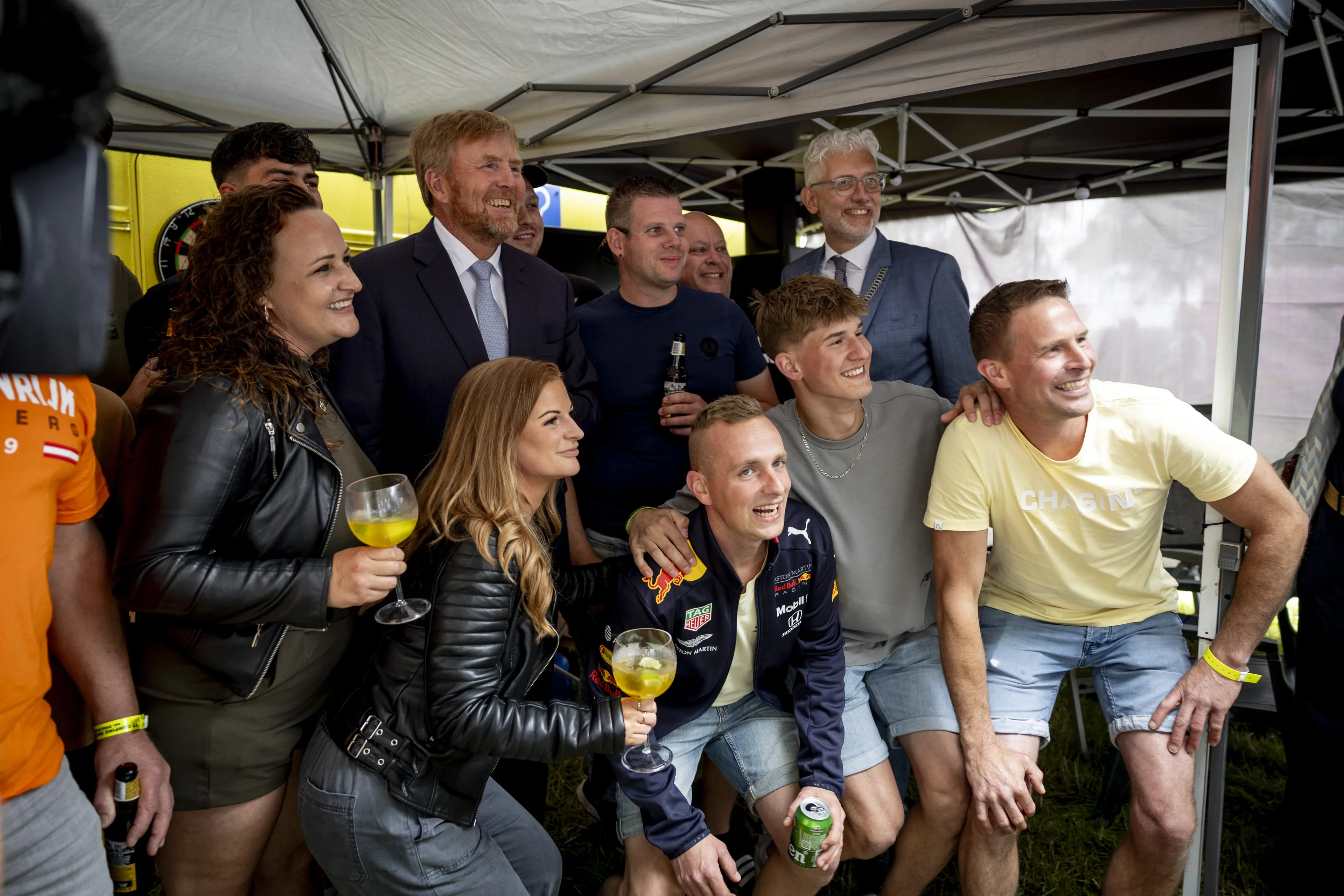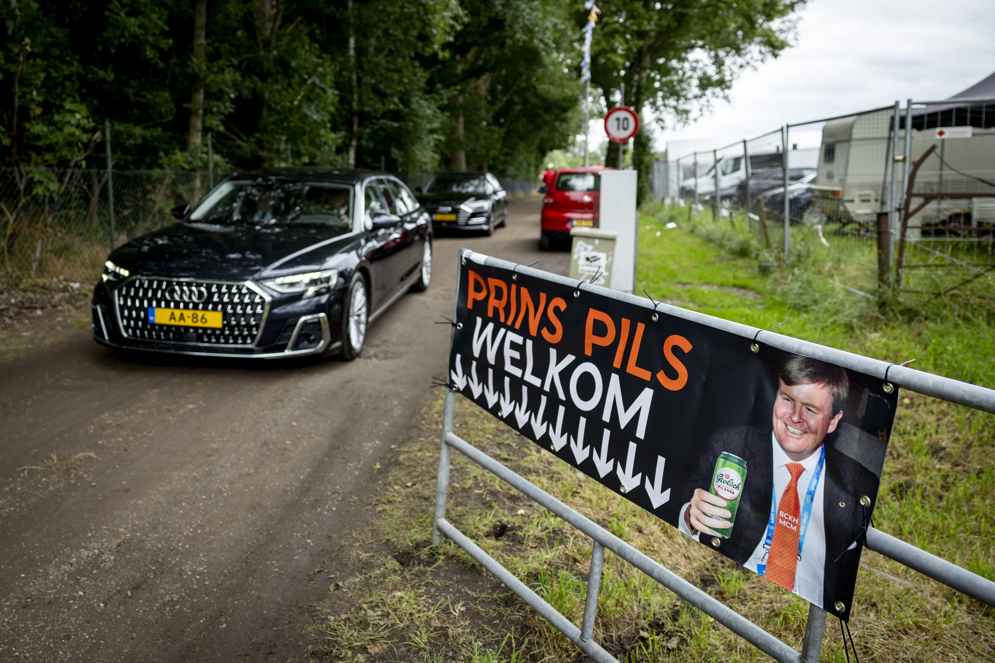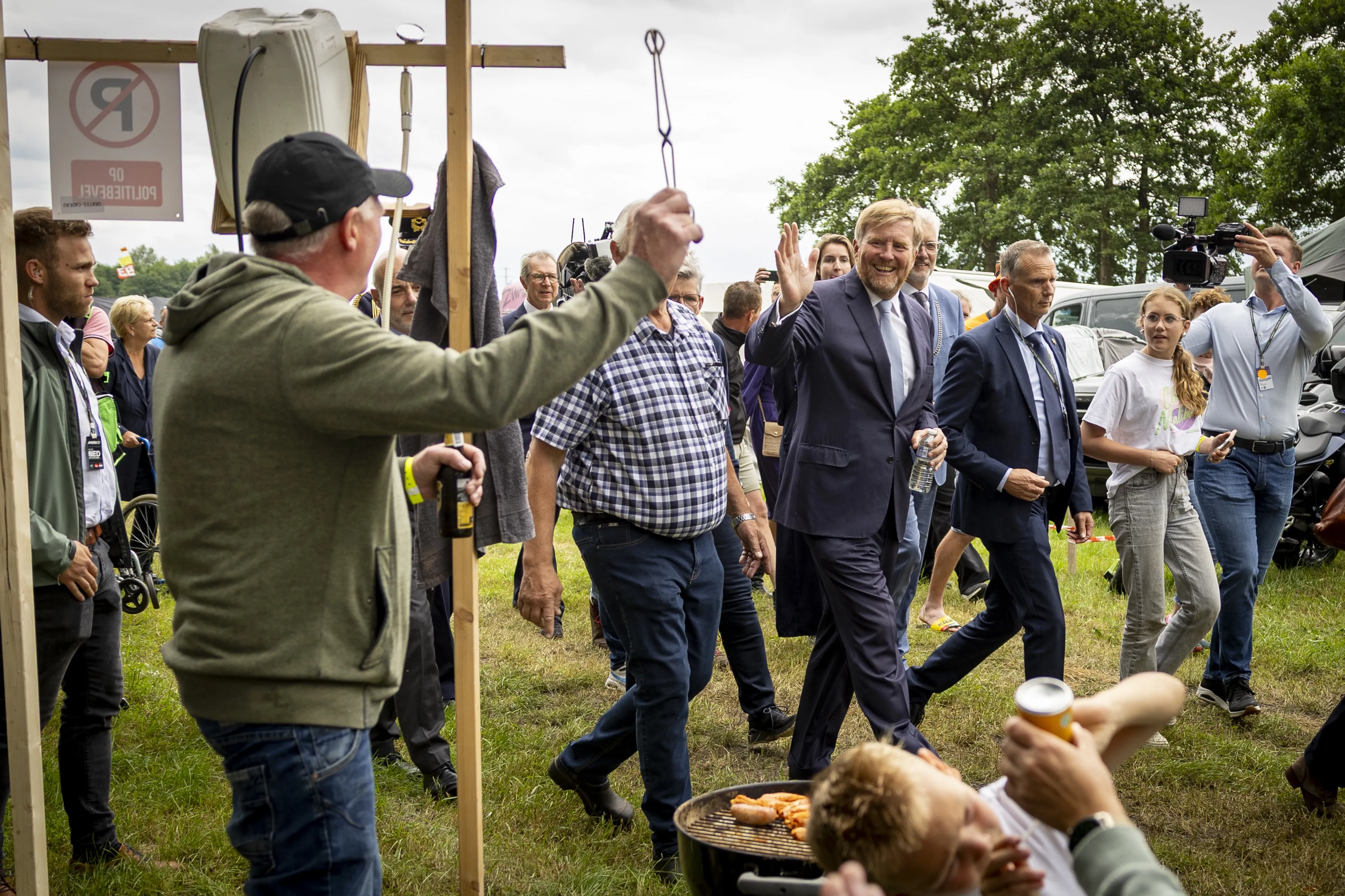 In de buurt van het circuit zijn dit weekend veel campings opgebouwd. Voor de optimale TT-ervaring kan een bezoek aan een naastgelegen camping niet ontbreken. Op camping Oostra wordt al gerekend op de komst van de koning, want er een spandoek met ‘Prins Pils, welkom’ bij de ingang. Samen met de campingeigenaar loopt koning Willem-Alexander een rondje over het terrein. Veel gasten willen graag een selfie maken met de koning. Bij een caravan knoopt hij een gesprek aan met de campinggasten. Die bieden Willem-Alexander een een biertje aan. “Het is nog vroeg”, grapt hij terwijl hij op zijn horloge kijkt. Hij houdt het bij een flesje water, terwijl de campinggasten verder drinken uit hun flesje bier.