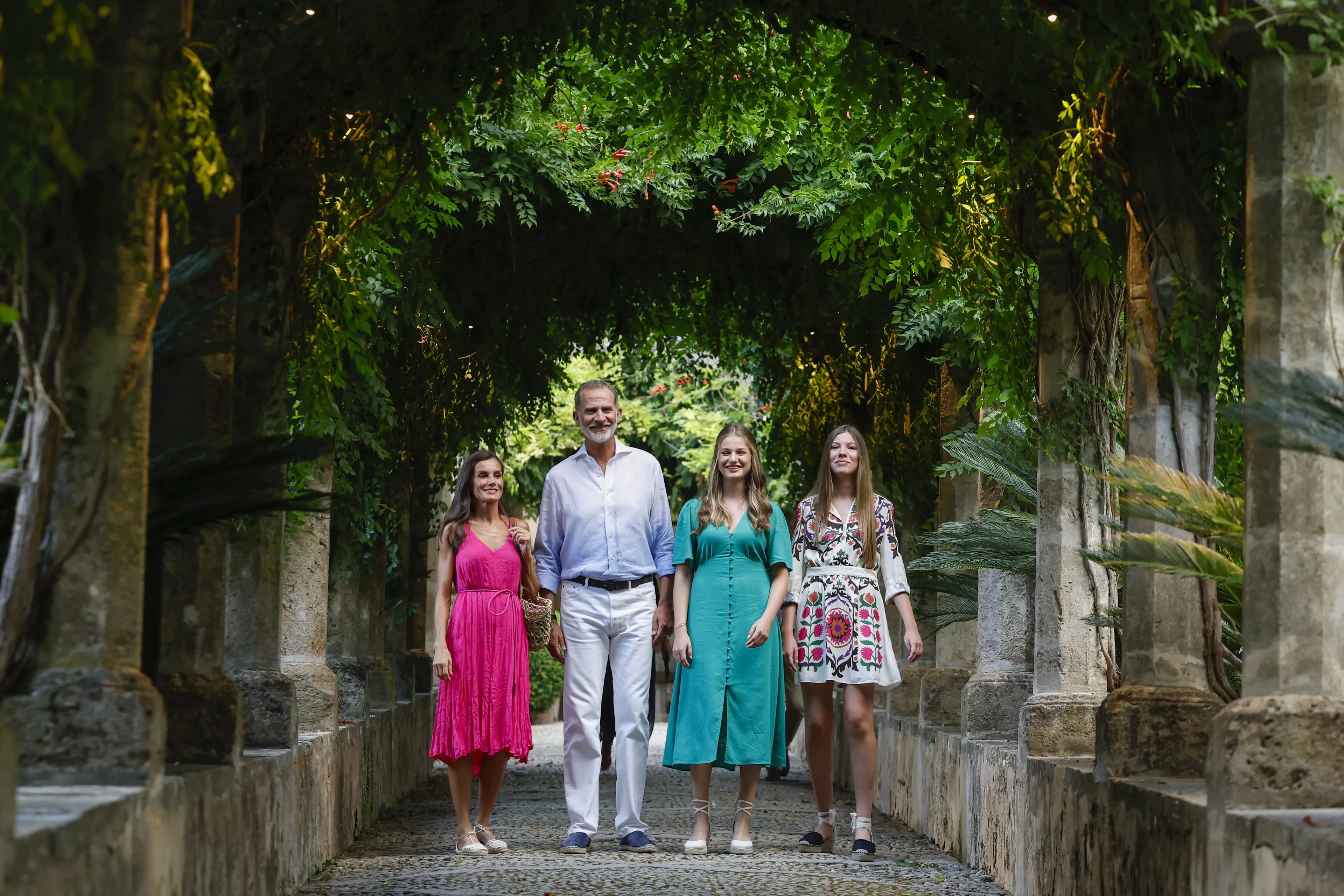 Voor een fotomoment op Mallorca trekt de Spaanse koningin een knalroze zomerjurk van Adolfo Domínguez uit de kast.