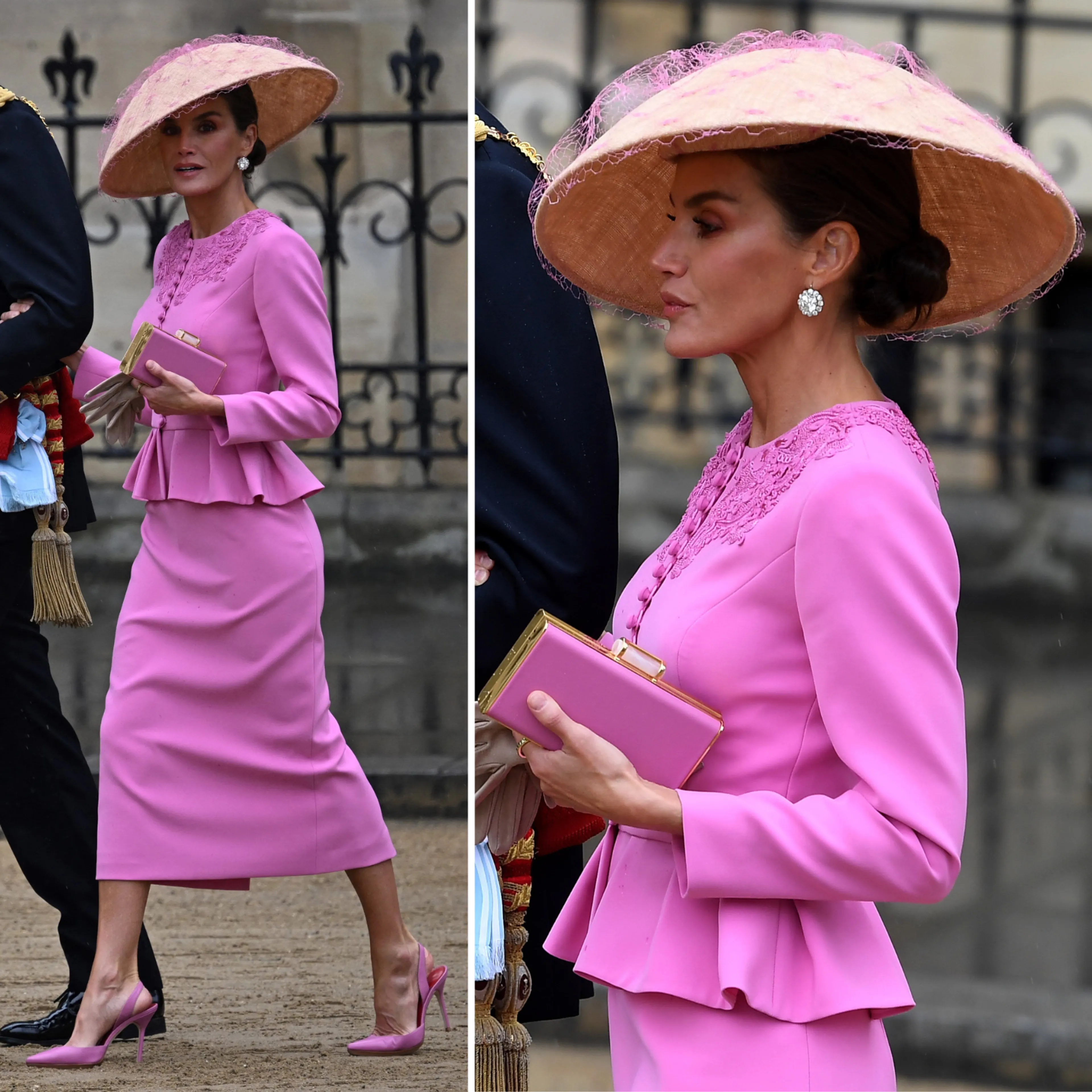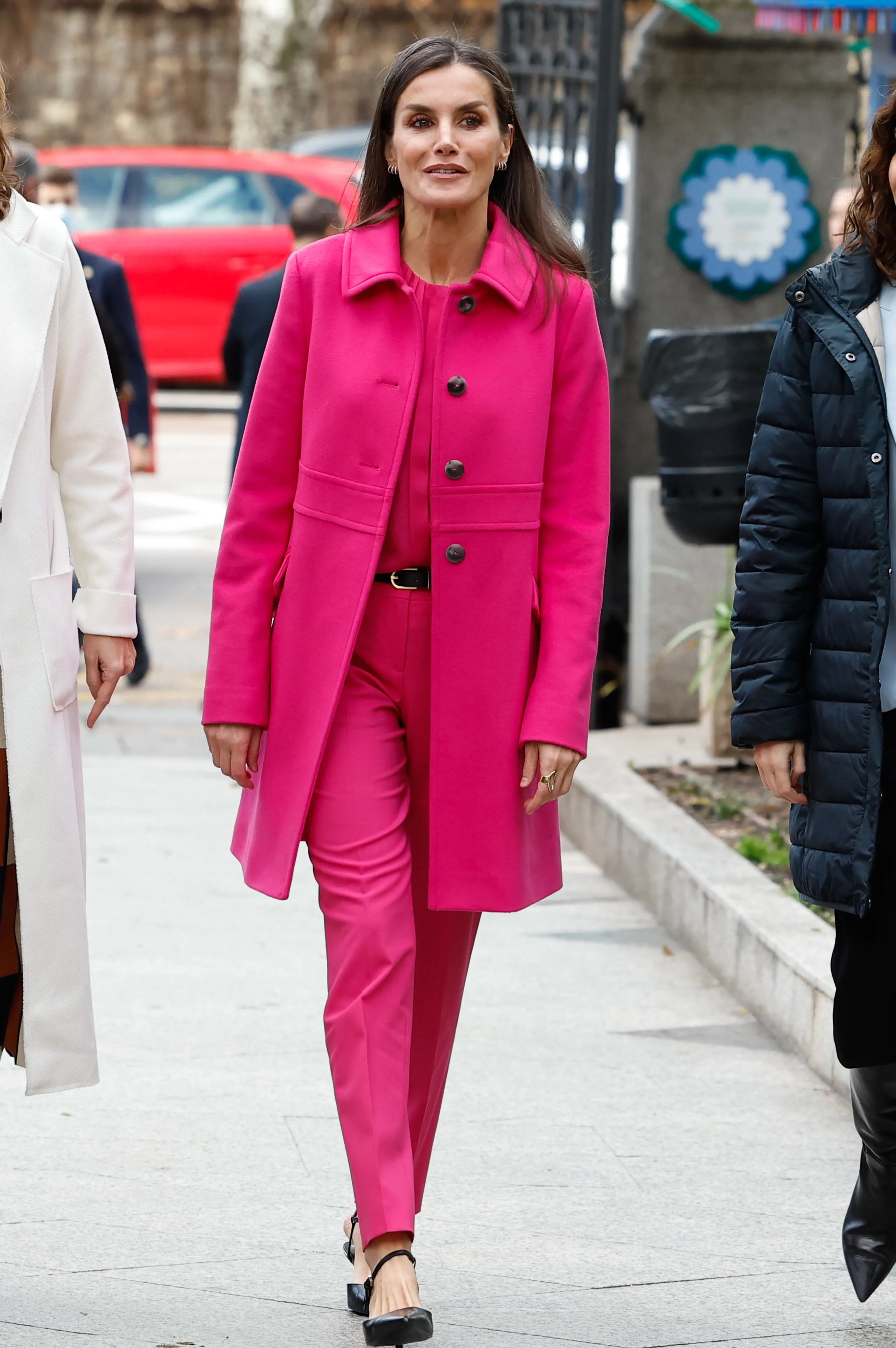 Hier verschijnt Letizia in een fuchsia-roze blousejurk die zowel luchtig als gekleed is. Aan haar voeten pronken zuurstokroze hakken.