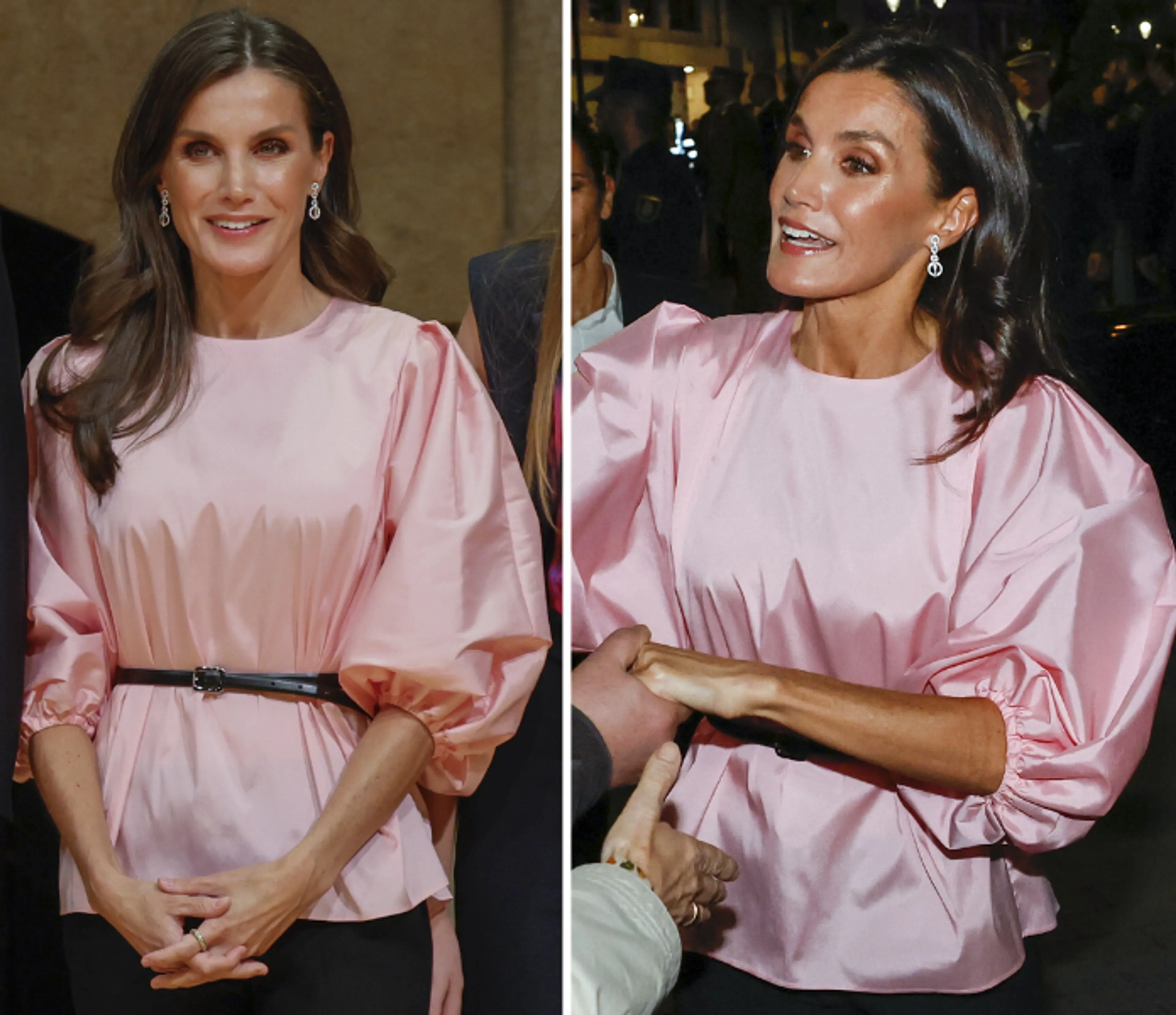 Op de vooravond van de uitreiking van de Prinses van Asturiëprijzen kleedt Letizia zich in een roze blouse met pofmouwen. Het kledingstuk is ontworpen door Maria Barragan.