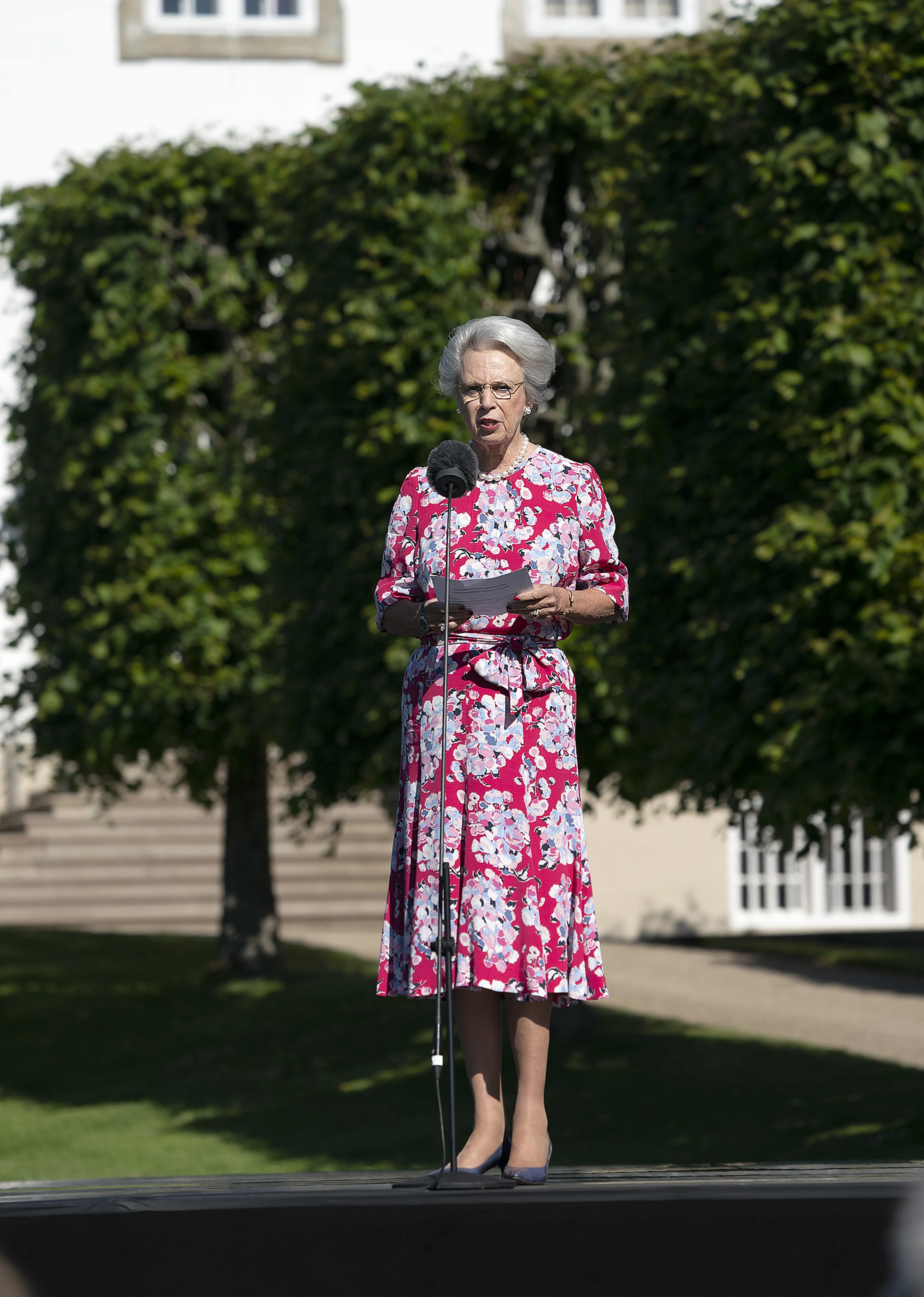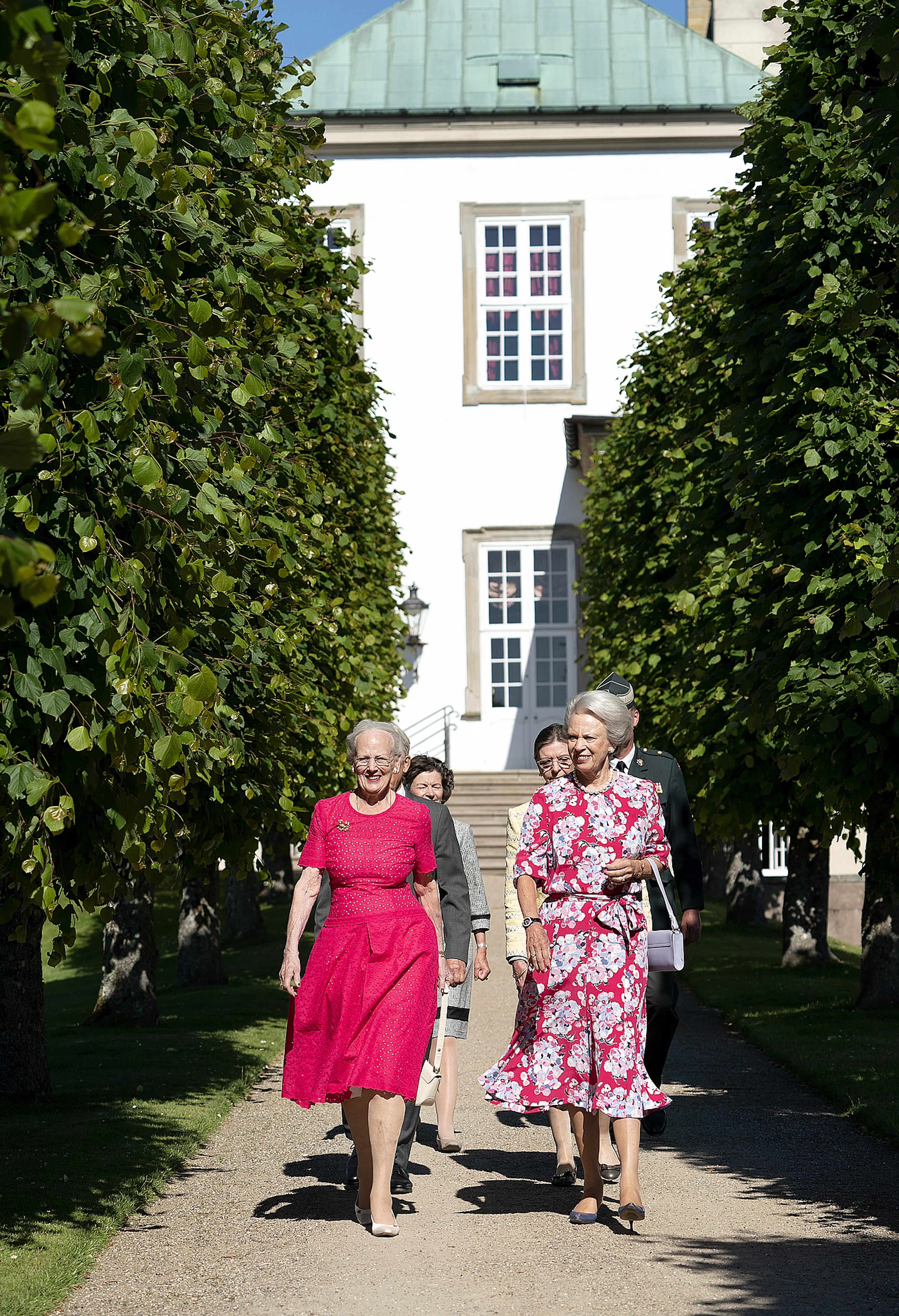 Prinses Benedikte, de middelste van de drie koninklijke zussen, was wel aanwezig in de tuin van Fredensborg Slot voor de 'muzikale middag'. Met enig passen en meten konden de geldende afstandsregels in acht gehouden worden.