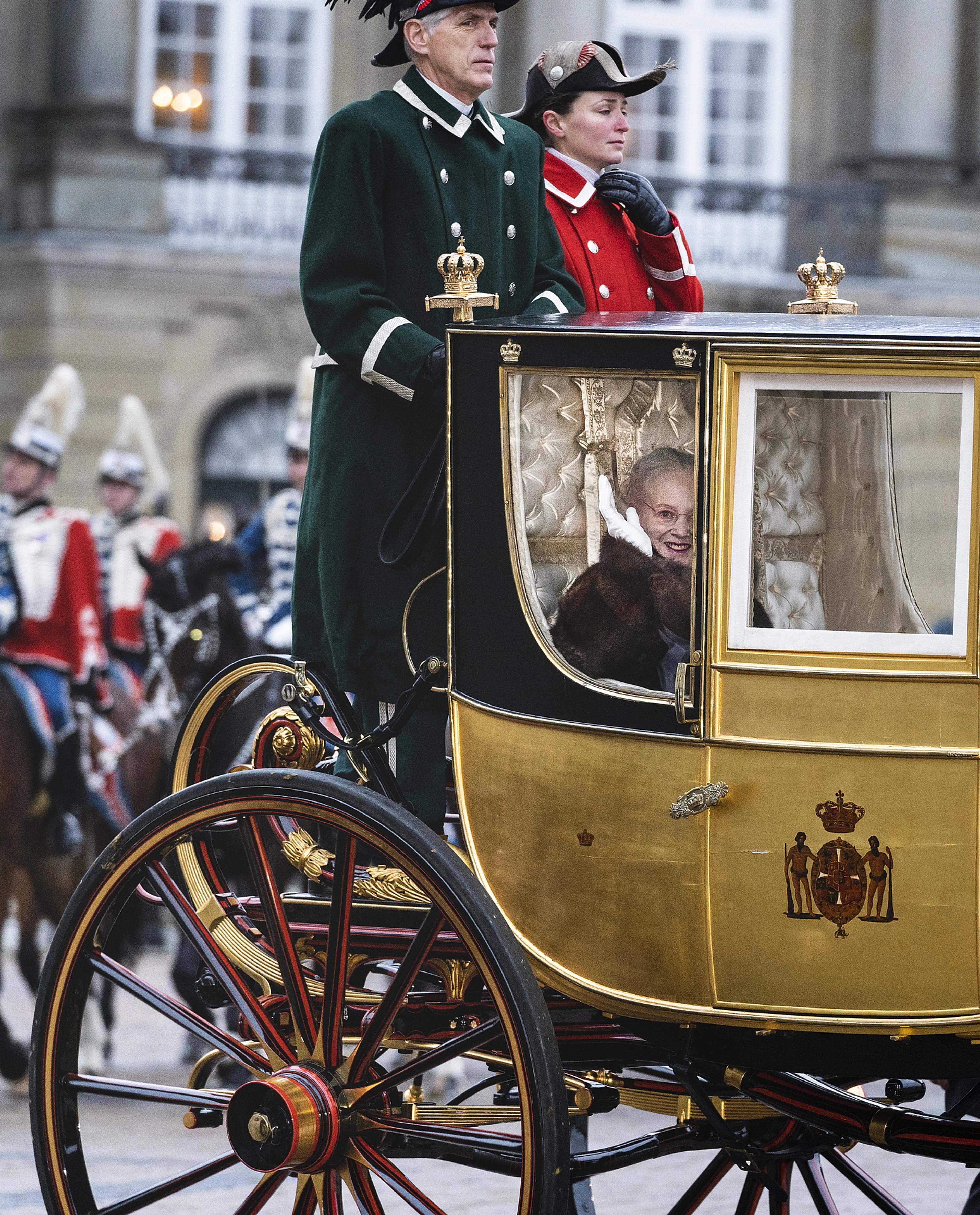 Daarna werd Margrethe weer in de gouden koets teruggereden. De koets is in 1840 gemaakt door de Britse rijtuigbouwer Henry Fife voor de toenmalige koning Christian VIII. De buitenkant is belegd met 24 karaats bladgoud. Het rijtuig is overigens van veel bescheidener omvang dat de Nederlandse gouden koets.