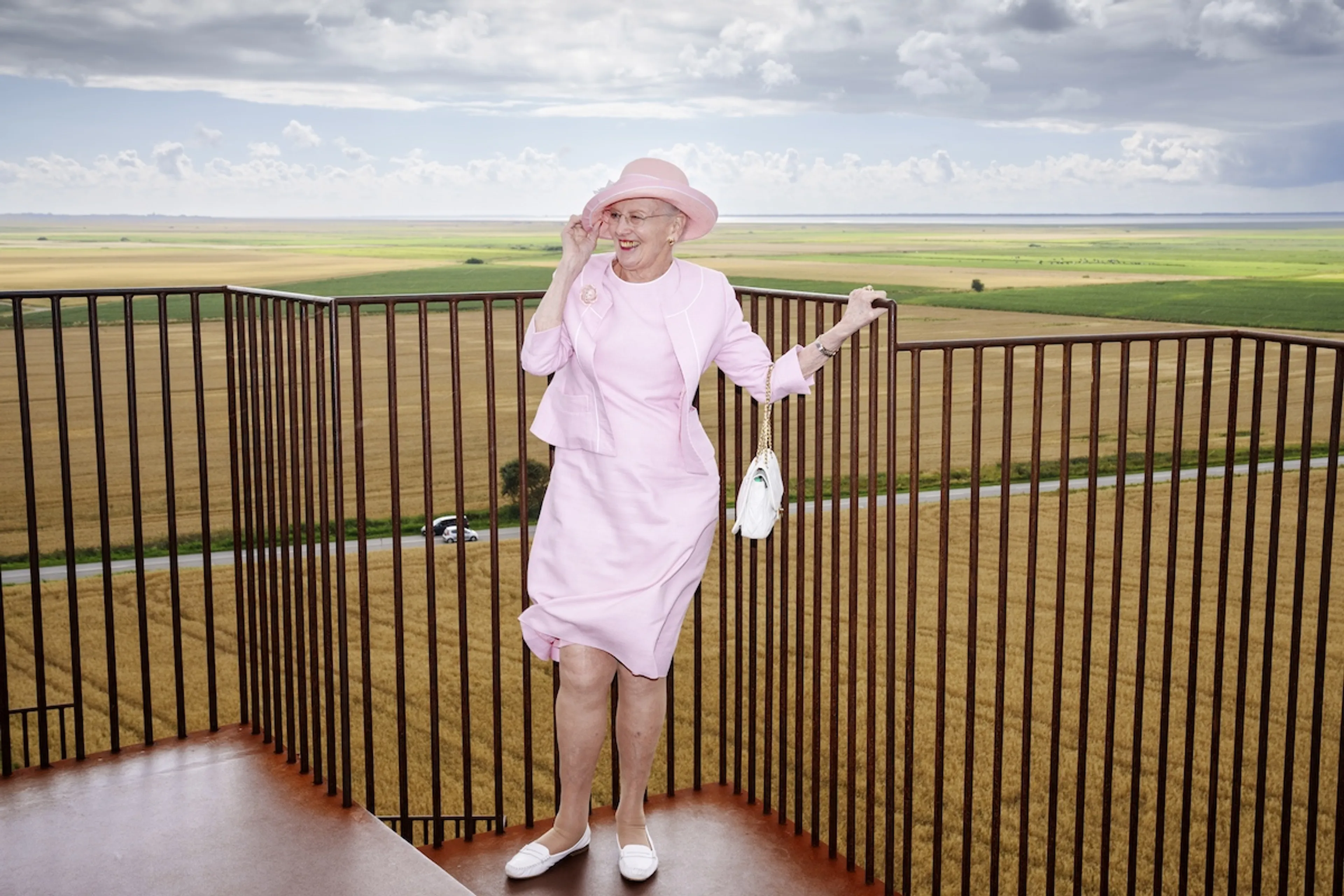 Een van de plekken waar Margrethe langsging was de 25 meter hoge Marsk-toren in Skærbæk. De koningin moest op de nieuwe toeristische attractie haar hoed goed vasthouden toen ze bij harde wind poseerde voor een foto op de top. Tot overmaat van ramp ging het op dat moment ook nog eens regenen.